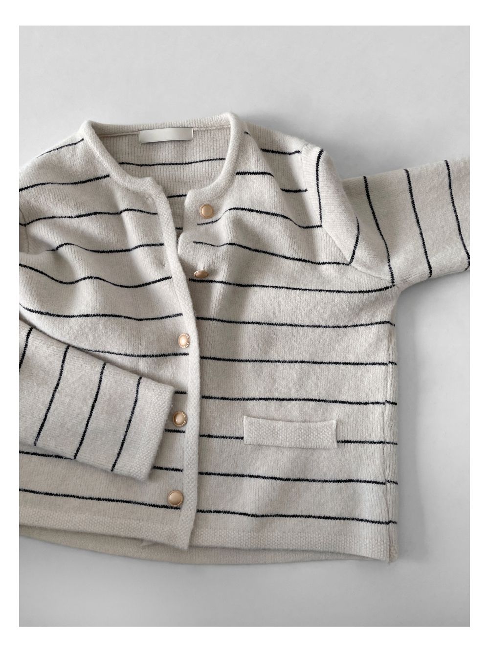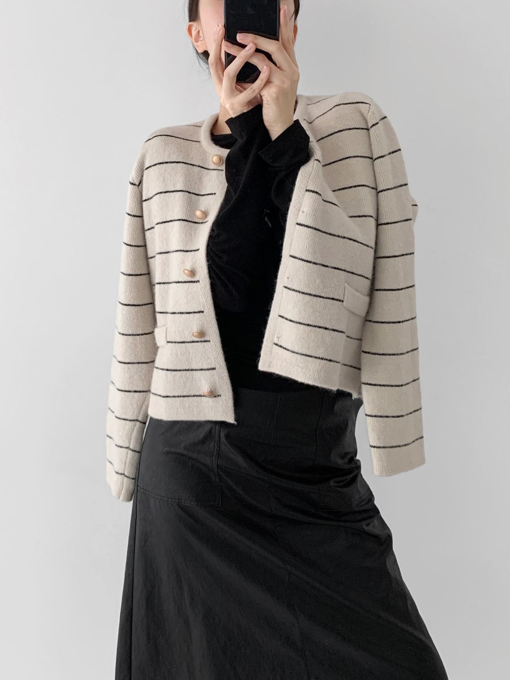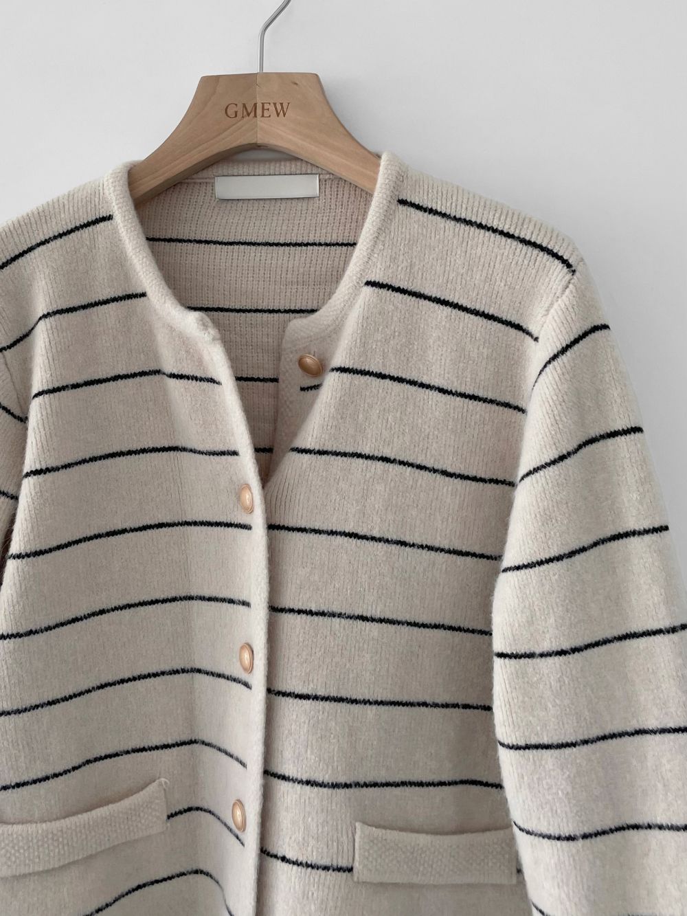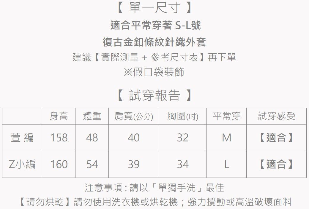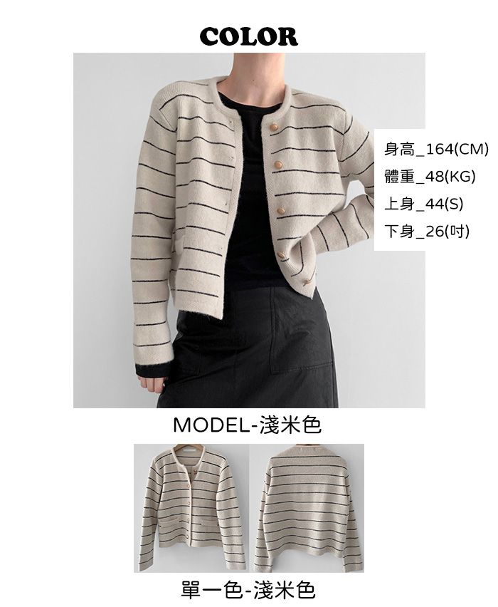 休閒居家渡假婚禮OL上班族配色條紋針織外套復古金釦加厚滾邊圓領假口袋長袖針織衫開襟衫淺米色