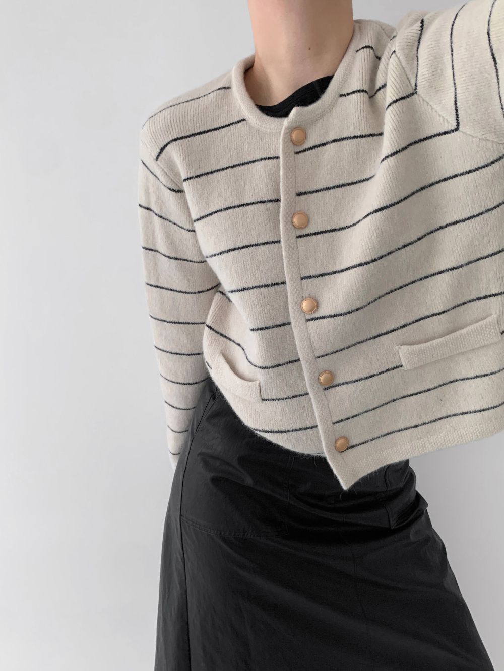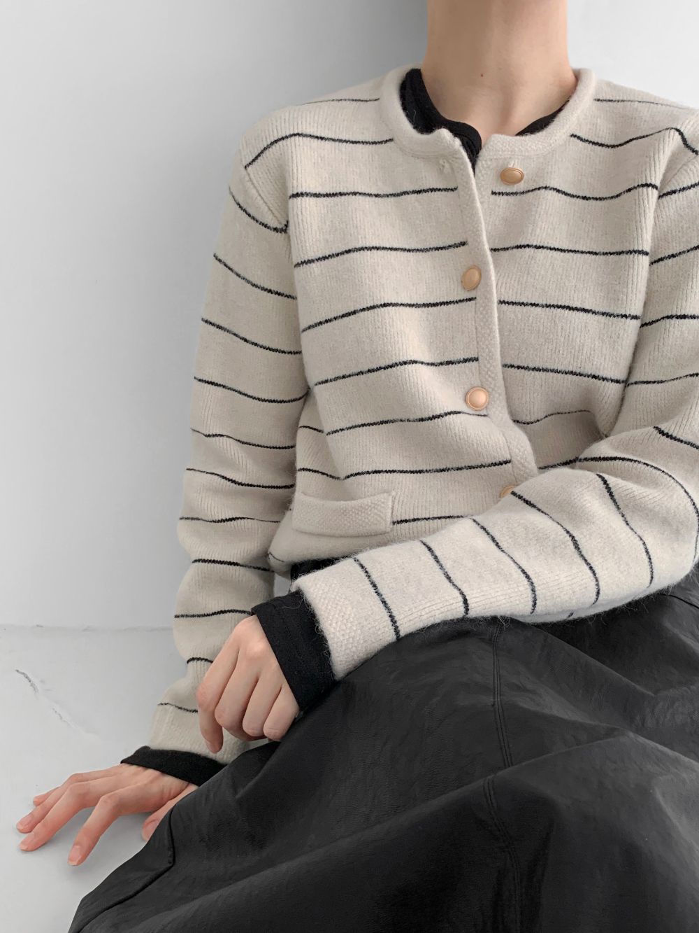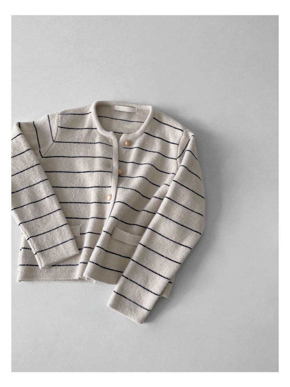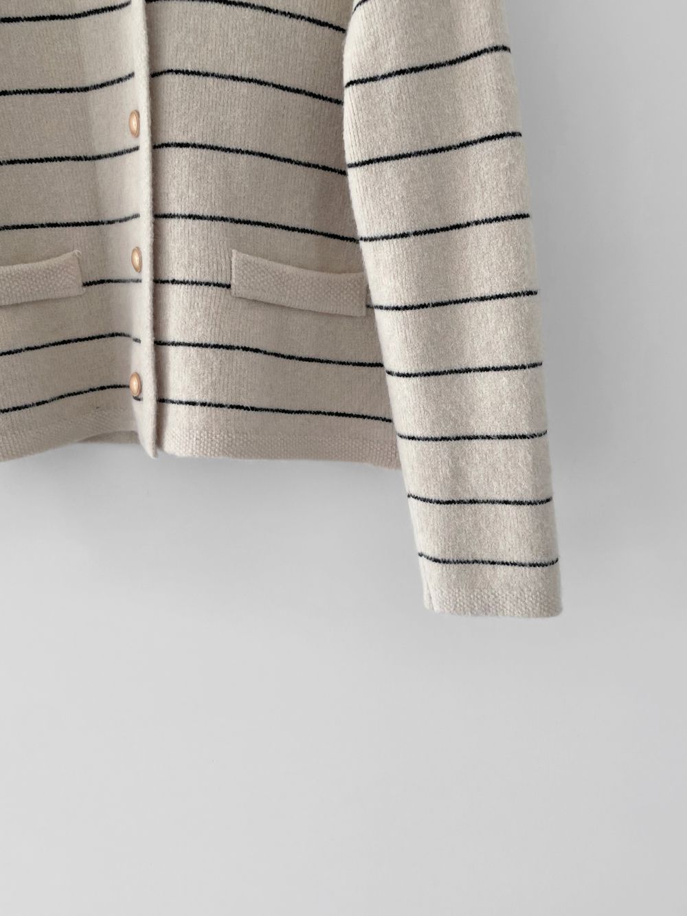 休閒居家渡假婚禮OL上班族配色條紋針織外套復古金釦加厚滾邊圓領假口袋長袖針織衫開襟衫淺米色