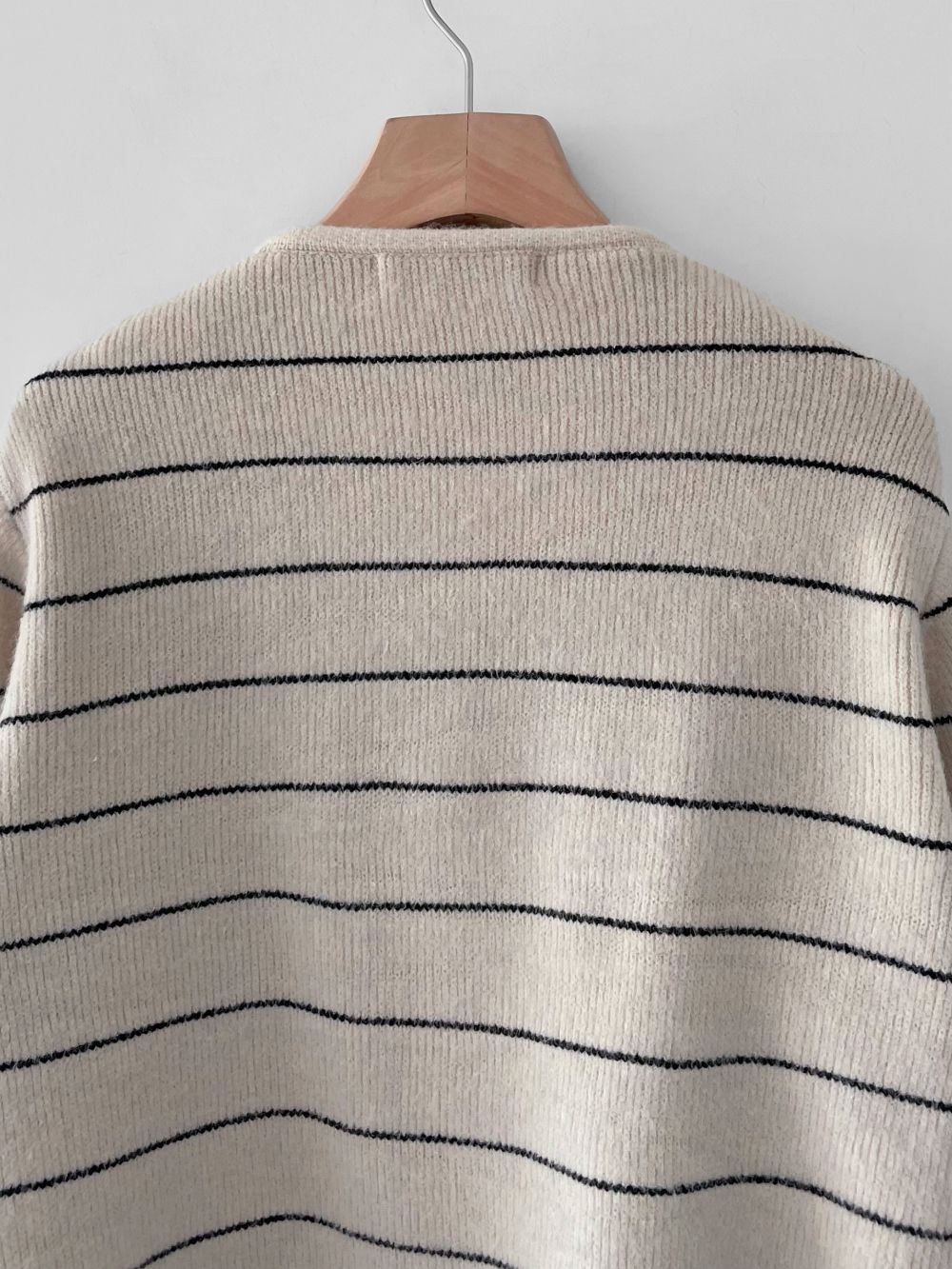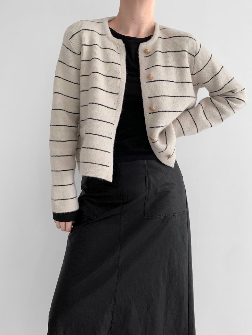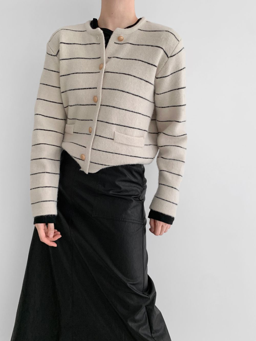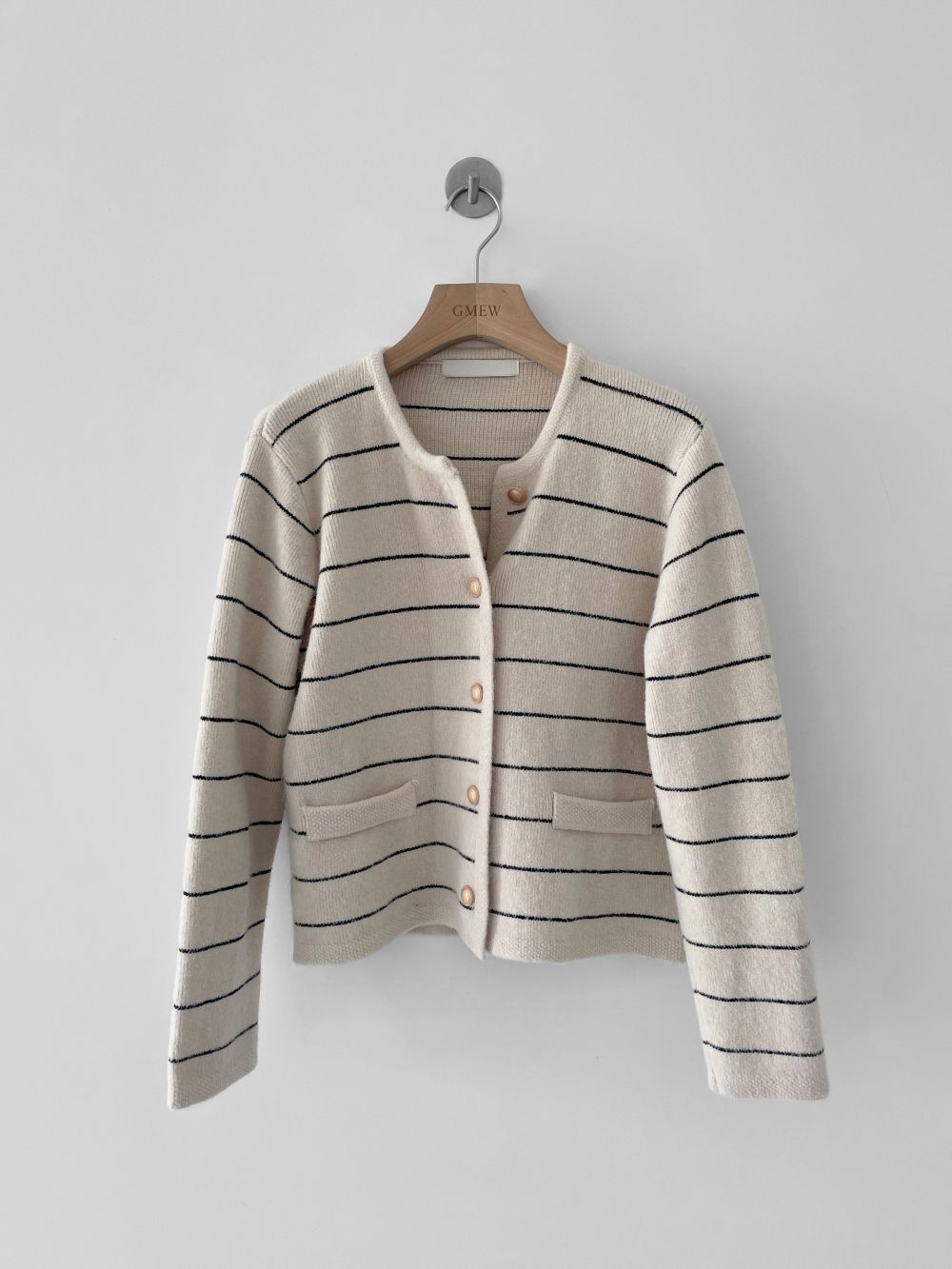 休閒居家渡假婚禮OL上班族配色條紋針織外套復古金釦加厚滾邊圓領假口袋長袖針織衫開襟衫淺米色