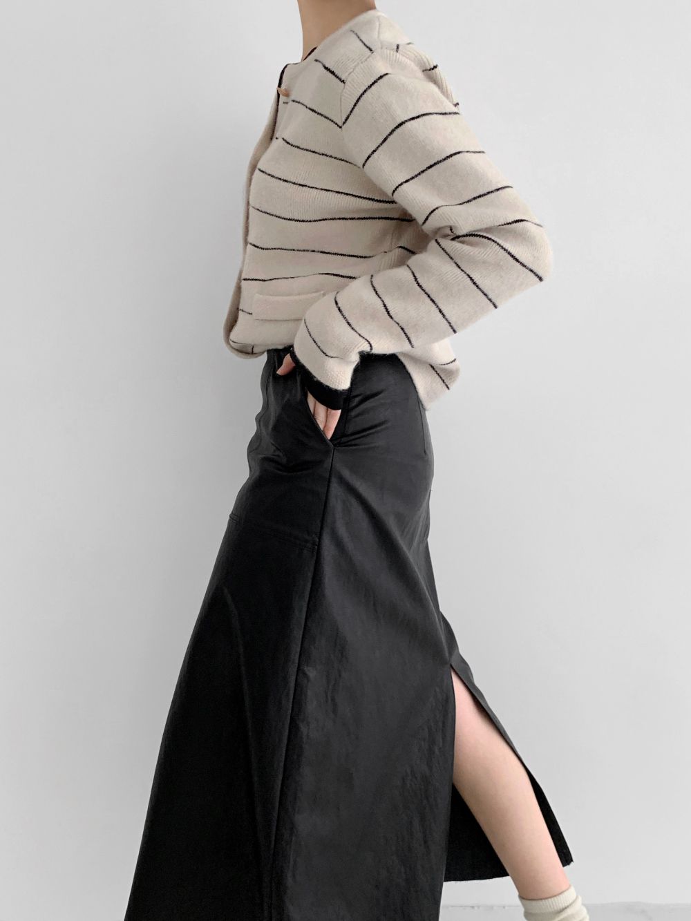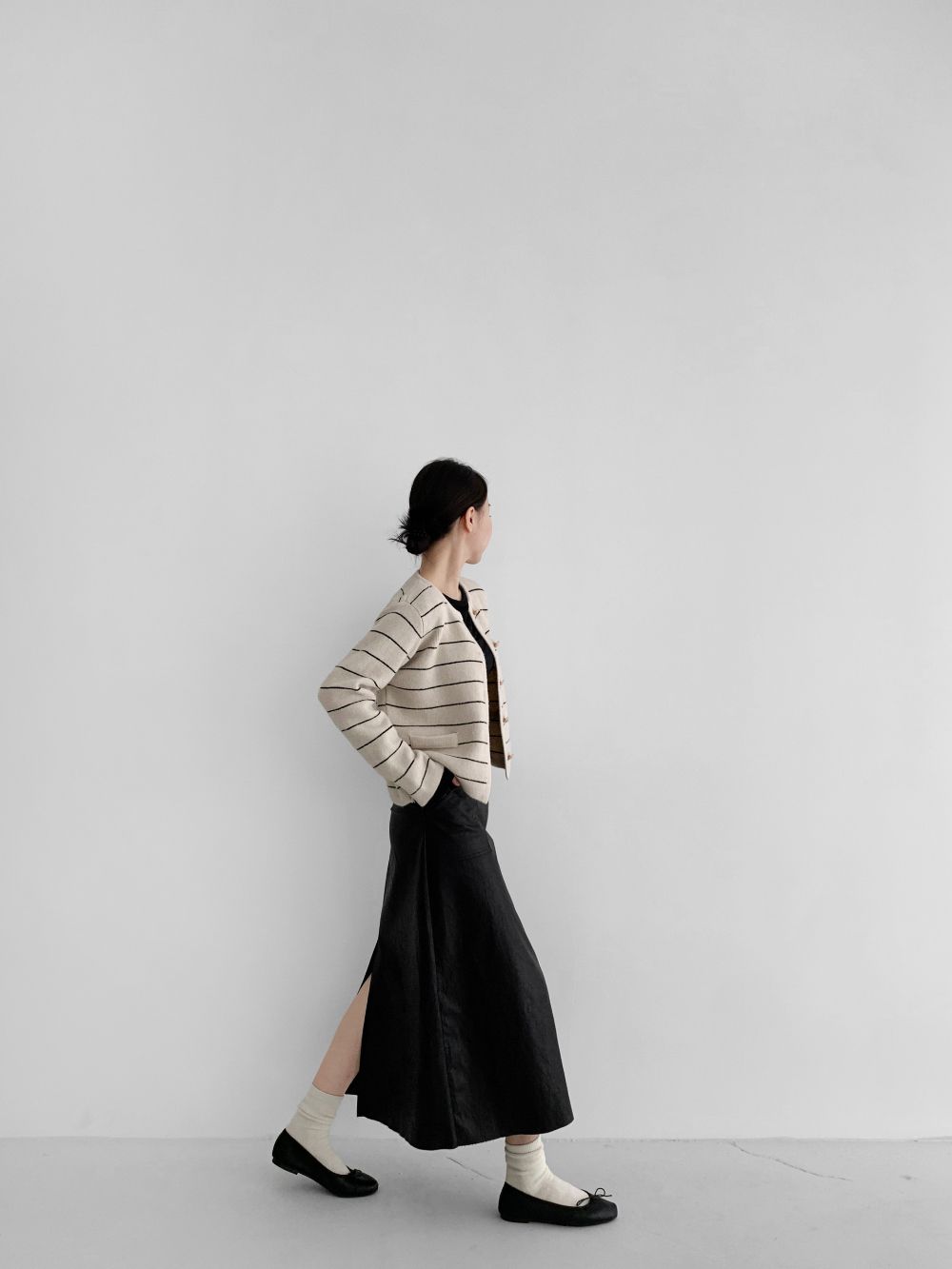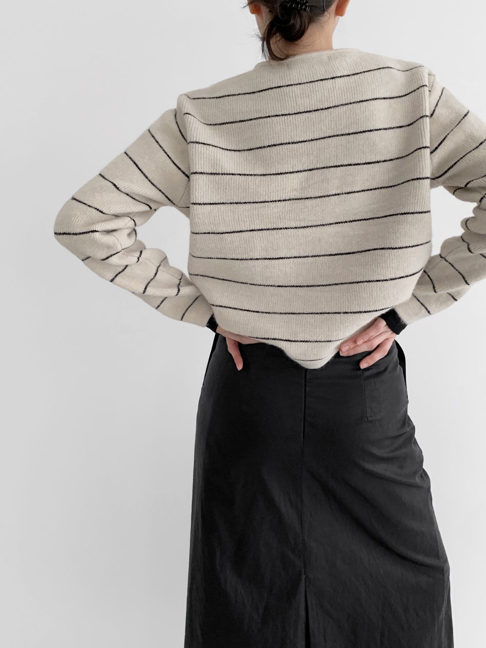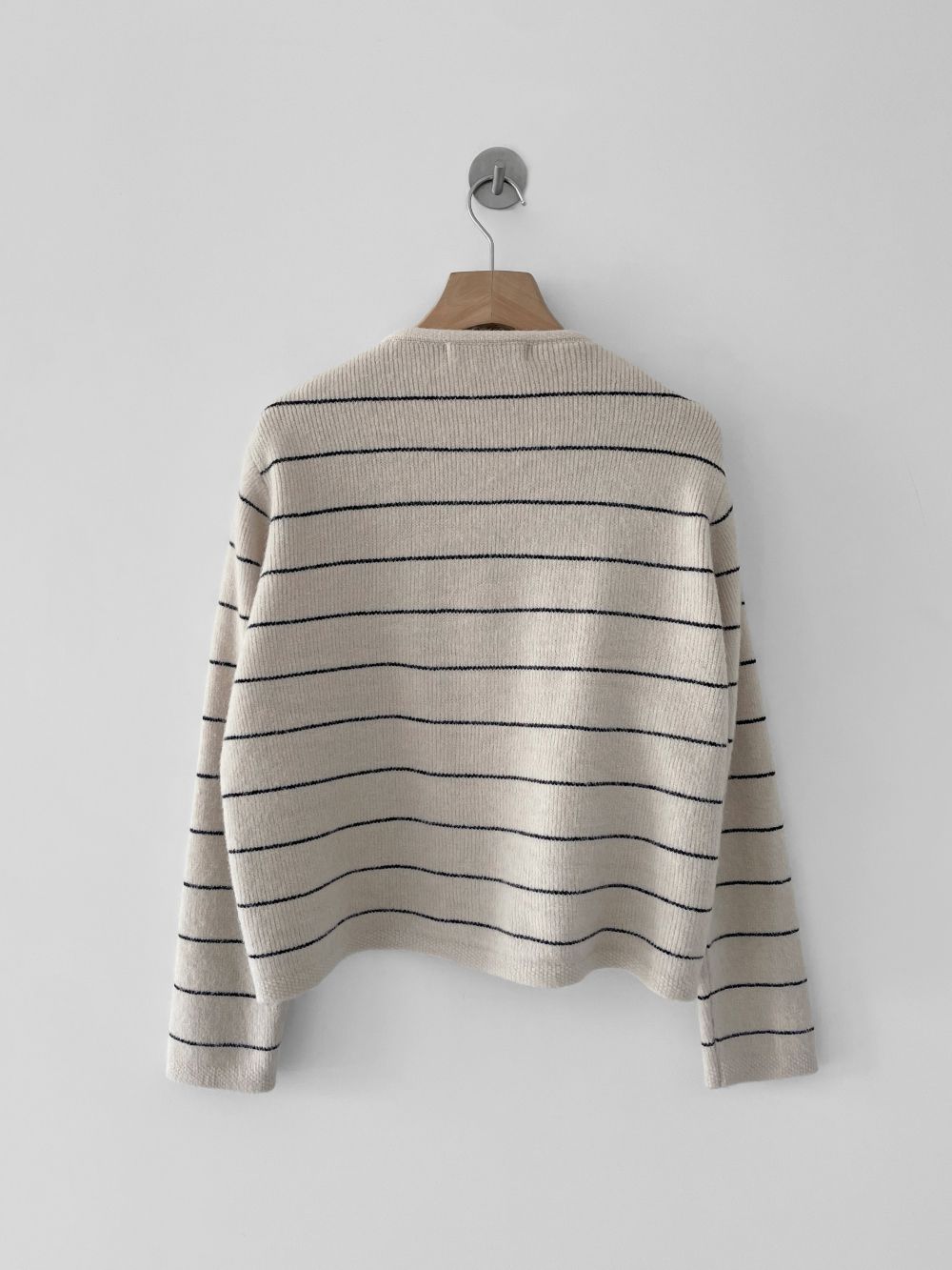 休閒居家渡假婚禮OL上班族配色條紋針織外套復古金釦加厚滾邊圓領假口袋長袖針織衫開襟衫淺米色