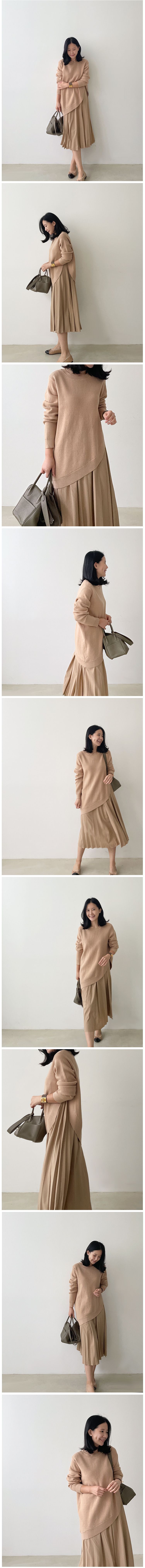 【C51404】韓國STN 假兩件針織洋裝-婚禮素面圓領斜衩拼接百褶裙長袖