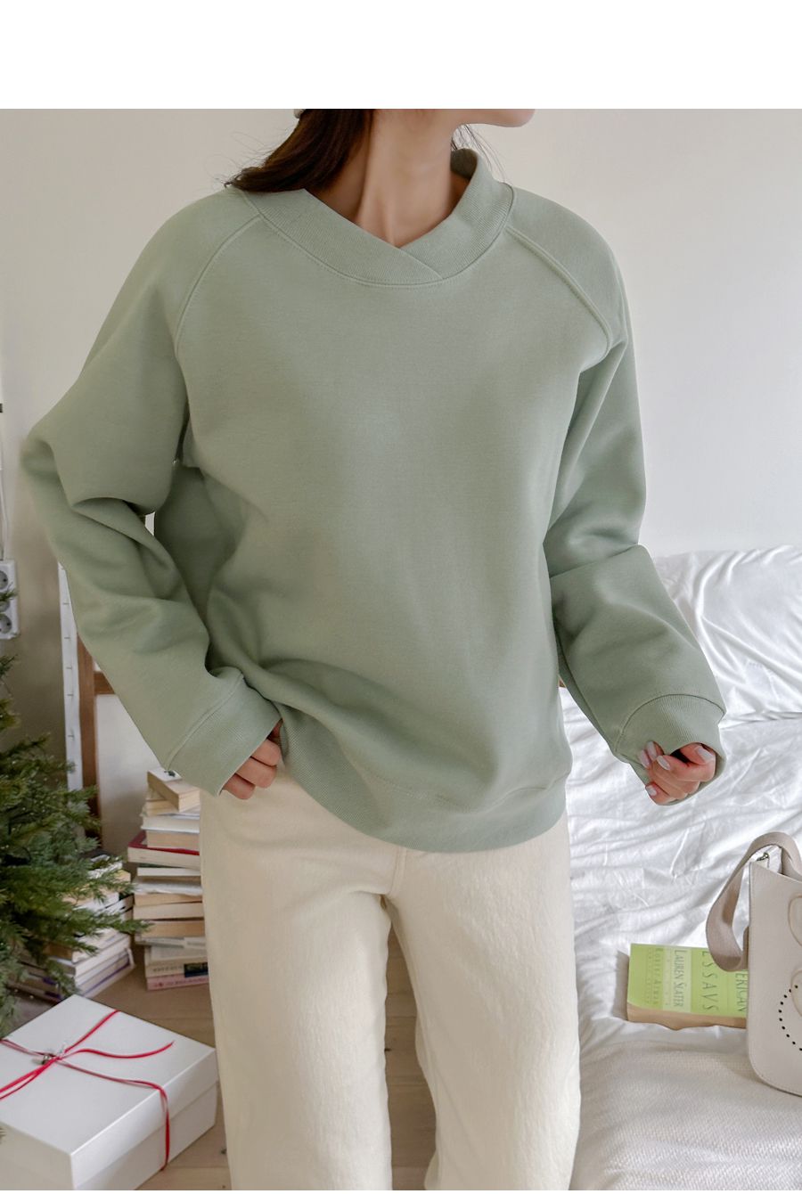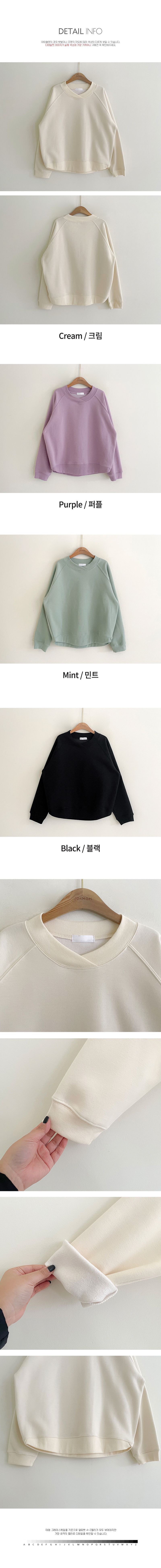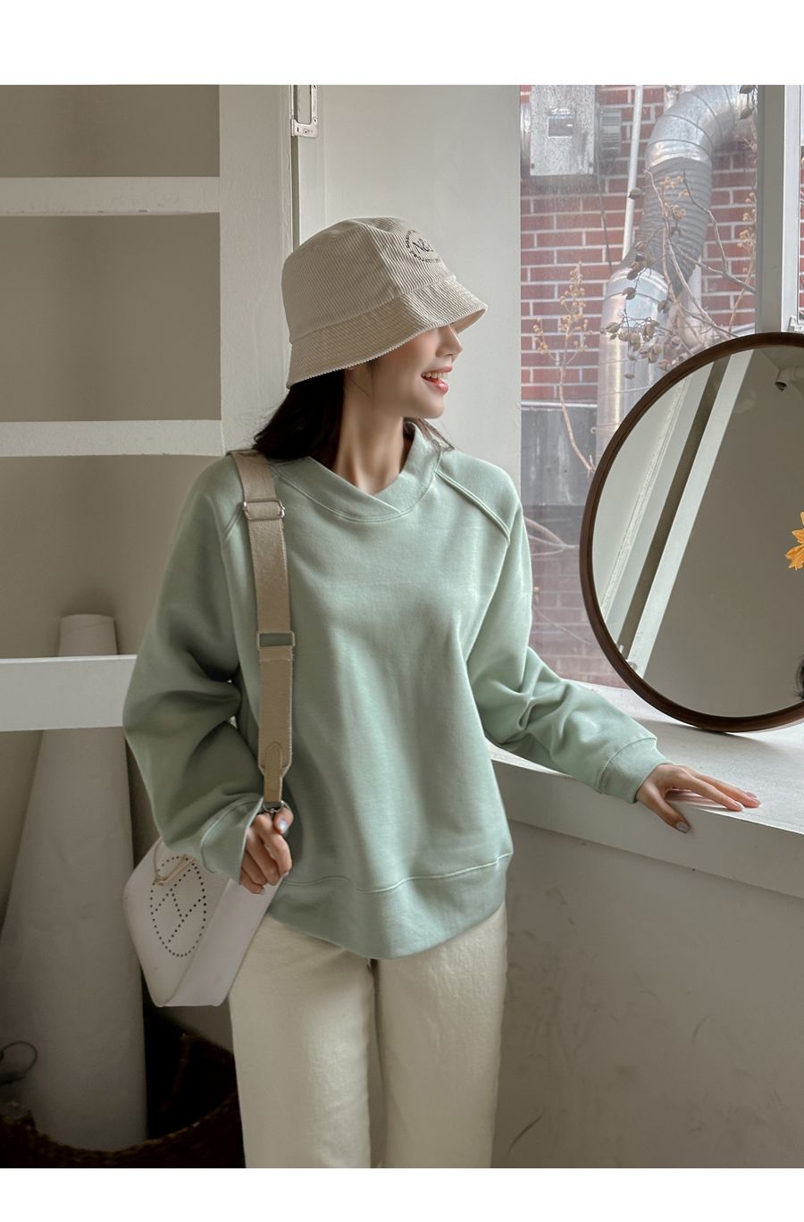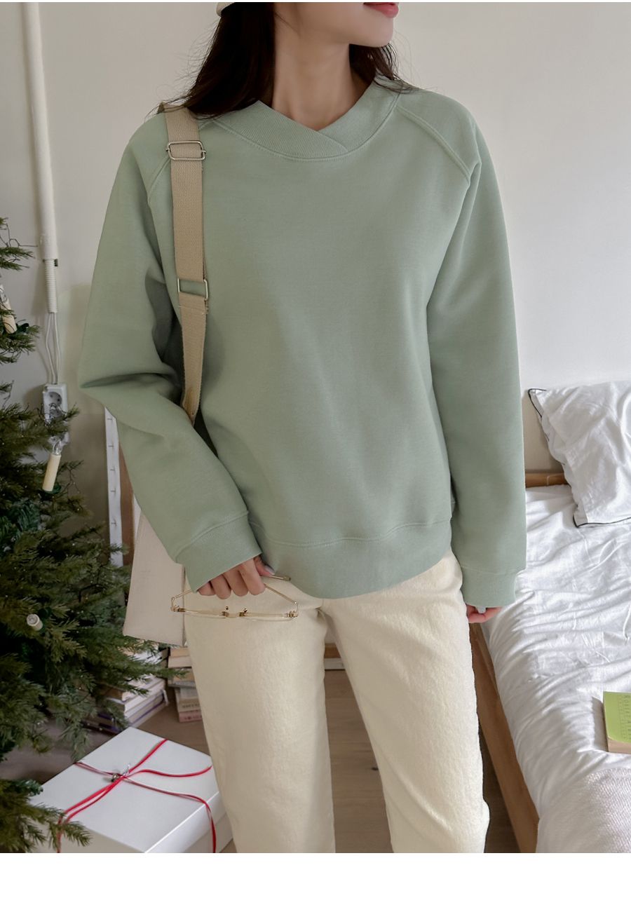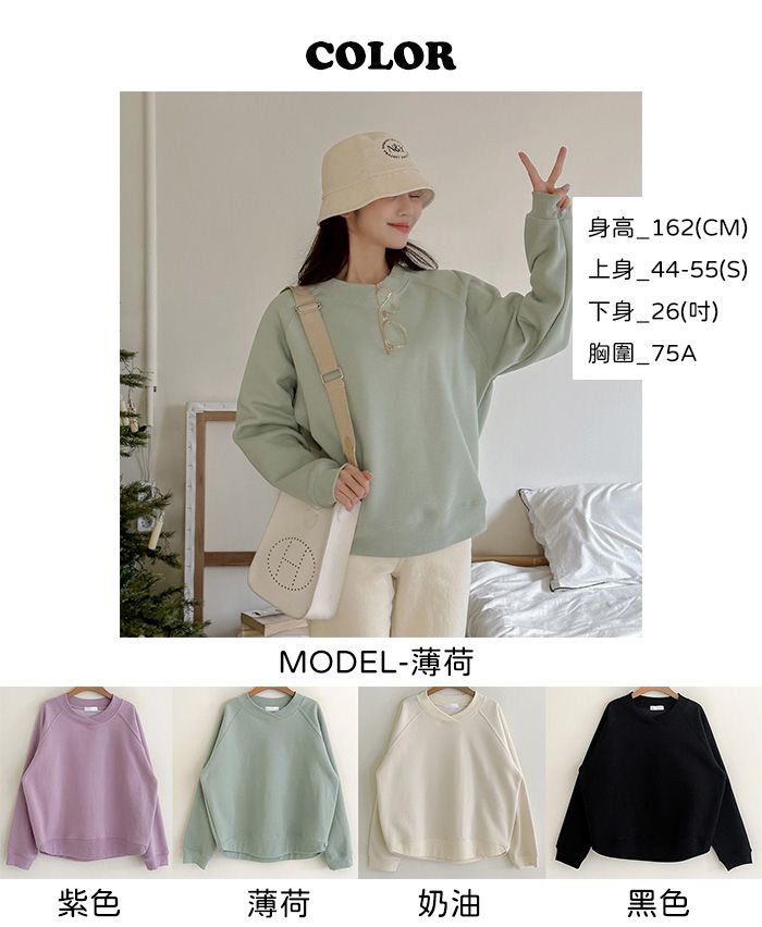 交叉領圍/保暖內刷毛/圓弧下襬/寬鬆版型 - 休閒居家OL上班族簡約百搭素面交叉圓領上衣保暖內刷毛內磨毛弧形下襬側開衩側衩連肩袖連袖長袖上衣T恤TEE素T紫色薄荷色奶油色黑色寬鬆大尺碼