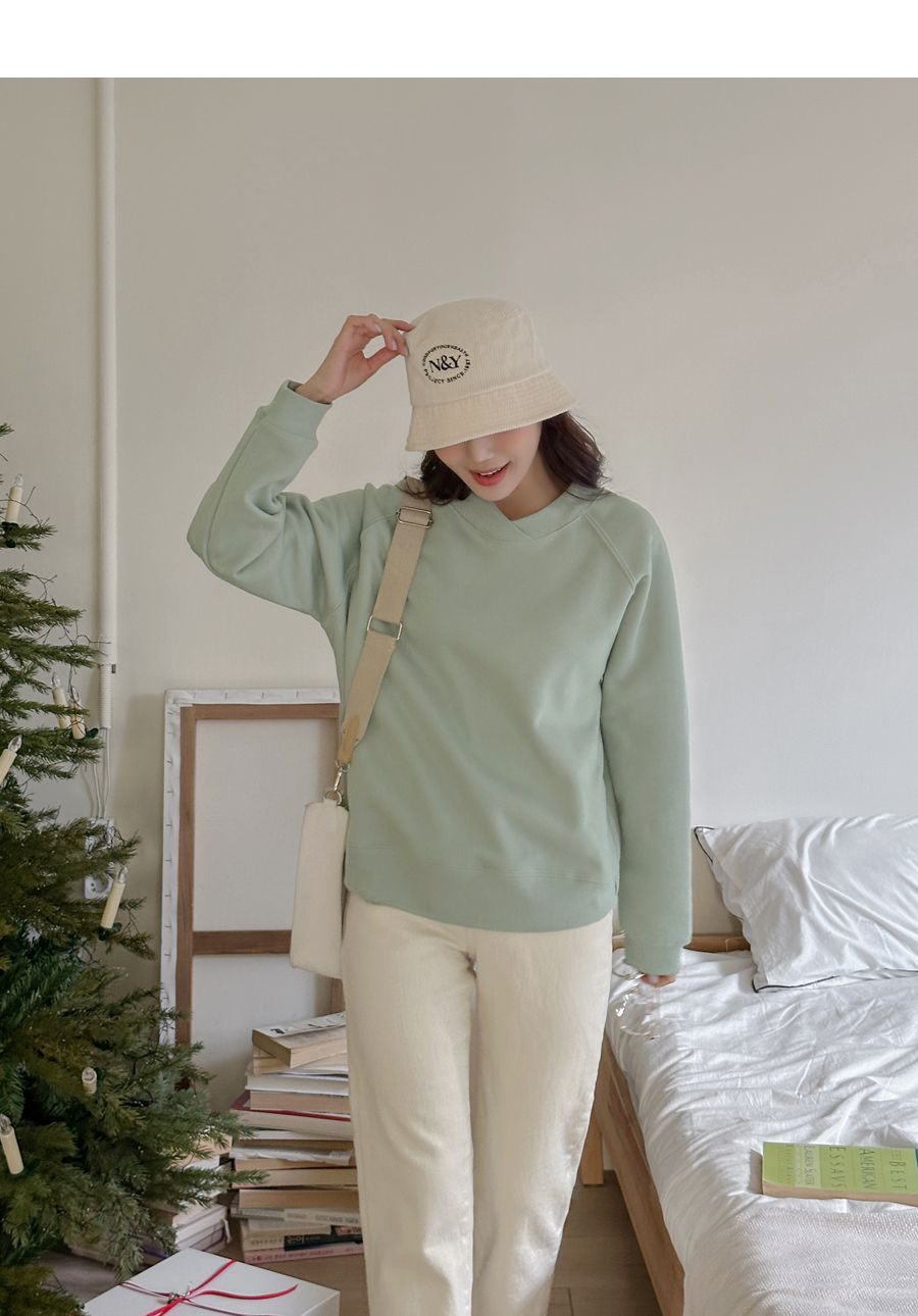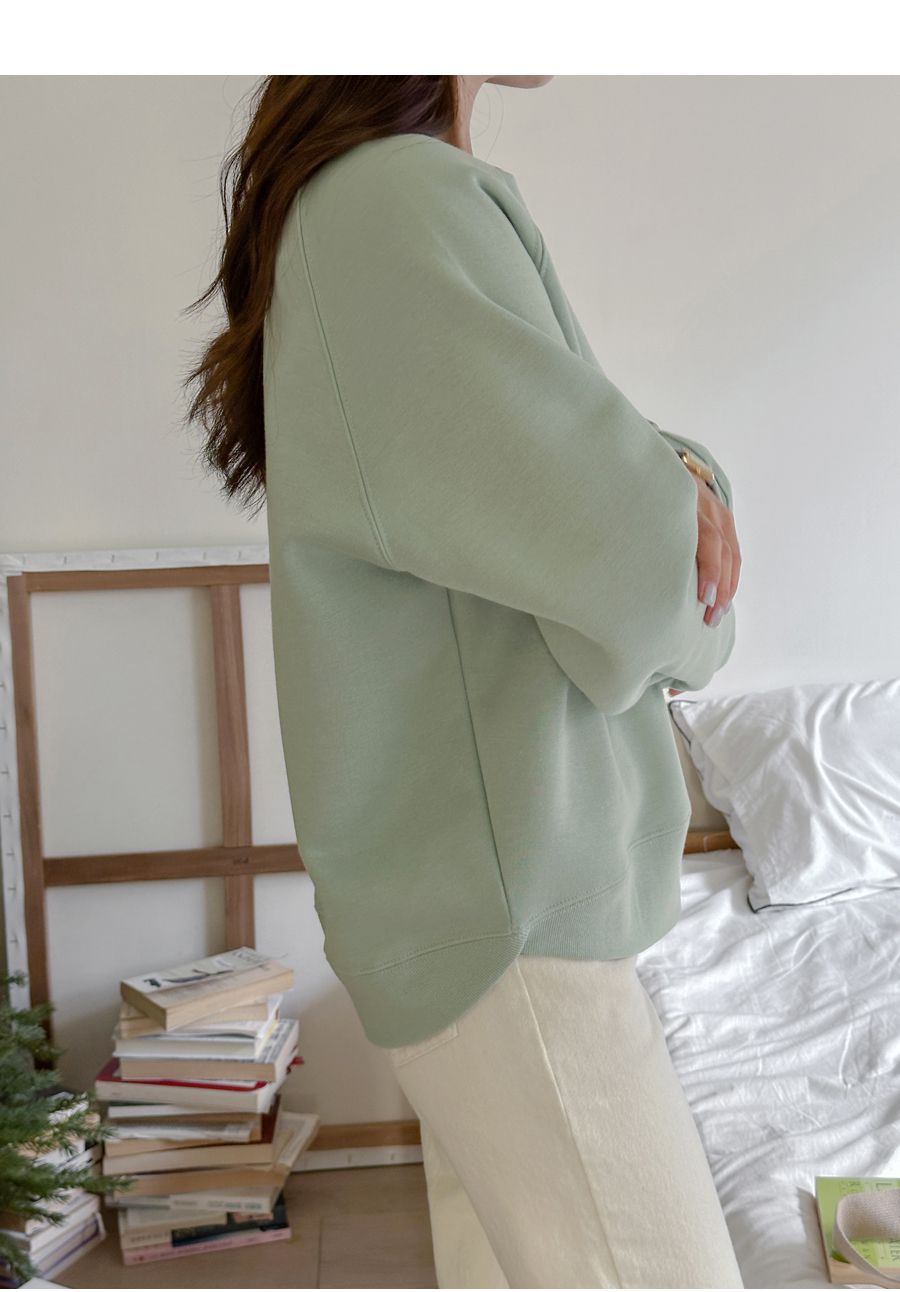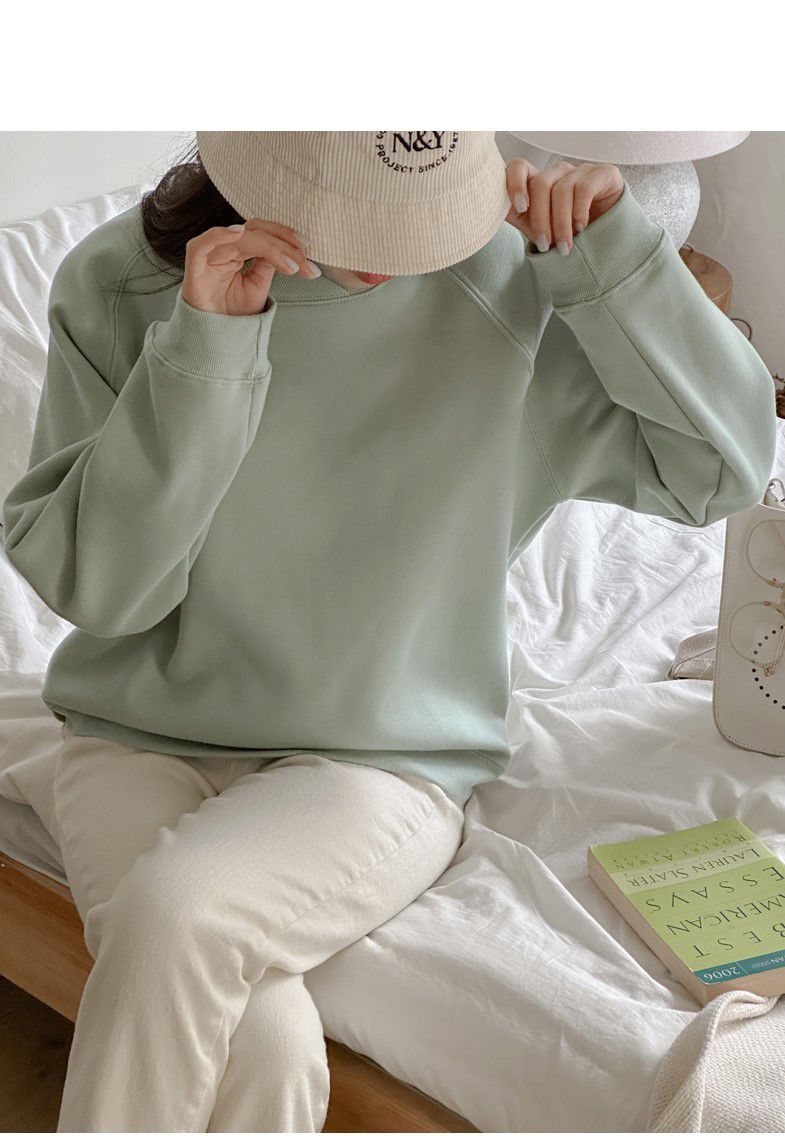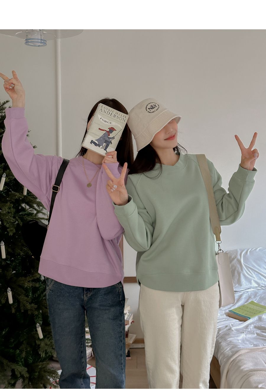 交叉領圍/保暖內刷毛/圓弧下襬/寬鬆版型 - 休閒居家OL上班族簡約百搭素面交叉圓領上衣保暖內刷毛內磨毛弧形下襬側開衩側衩連肩袖連袖長袖上衣T恤TEE素T紫色薄荷色奶油色黑色寬鬆大尺碼