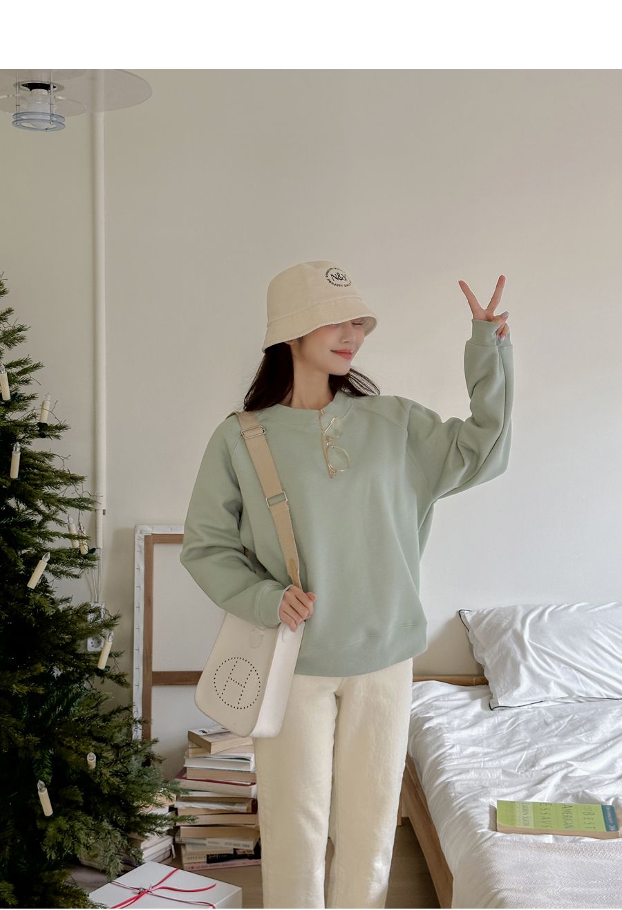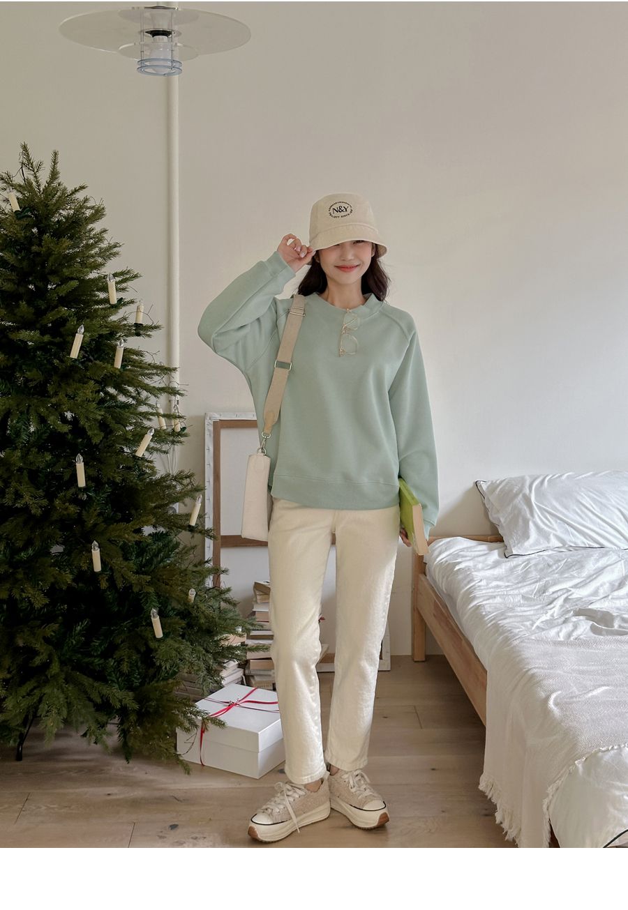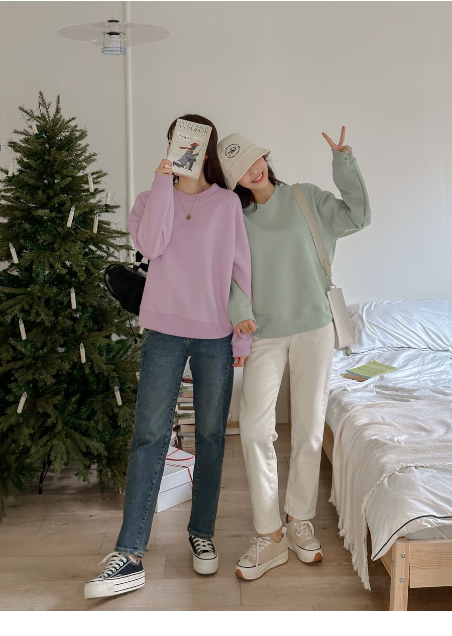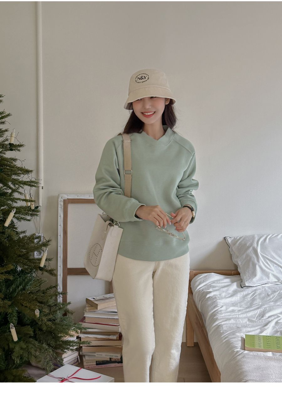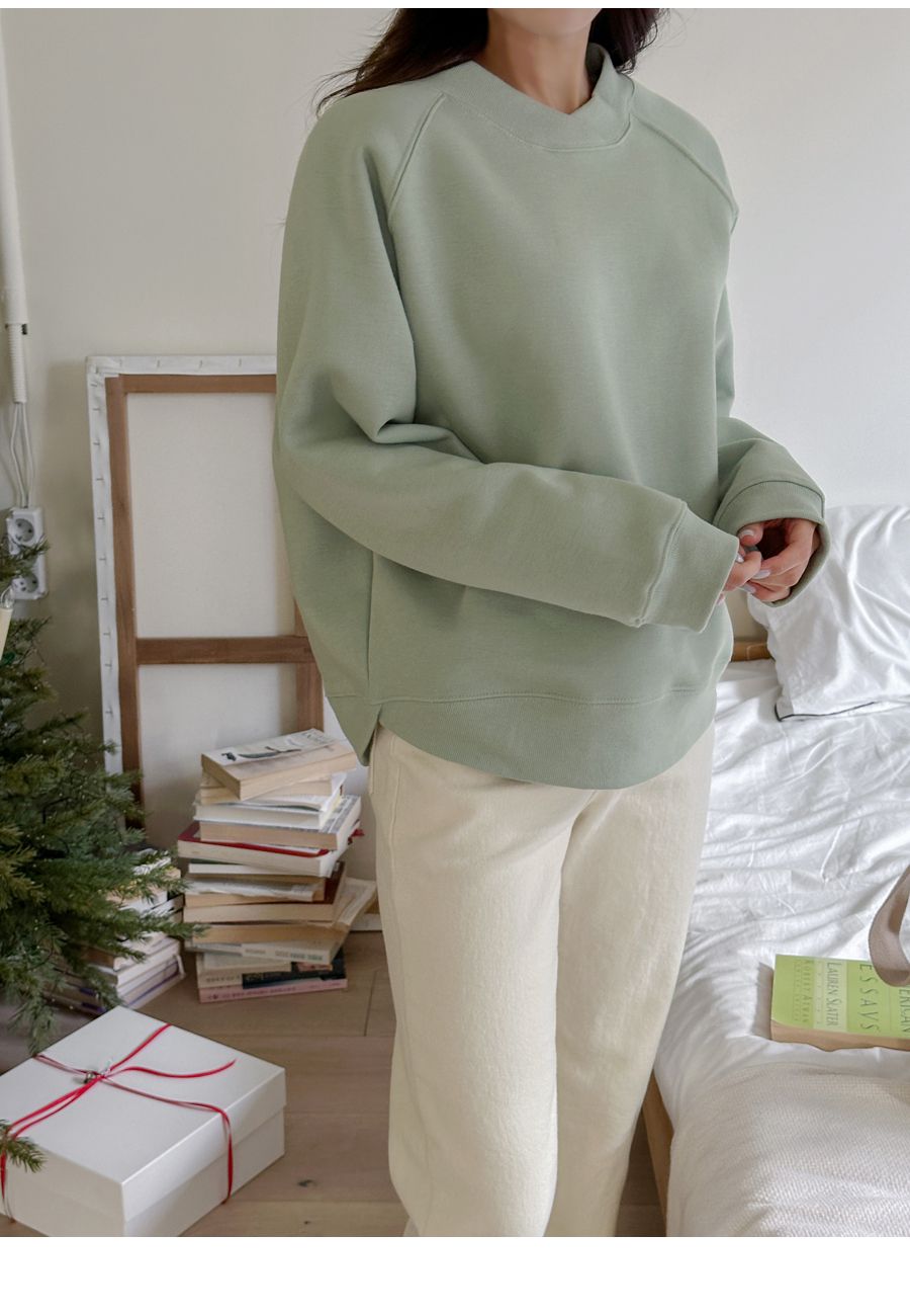 交叉領圍/保暖內刷毛/圓弧下襬/寬鬆版型 - 休閒居家OL上班族簡約百搭素面交叉圓領上衣保暖內刷毛內磨毛弧形下襬側開衩側衩連肩袖連袖長袖上衣T恤TEE素T紫色薄荷色奶油色黑色寬鬆大尺碼
