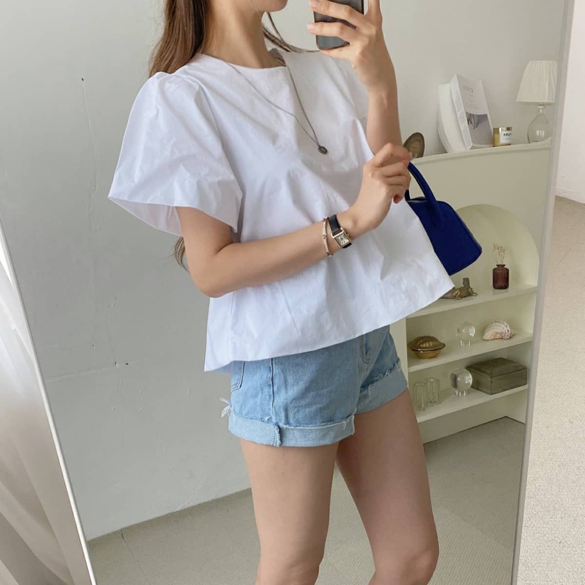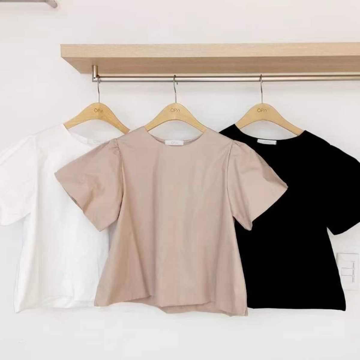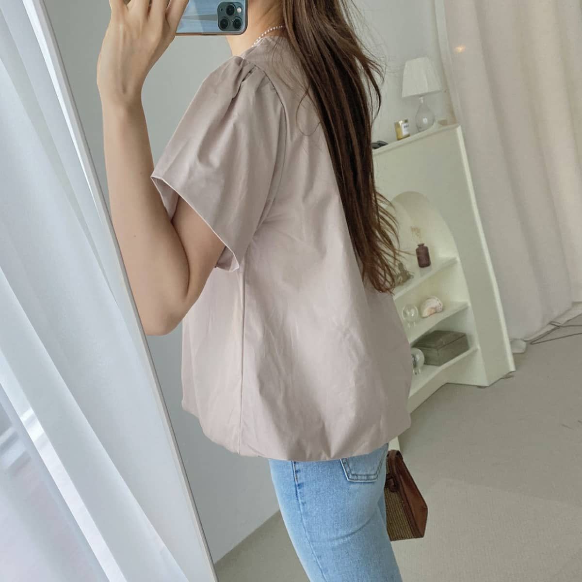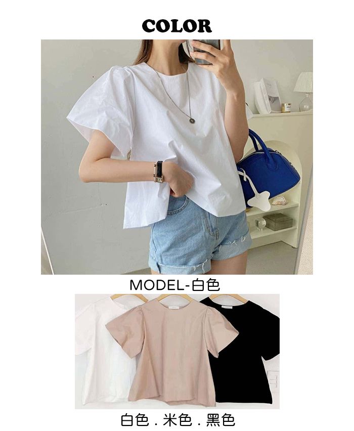 休閒居家渡假婚禮OL上班族簡約百搭素面圓領上衣A字傘狀上衣挺版A字上衣立體雙層澎澎袖泡泡袖鬆緊下襬束口下襬花苞短袖白色米色黑色