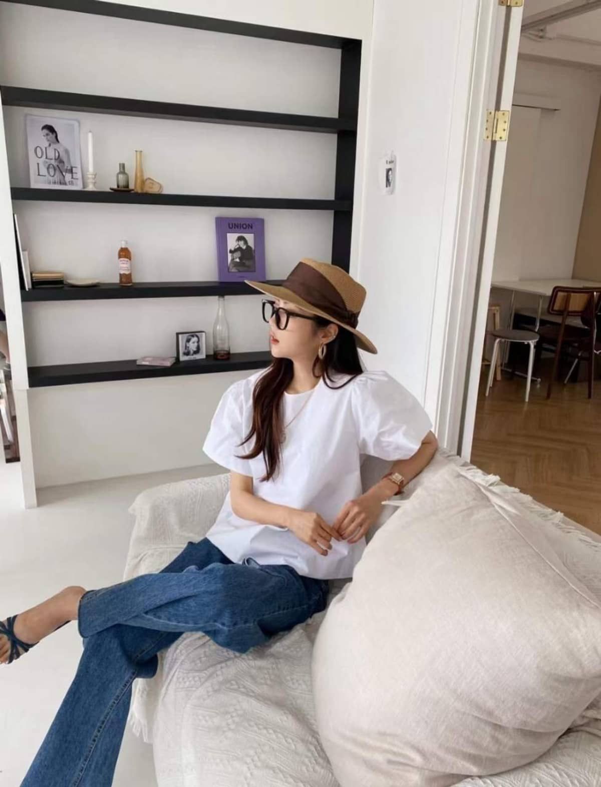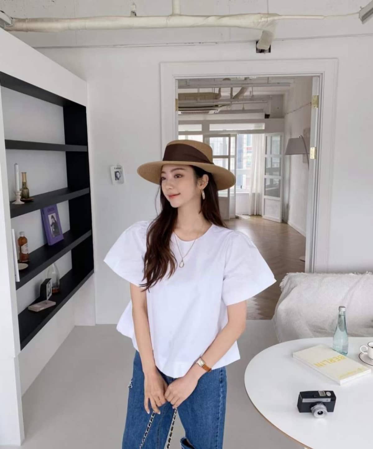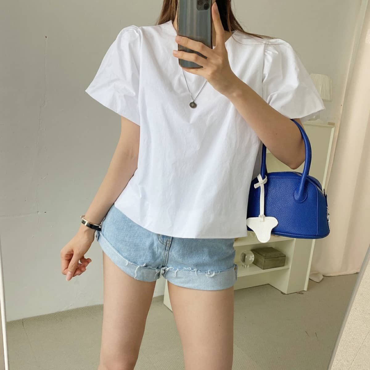 休閒居家渡假婚禮OL上班族簡約百搭素面圓領上衣A字傘狀上衣挺版A字上衣立體雙層澎澎袖泡泡袖鬆緊下襬束口下襬花苞短袖白色米色黑色