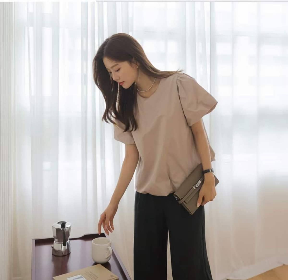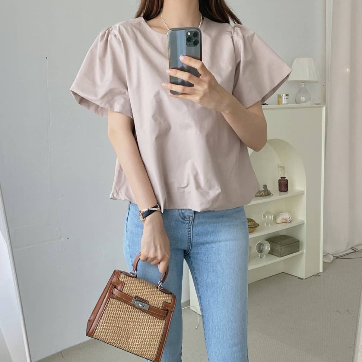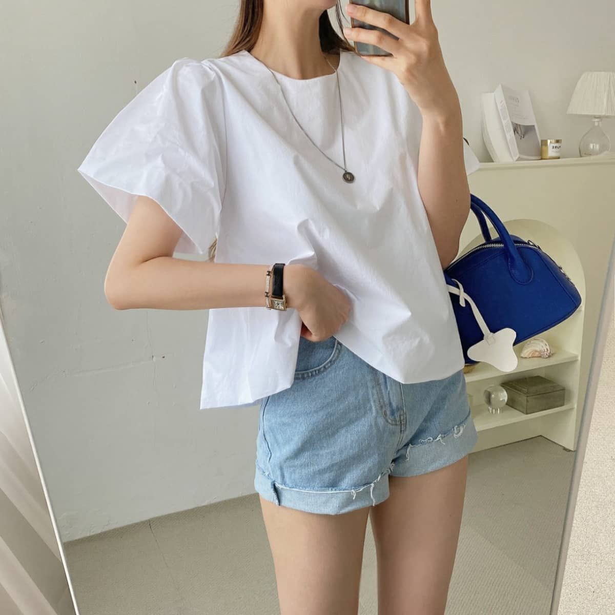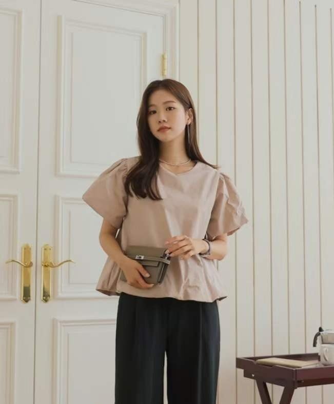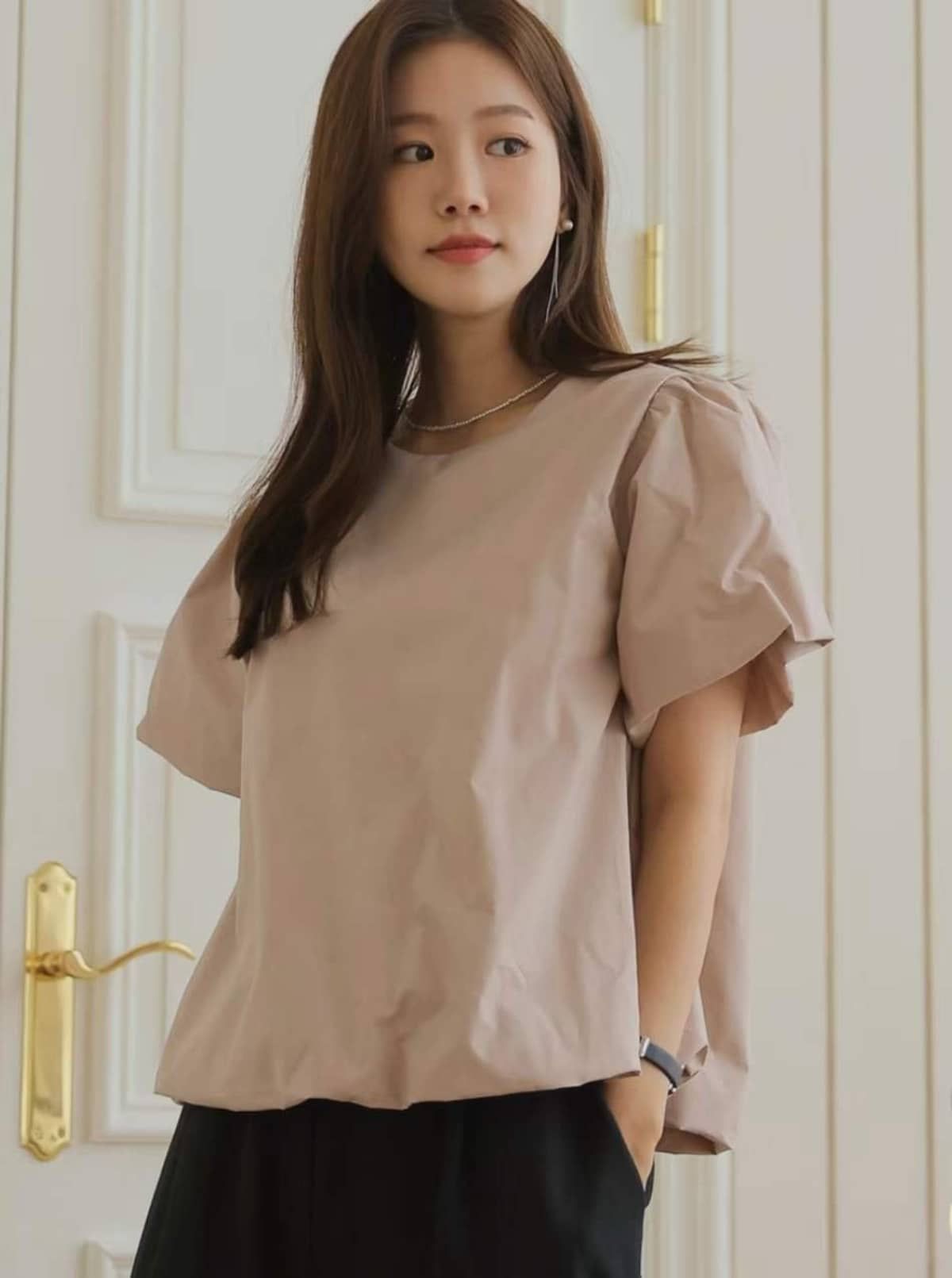 【C52430】韓國OPI 挺版A字上衣-立體雙層澎袖下襬束口花苞短袖素面★★