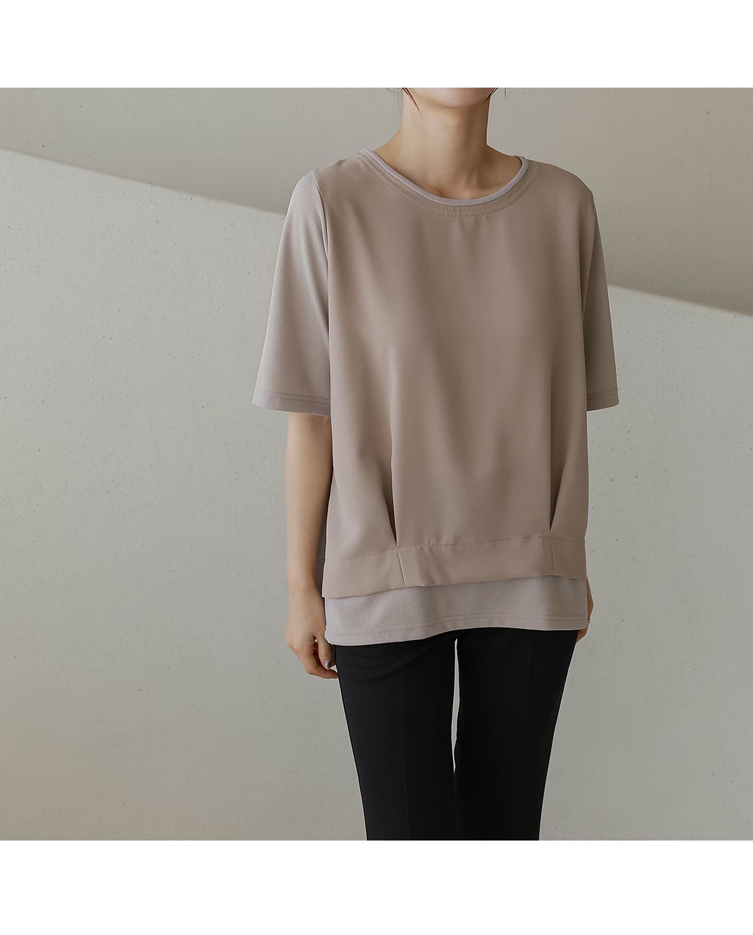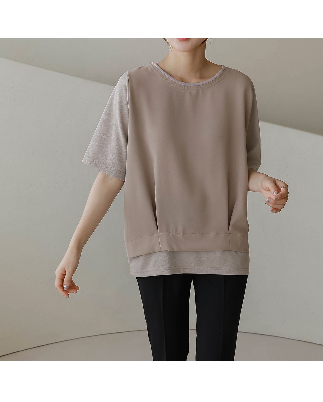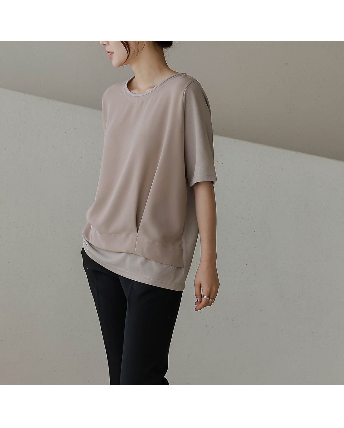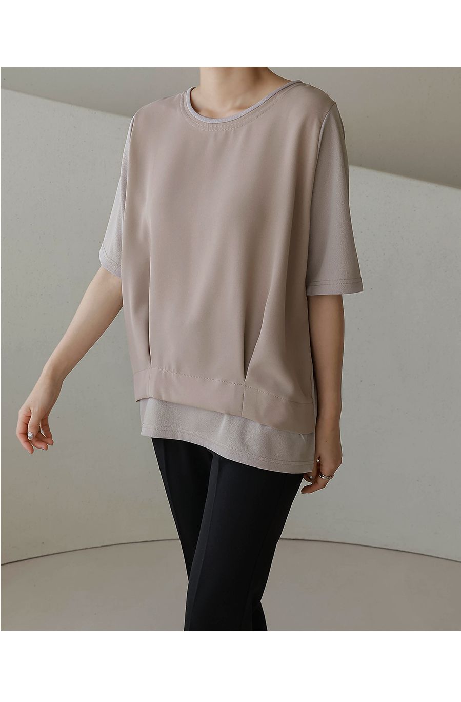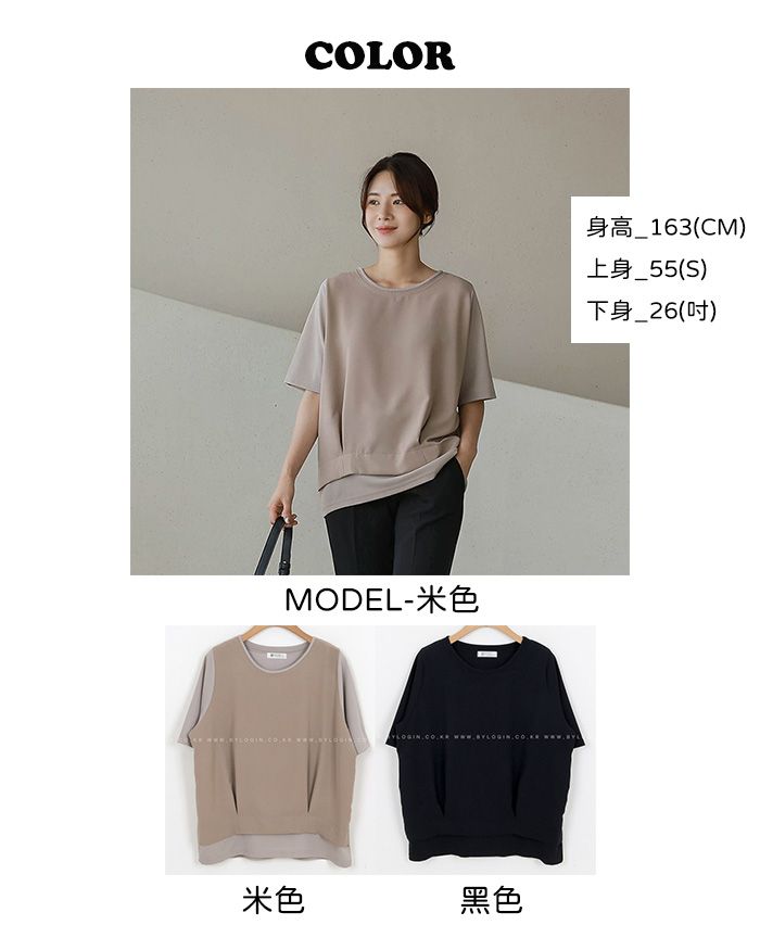 【C52537】韓國BLG 雙褶素面上衣-雙材質拼接假兩件寬鬆多尺寸五分袖★★