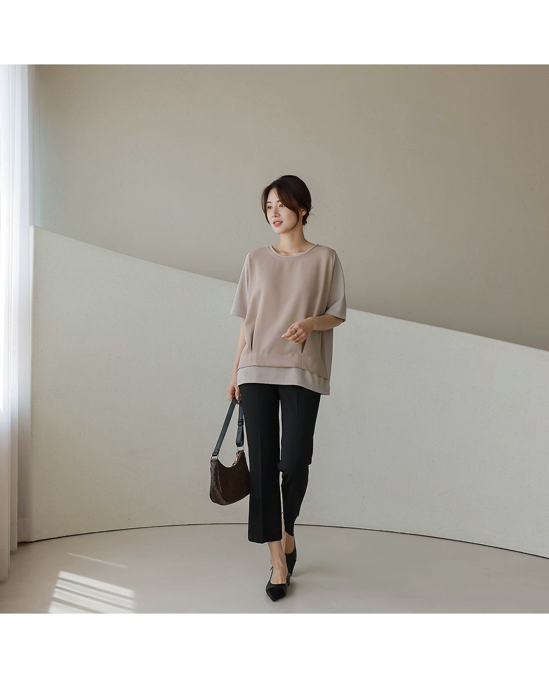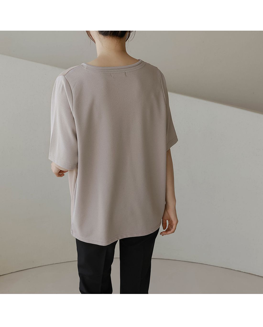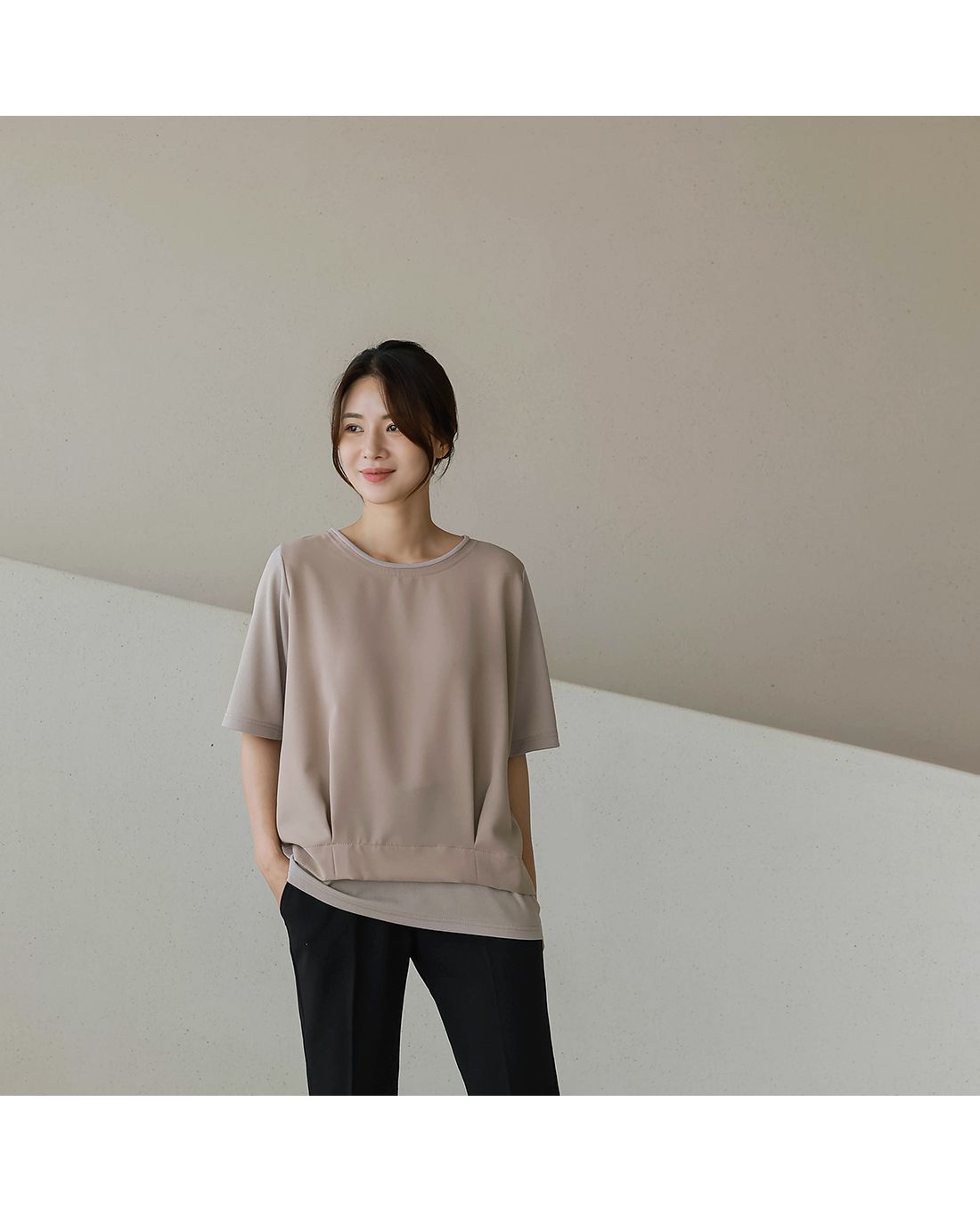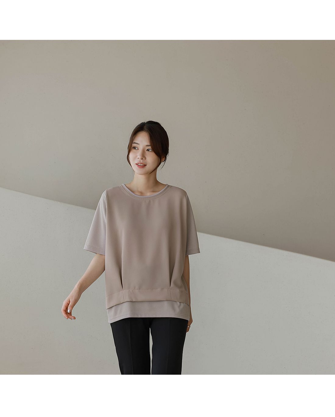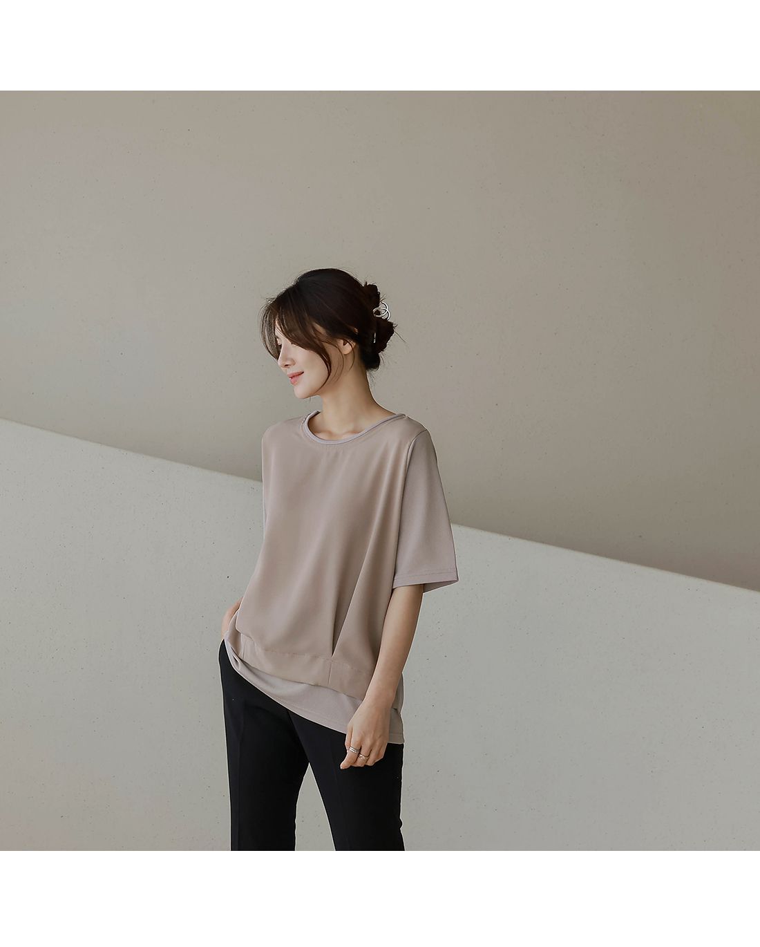 【C52537】韓國BLG 雙褶素面上衣-雙材質拼接假兩件寬鬆多尺寸五分袖★★