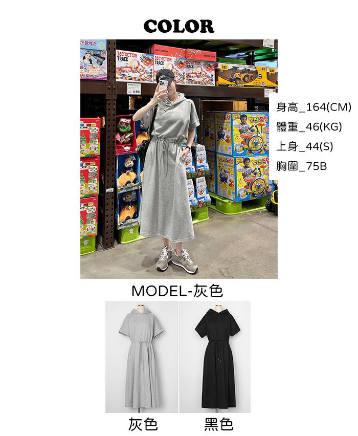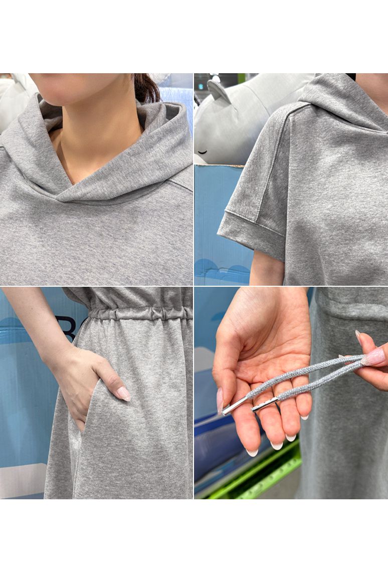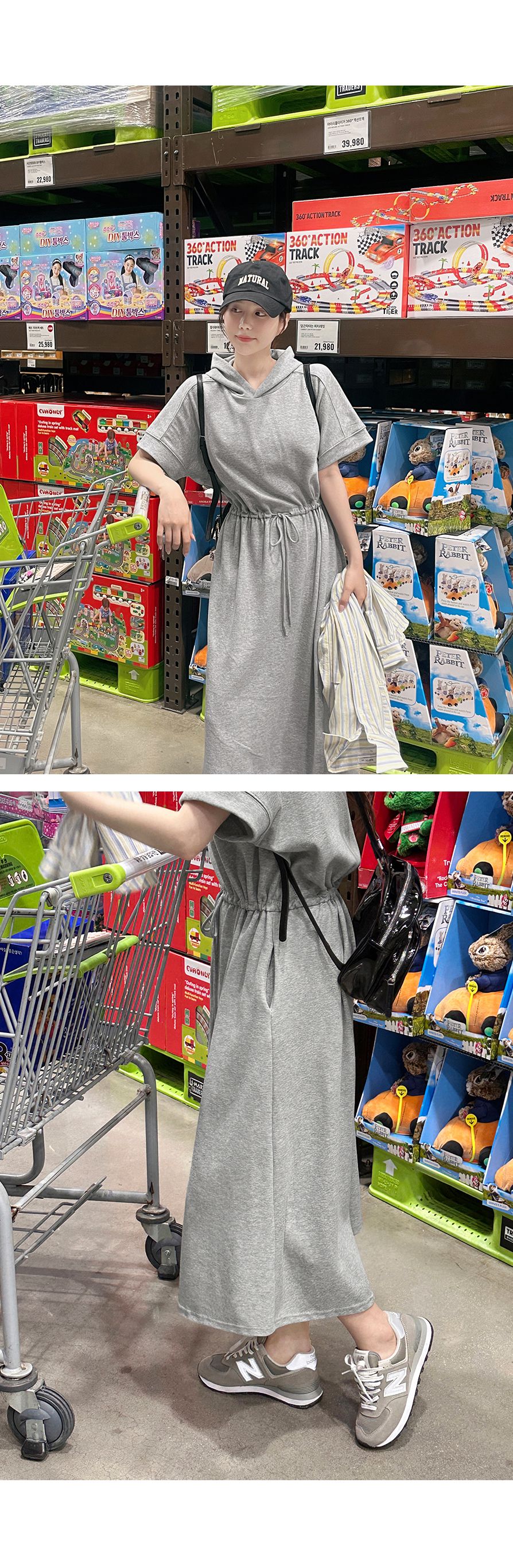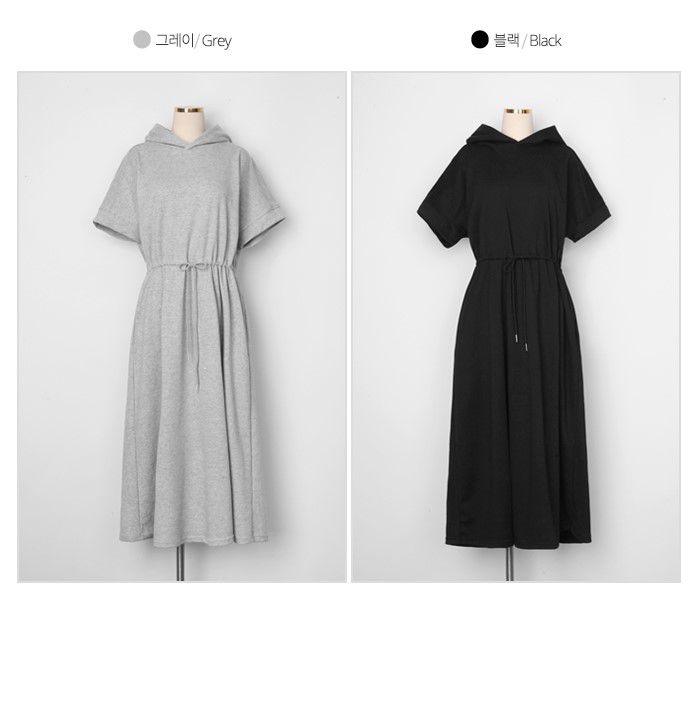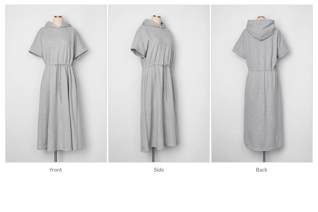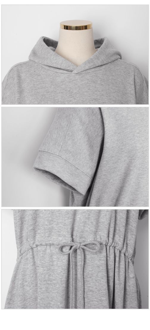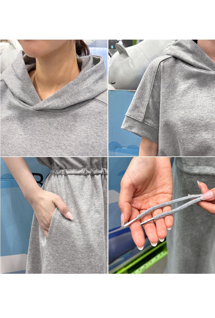 【C52593】韓國MID 收腰連帽洋裝-運動風素面抽繩腰連肩短袖大尺碼★★