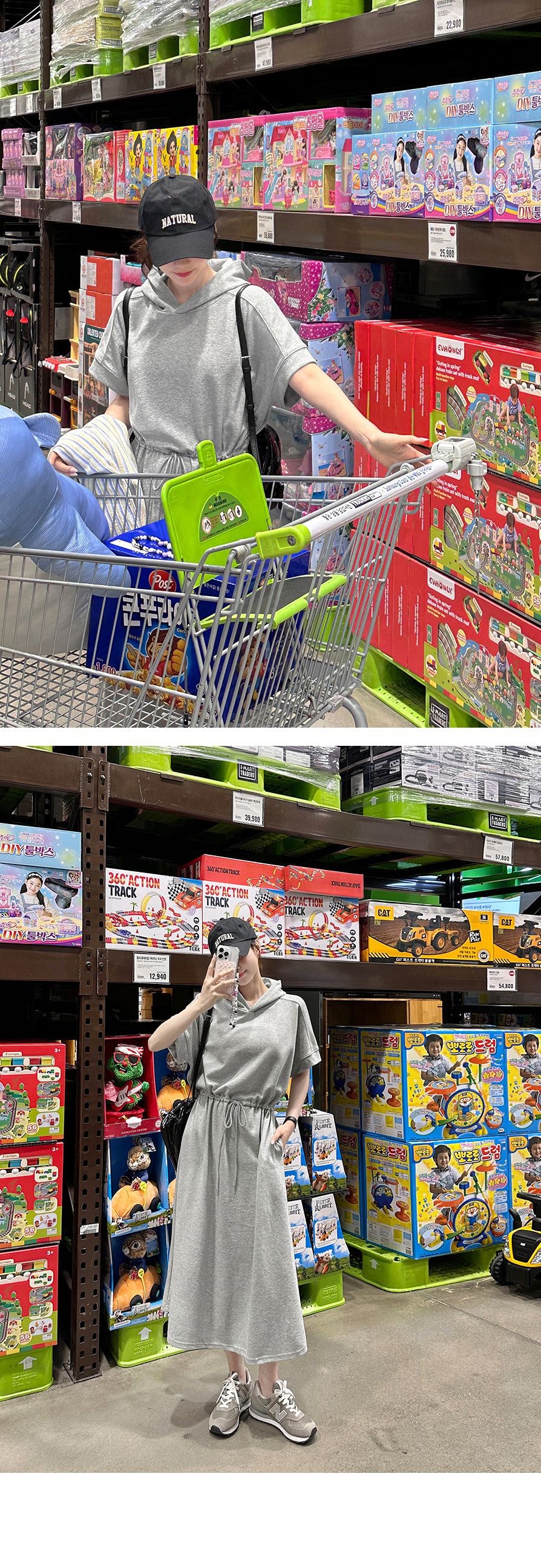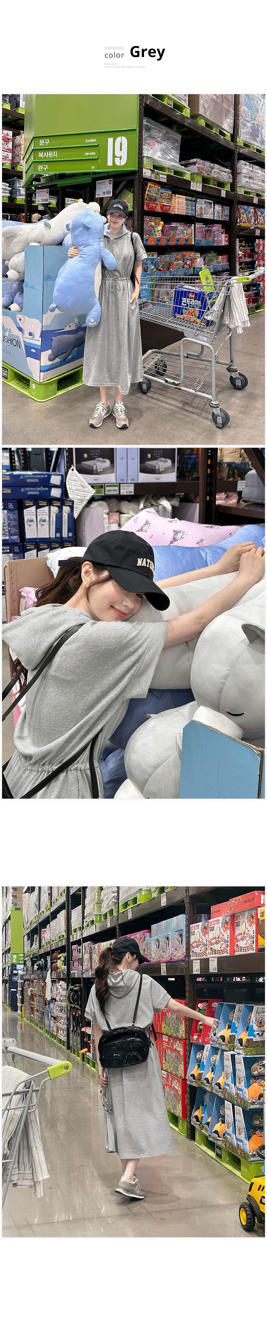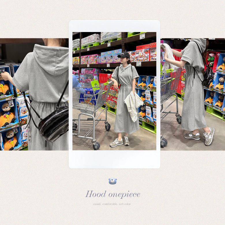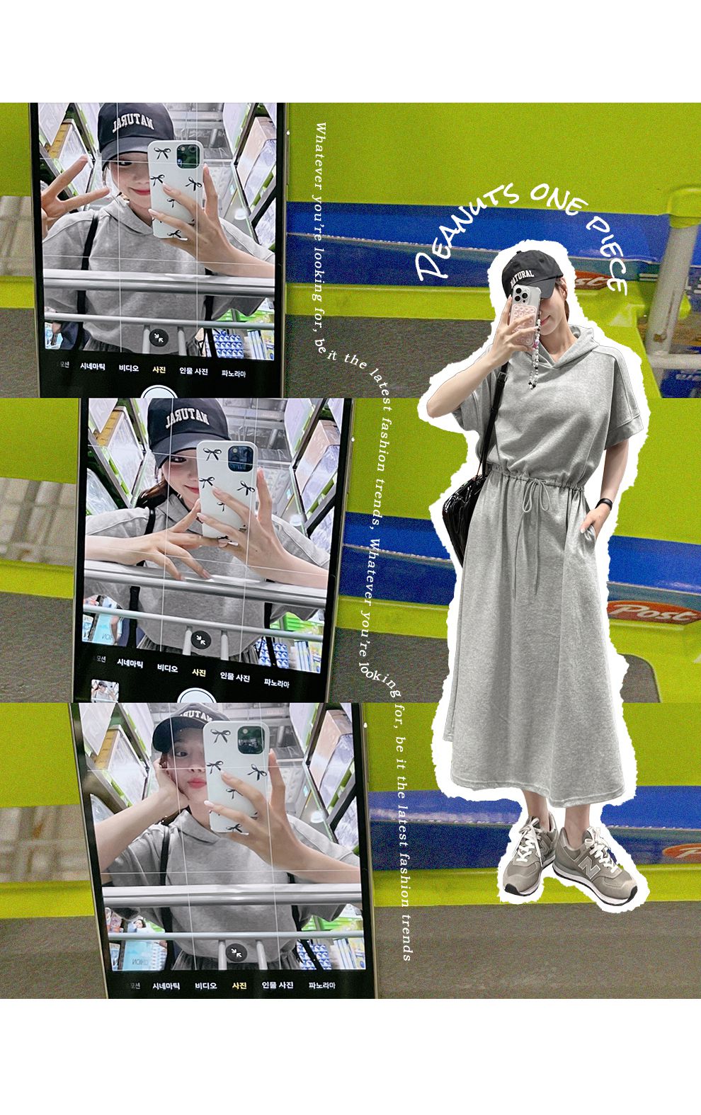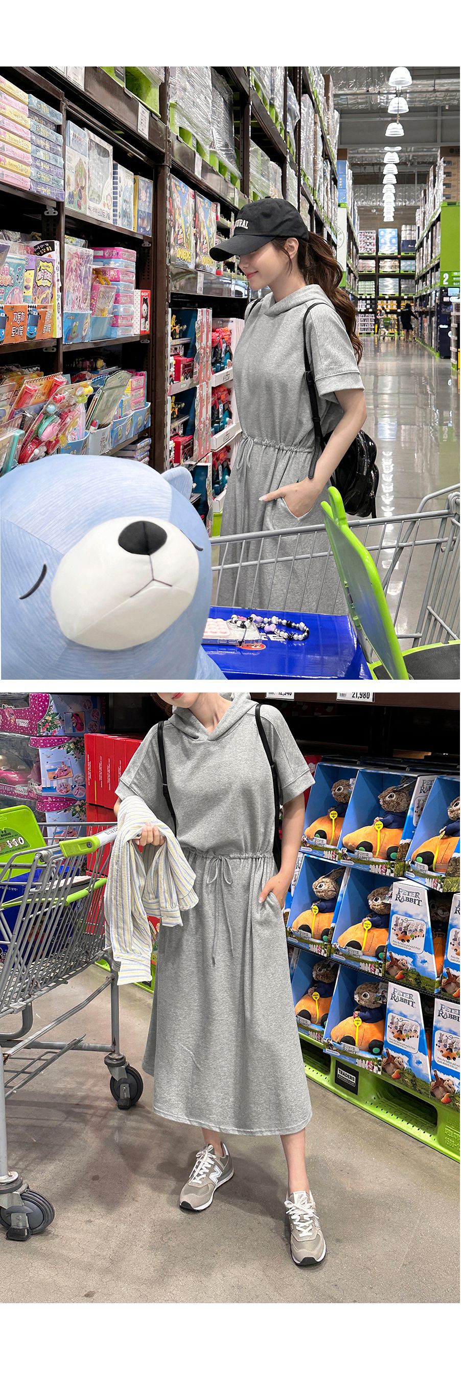 【C52593】韓國MID 收腰連帽洋裝-運動風素面抽繩腰連肩短袖大尺碼★★