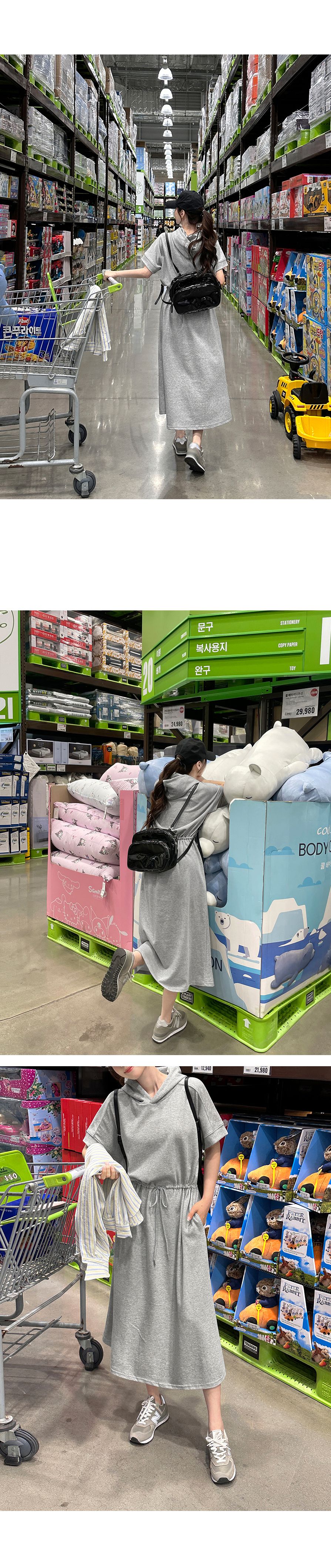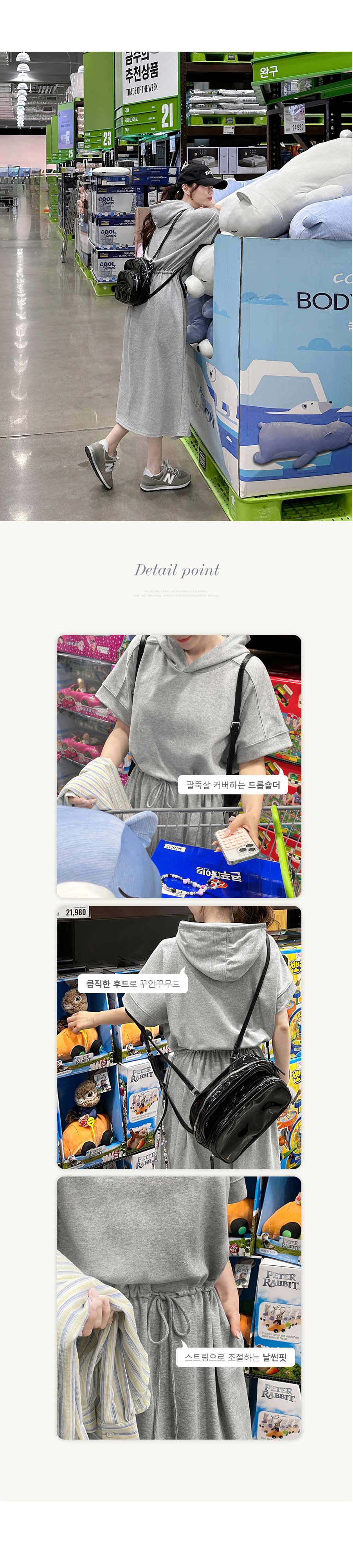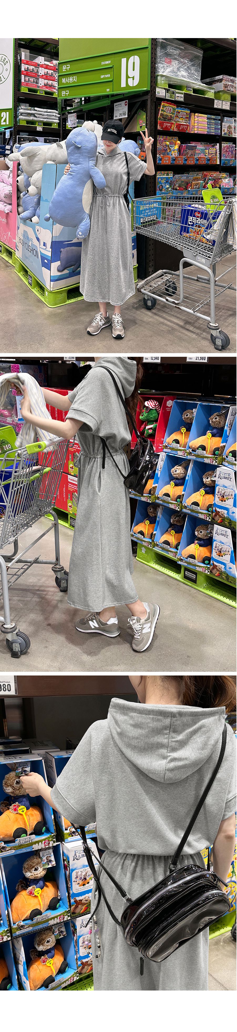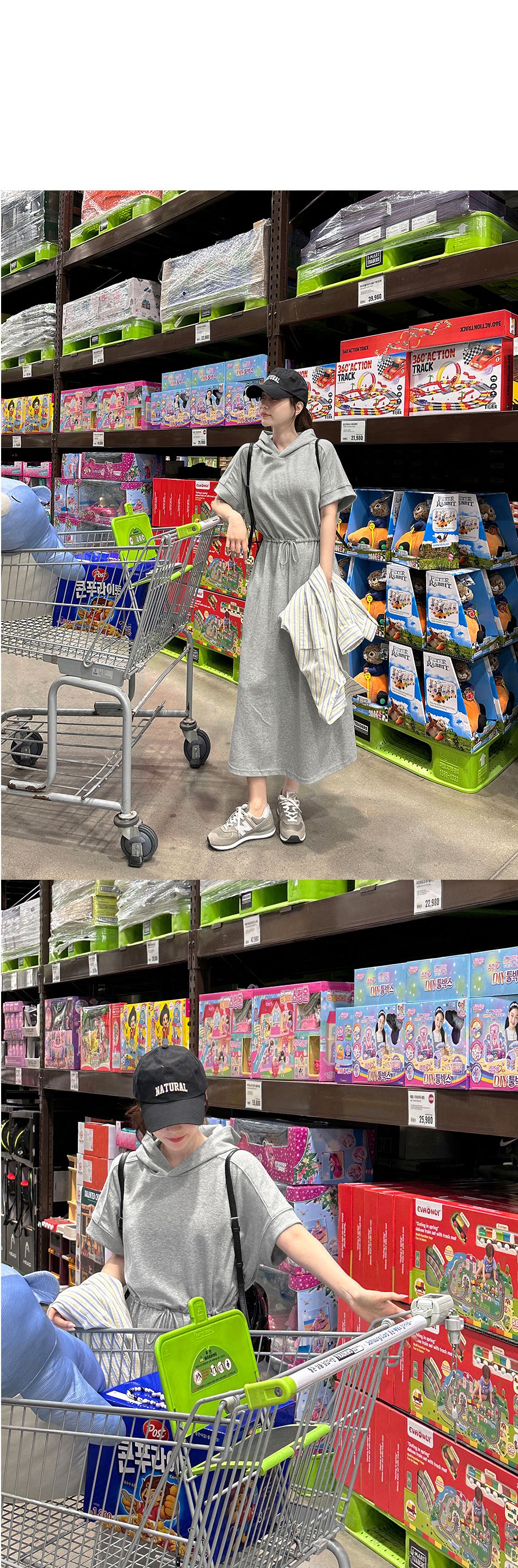 【C52593】韓國MID 收腰連帽洋裝-運動風素面抽繩腰連肩短袖大尺碼★★