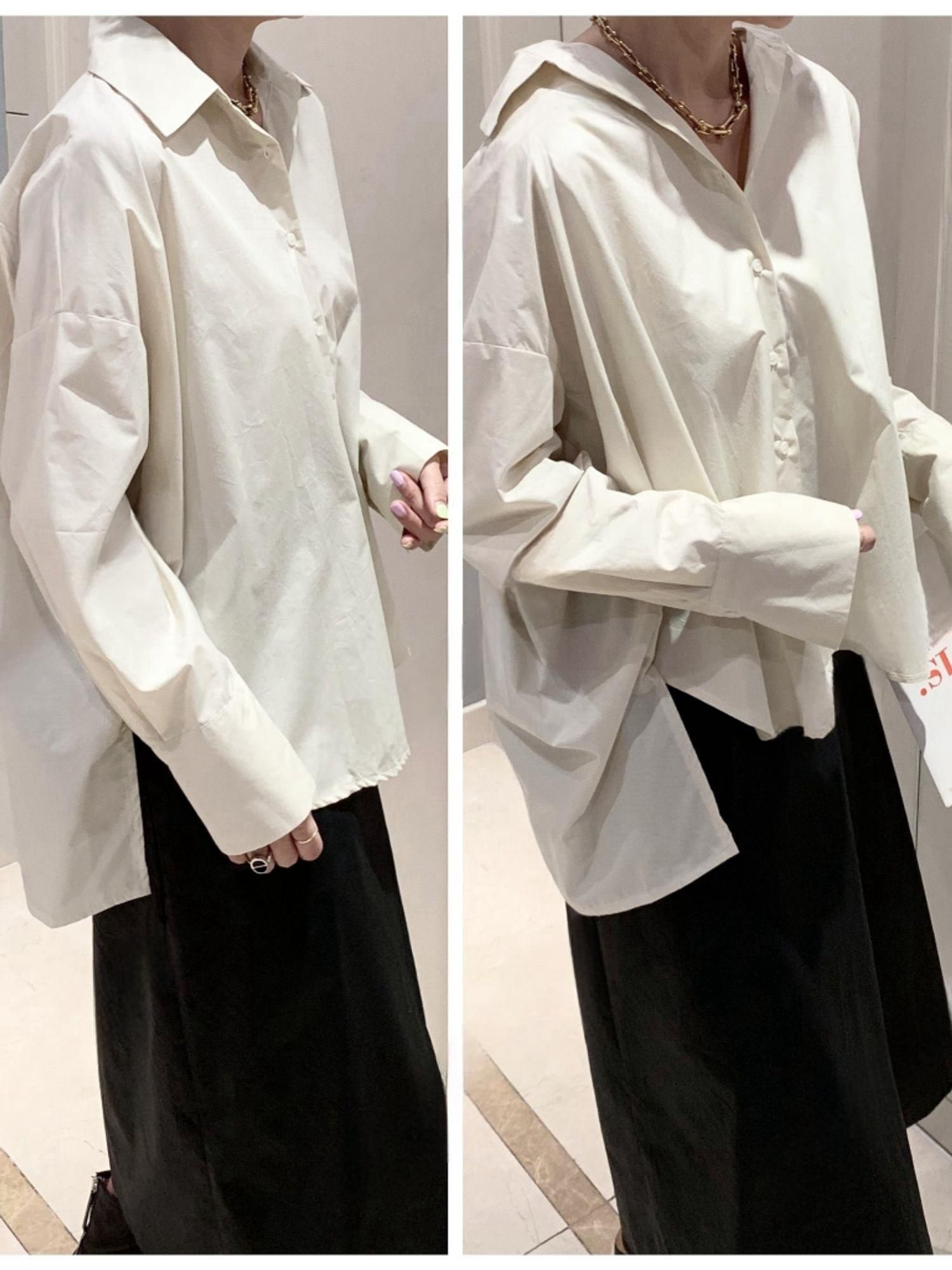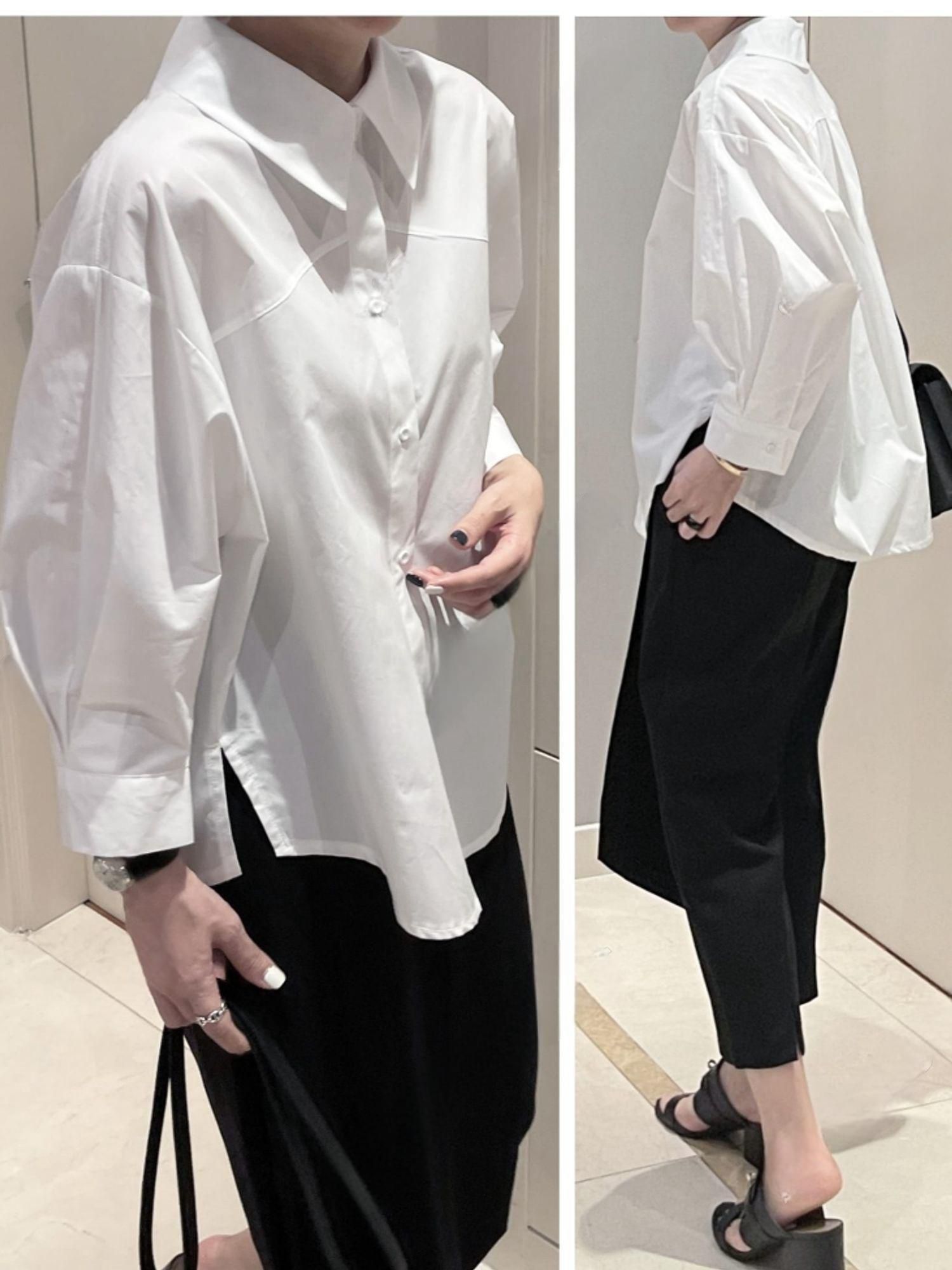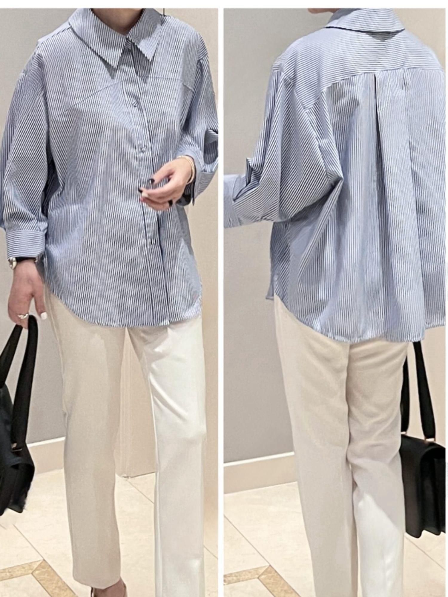 【C53076】韓國JME 側開衩素面襯衫-寬鬆條紋圓弧下襬七分寬袖上衣★★