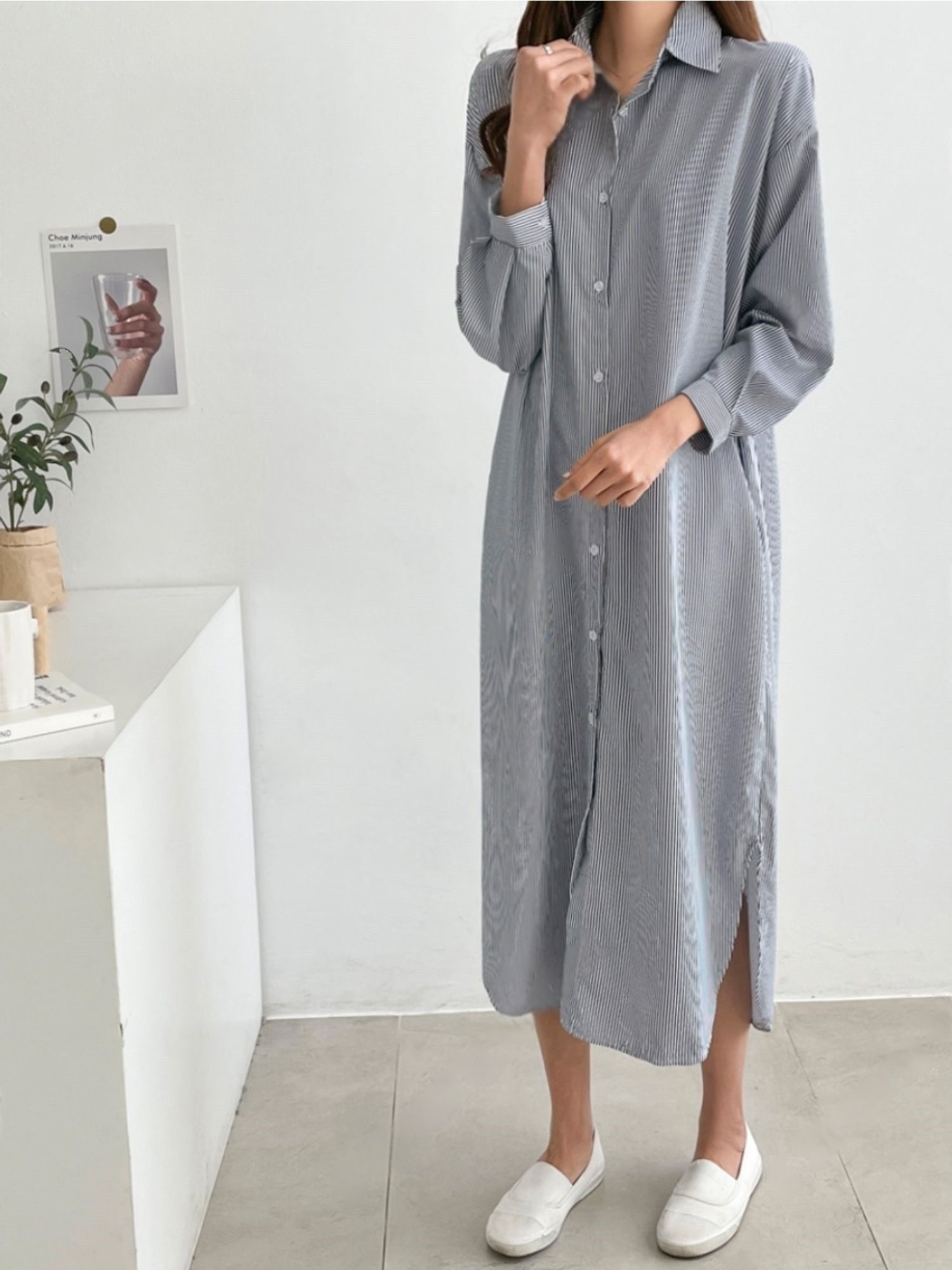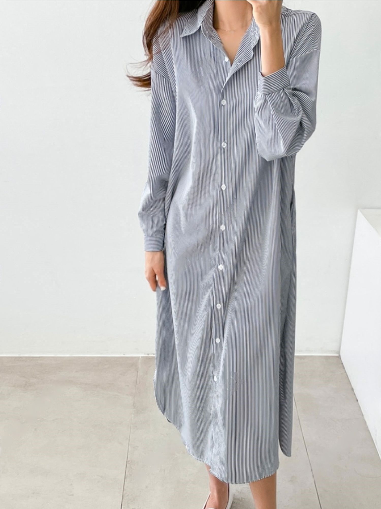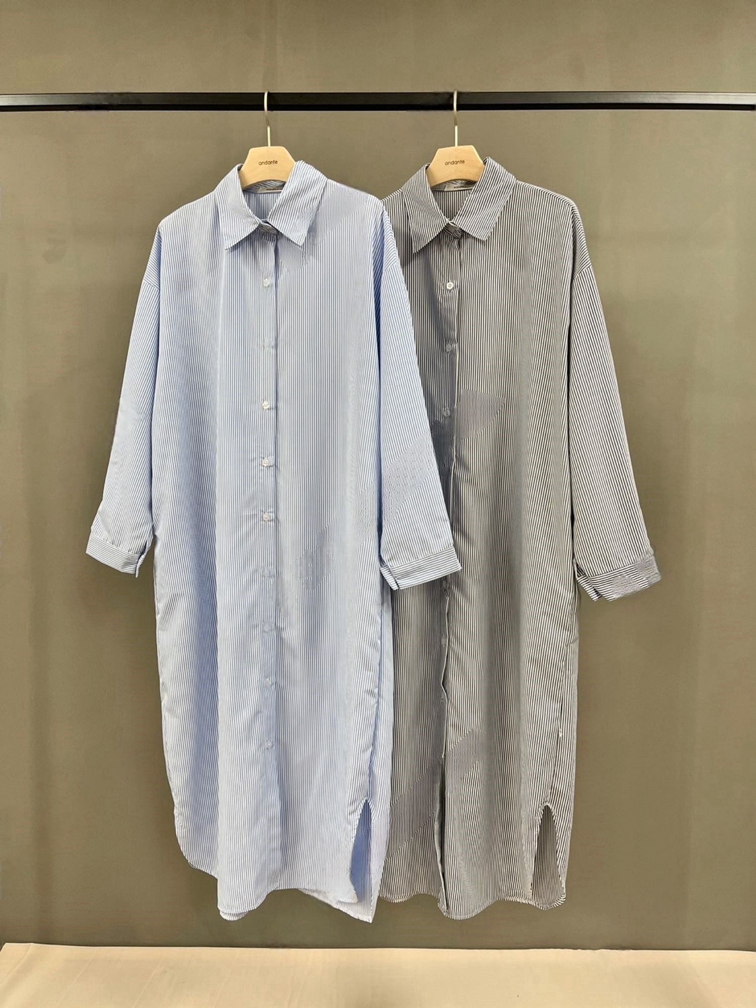 【C53586】韓國AND 條紋襯衫連身裙-寬鬆弧形下襬側衩雙口袋長袖洋裝