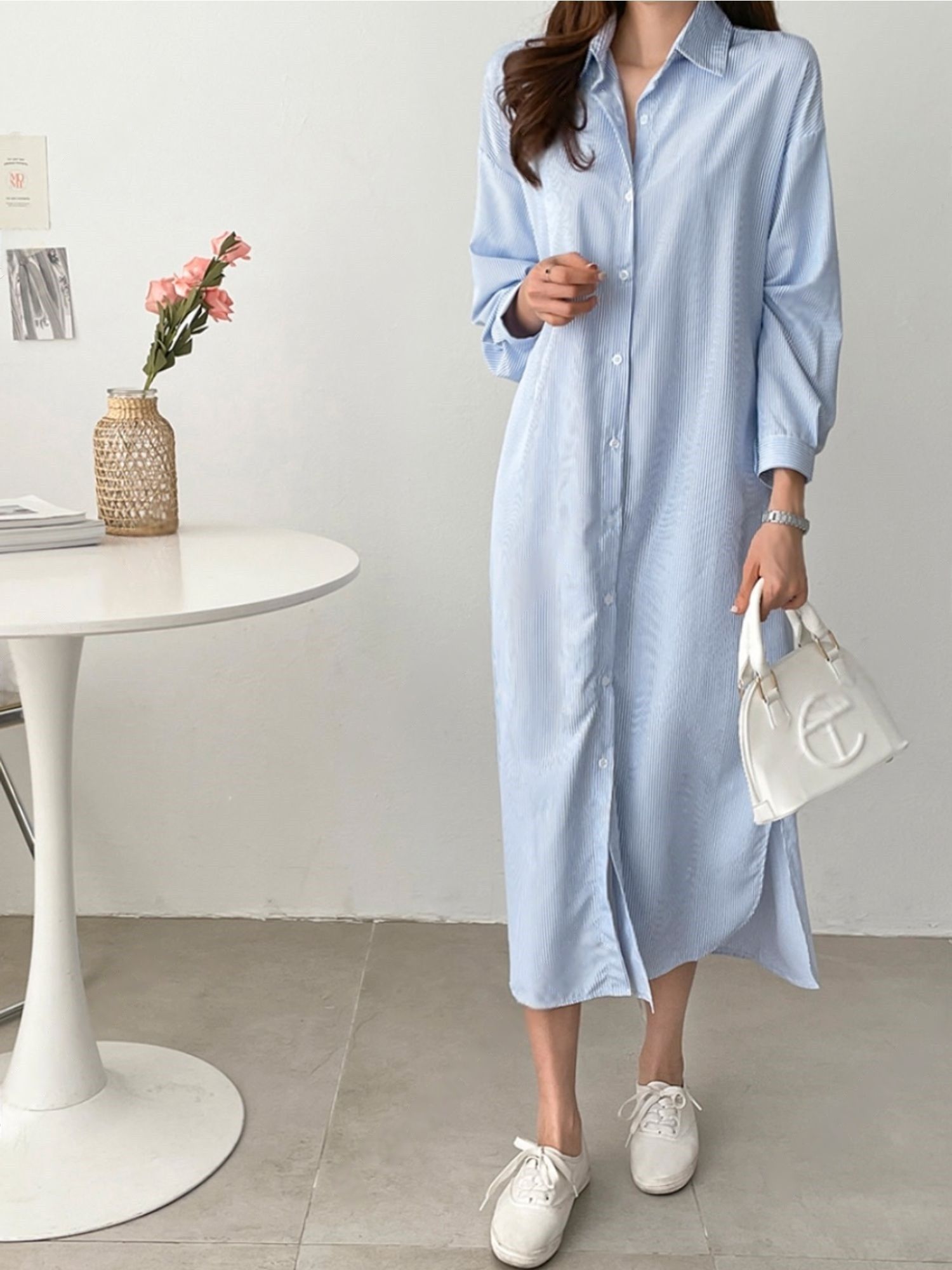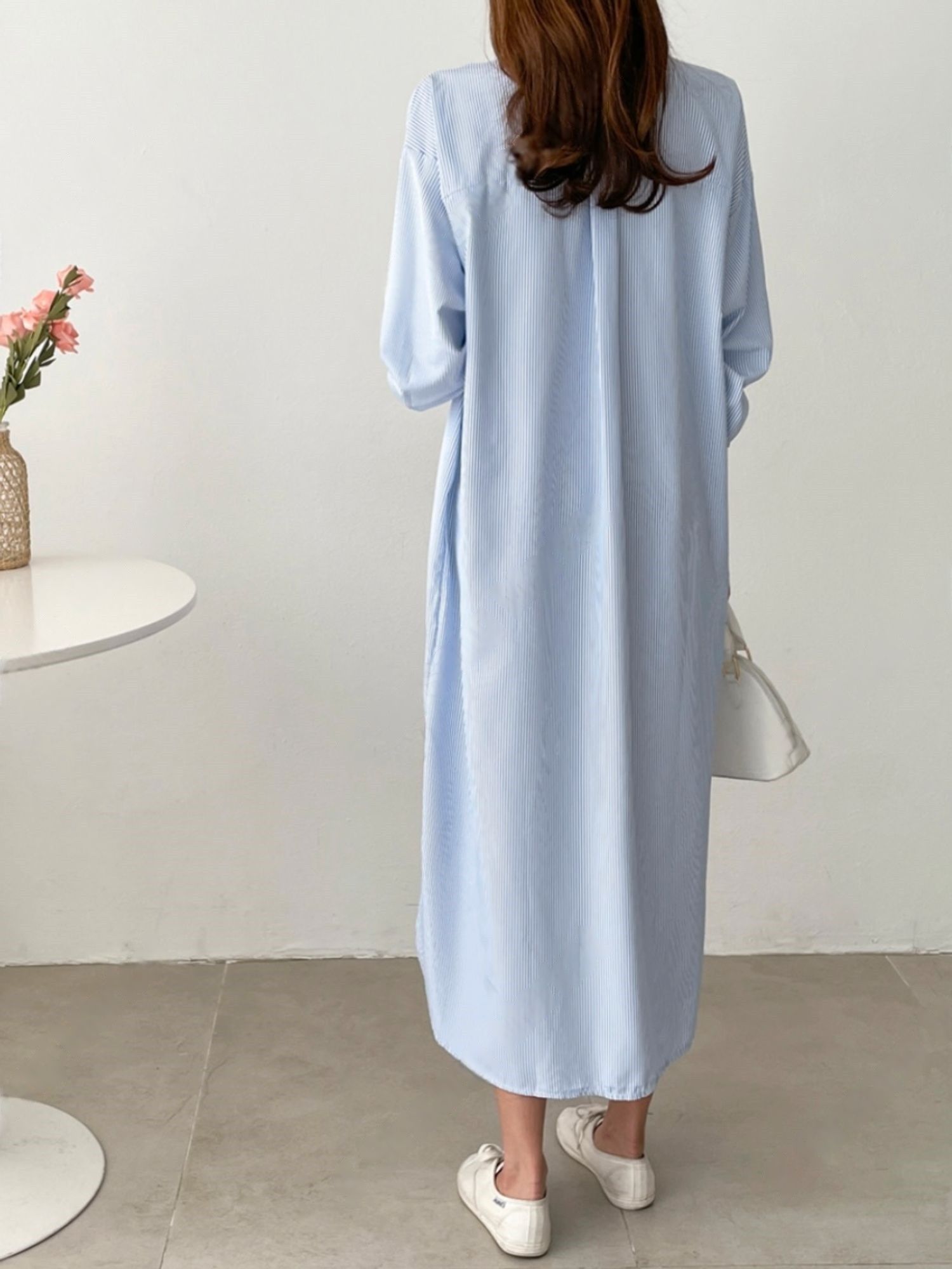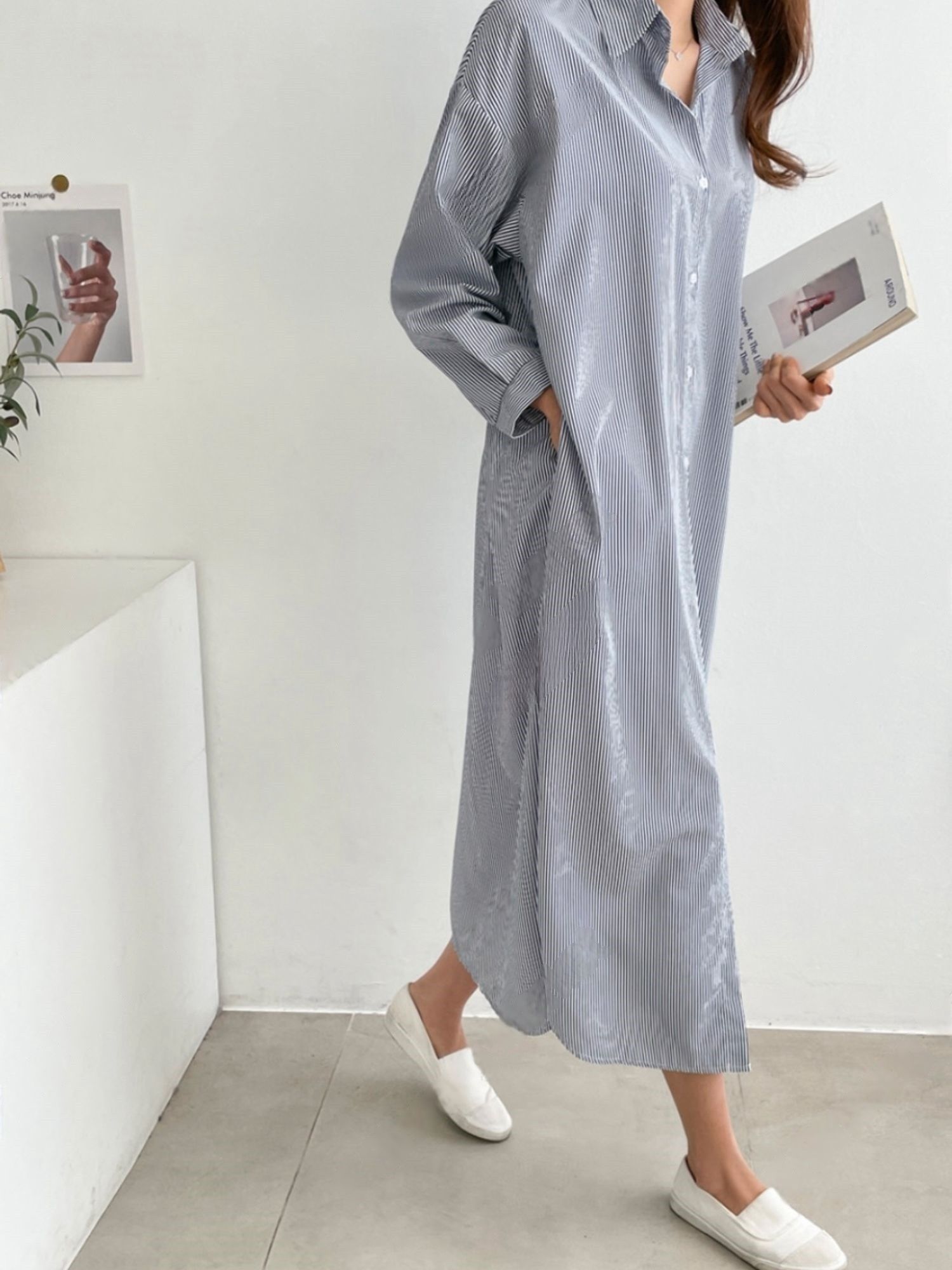 【C53586】韓國AND 條紋襯衫連身裙-寬鬆弧形下襬側衩雙口袋長袖洋裝
