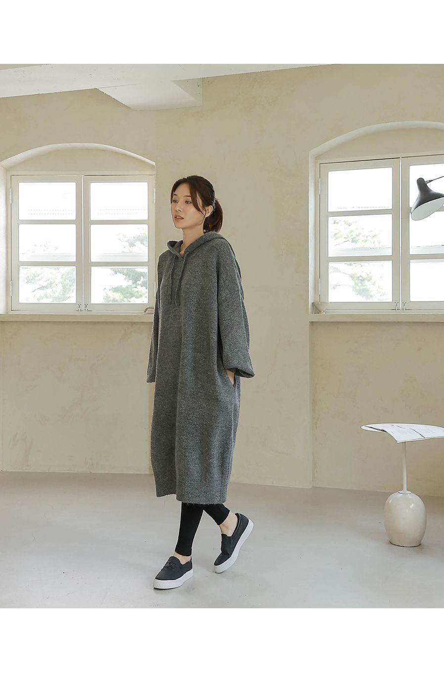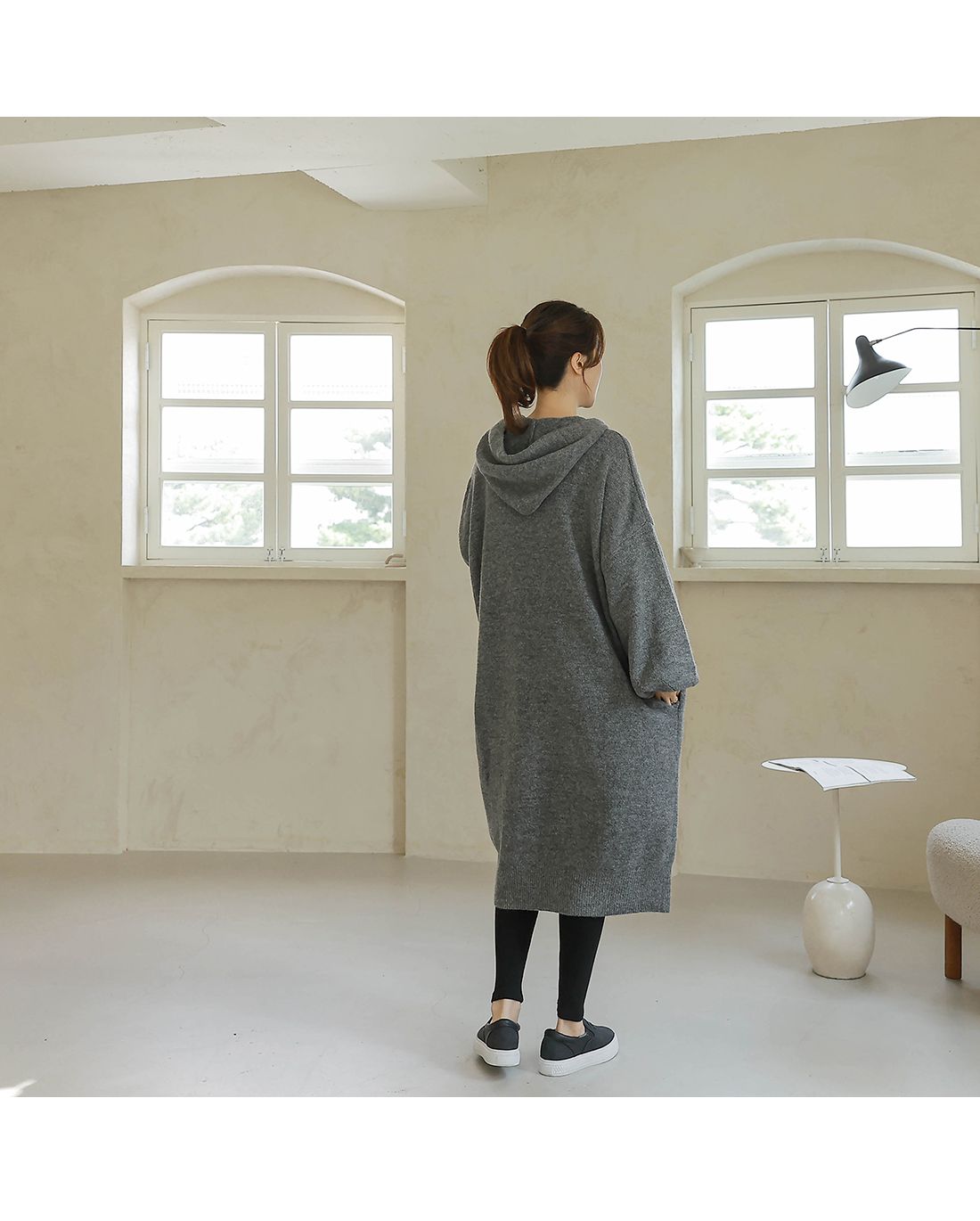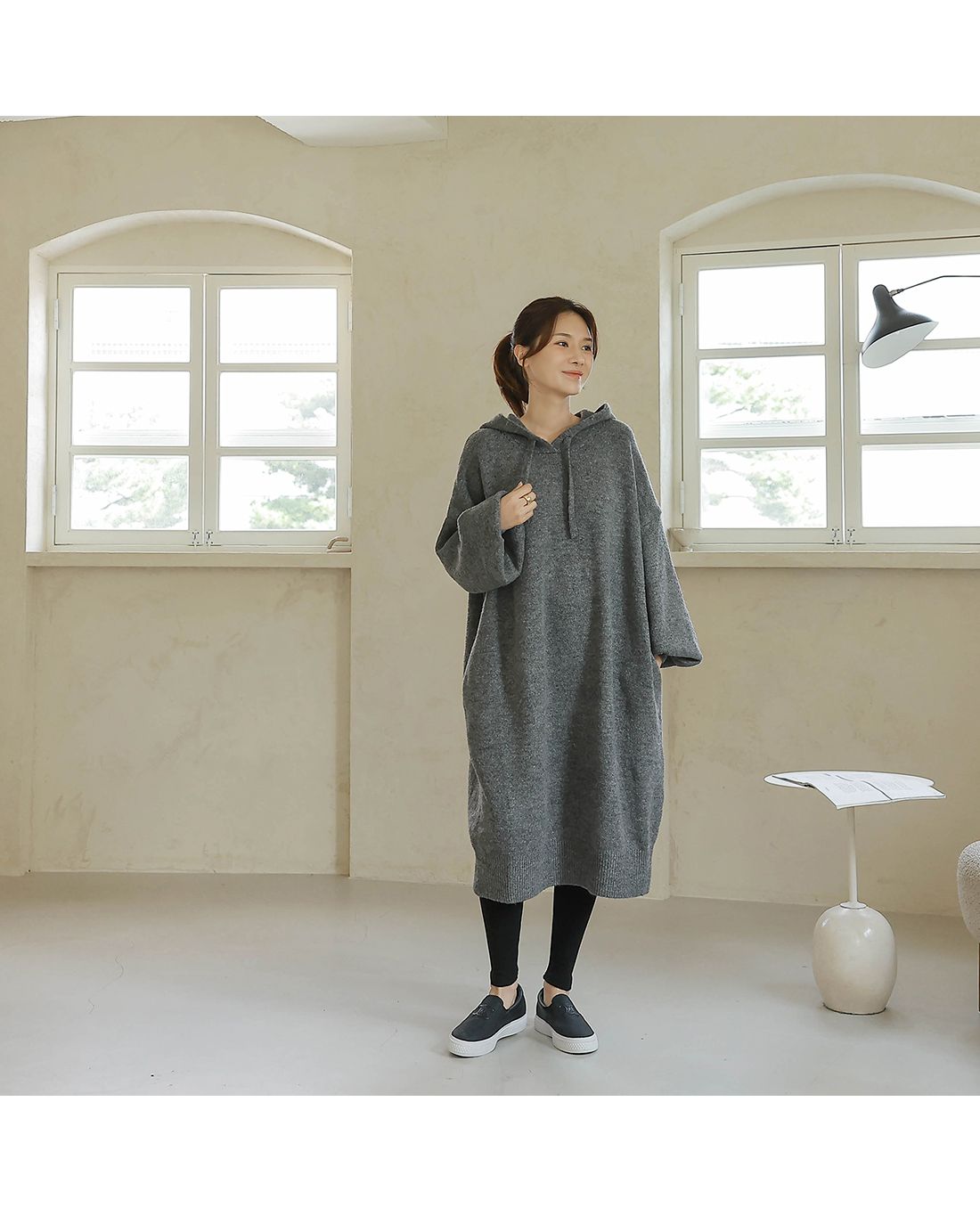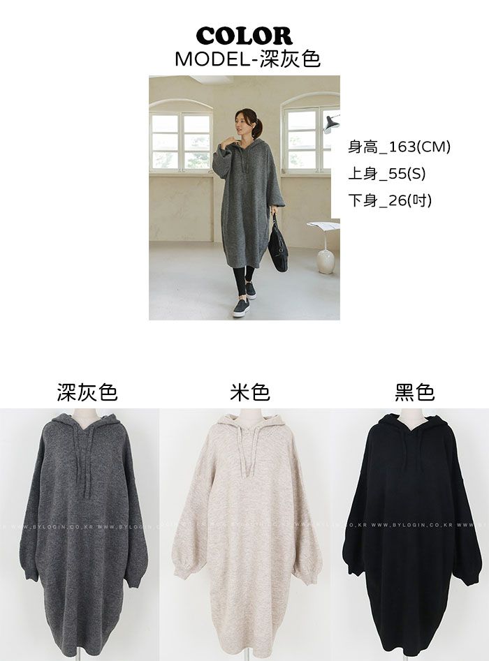 【C53591】韓國BLG 泡泡袖針織洋裝-混羊毛連帽素面寬鬆長袖連身裙★★