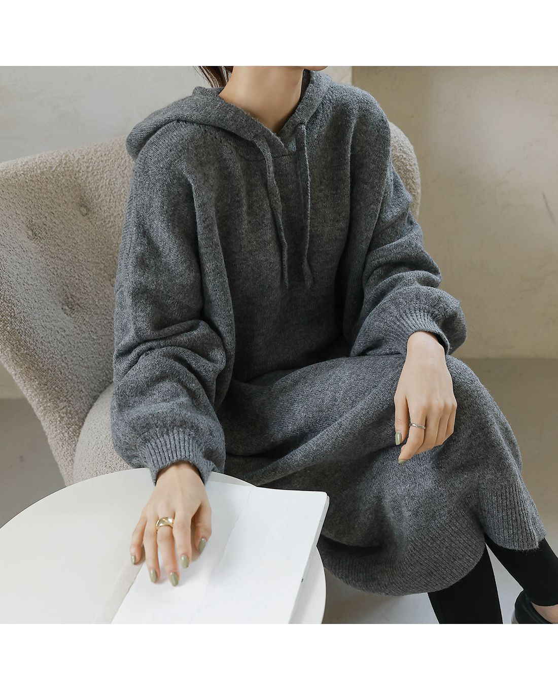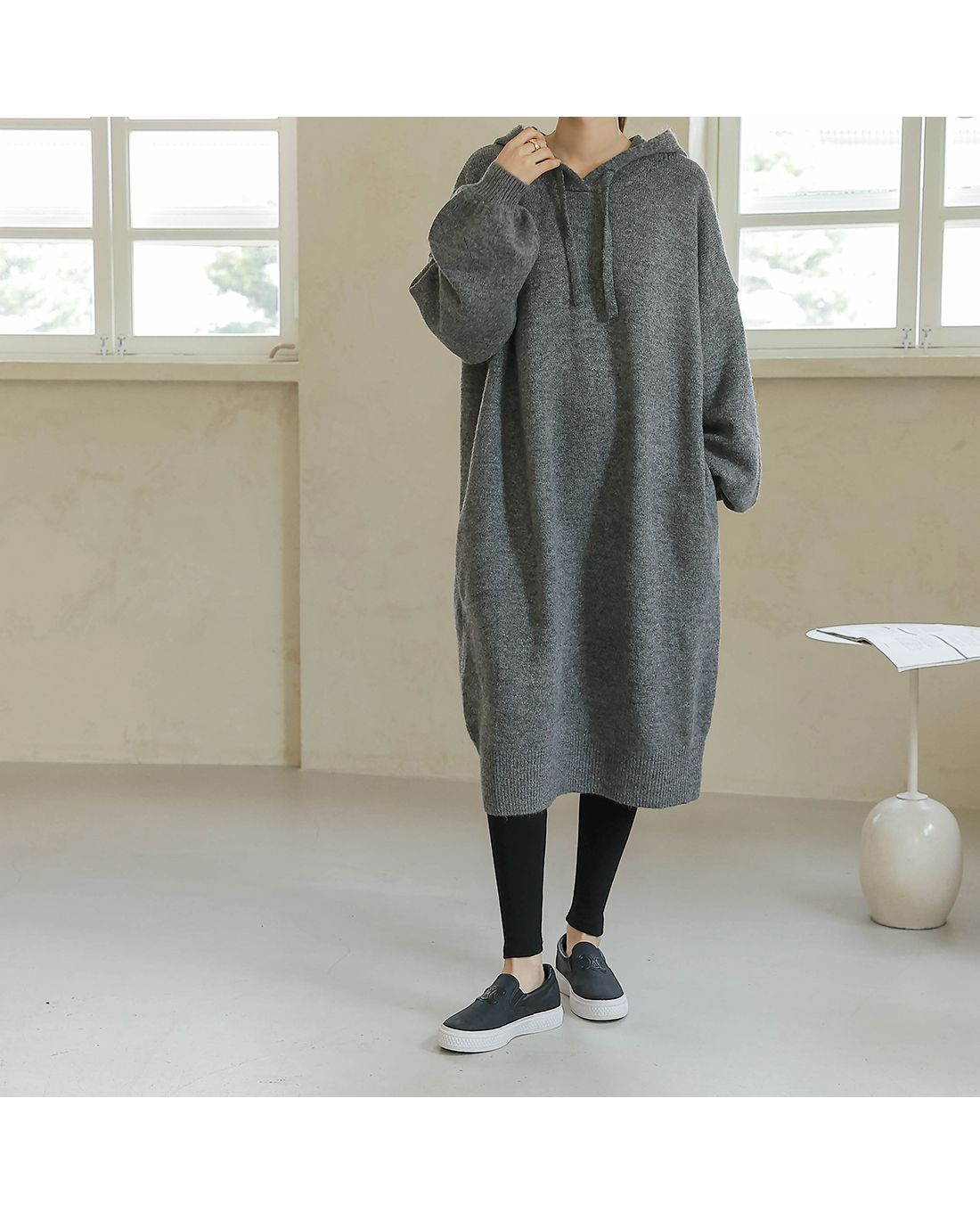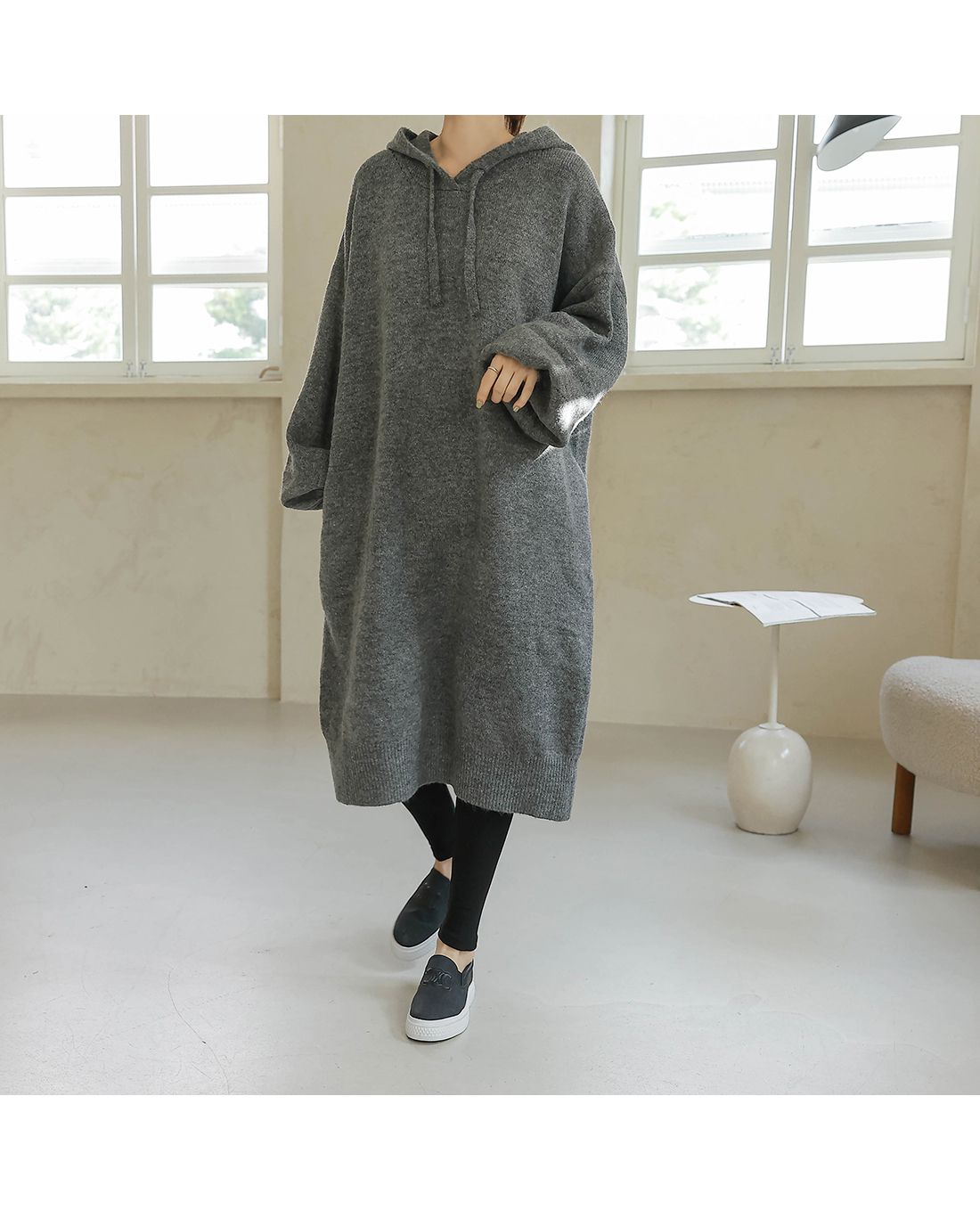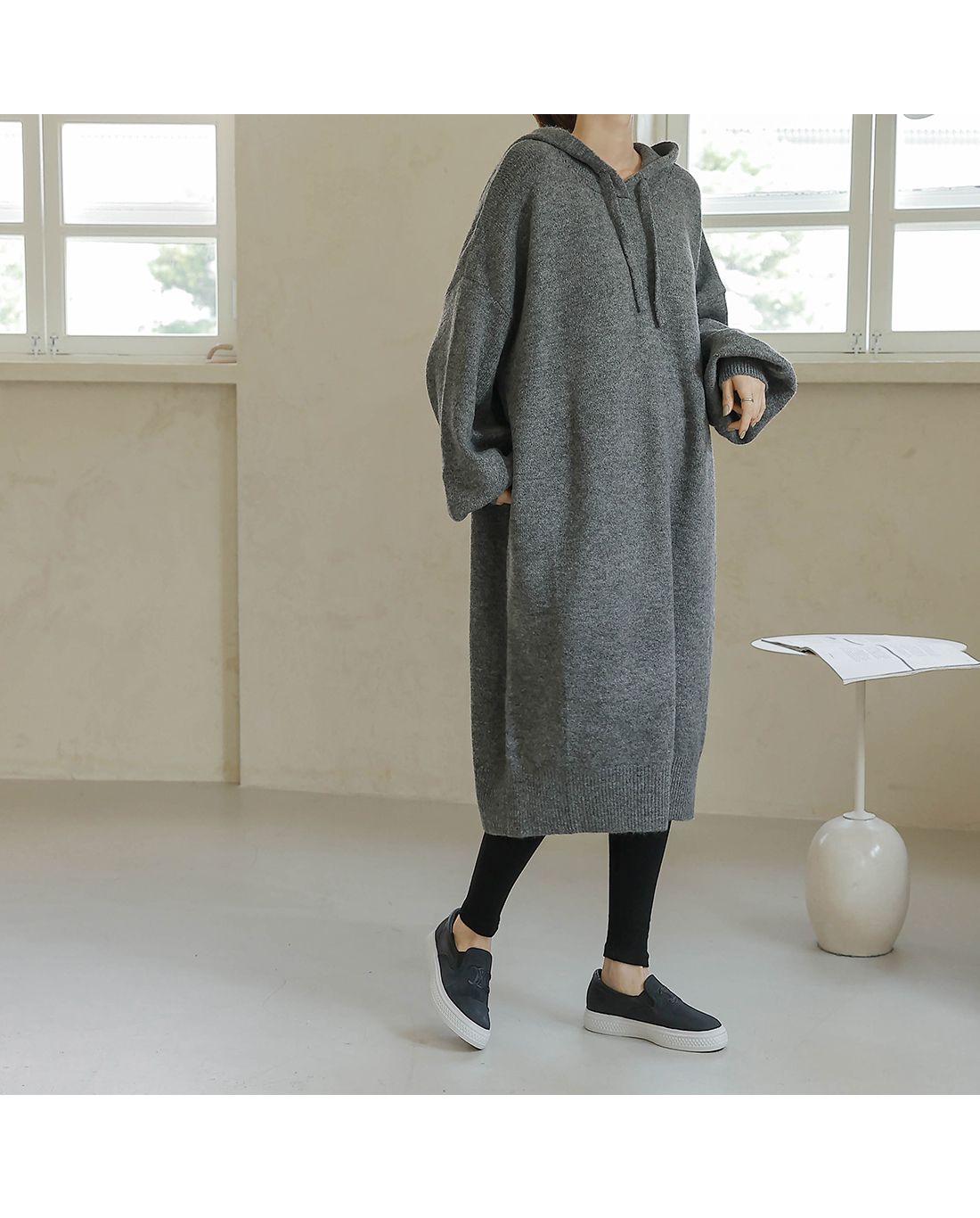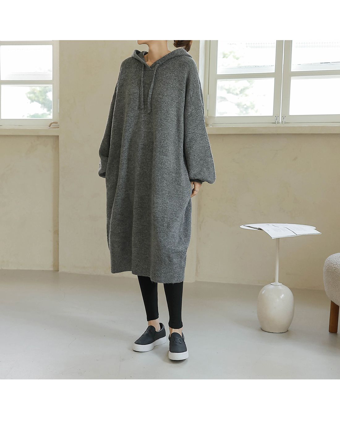 保暖混羊毛面料/慵懶寬袖/抽繩連帽/寬鬆版型/大尺碼友善 - 休閒居家簡約百搭素面一件式洋裝泡泡袖針織洋裝混羊毛洋裝抽繩連帽洋裝寬鬆大尺碼洋裝長袖連身裙深灰色米色黑色