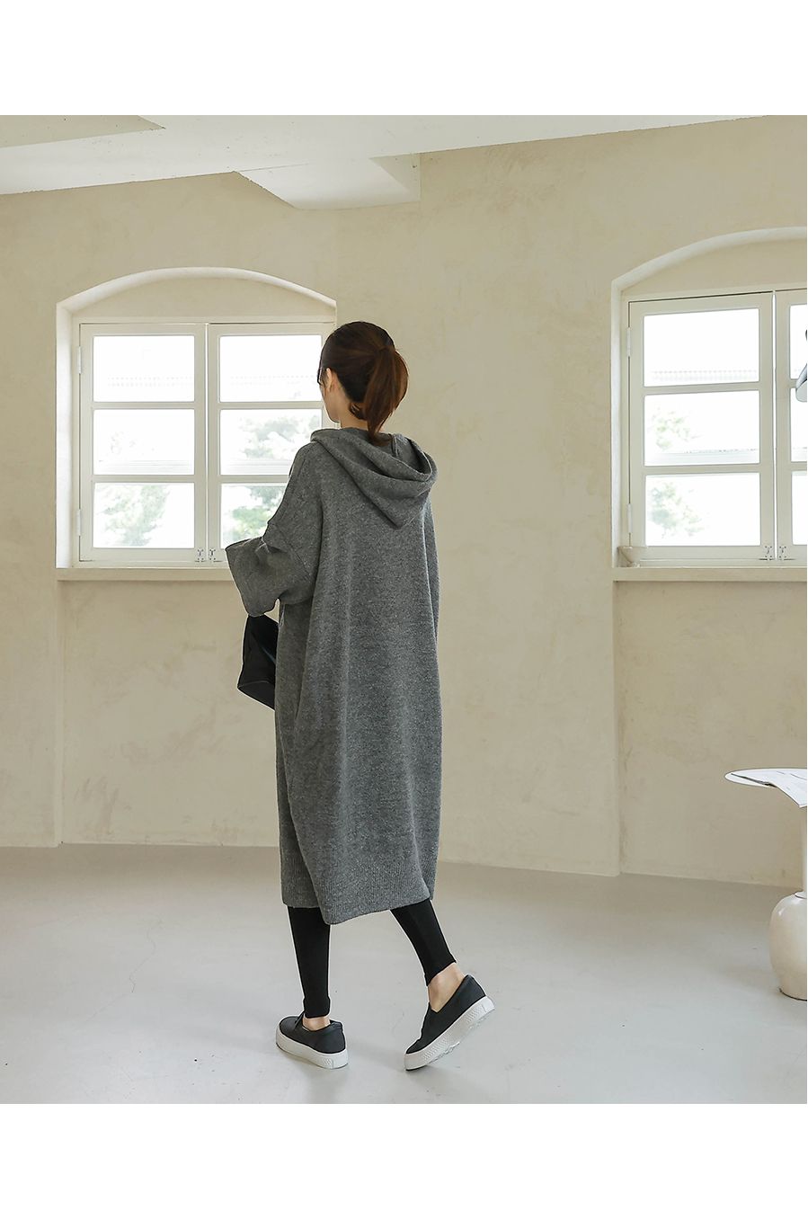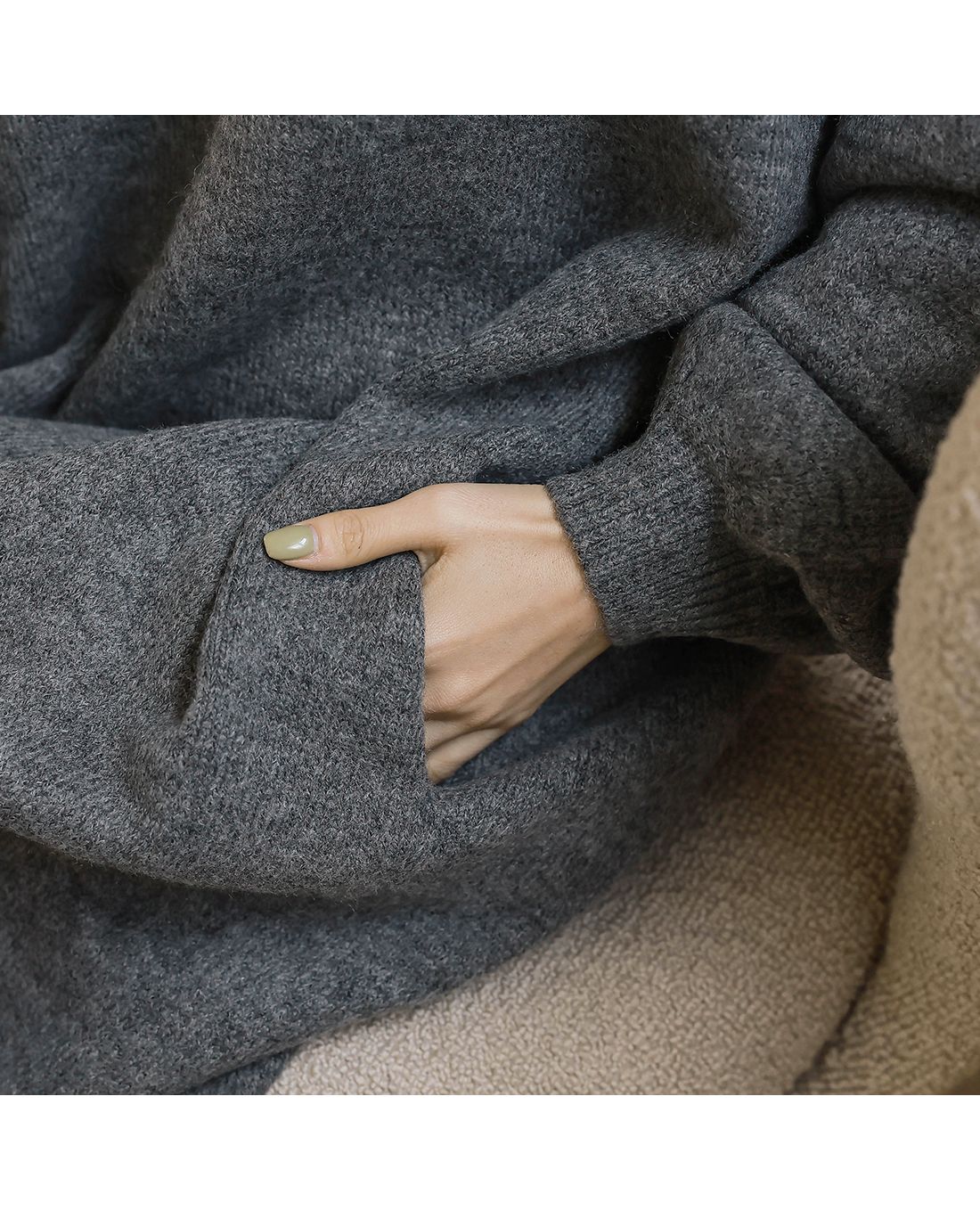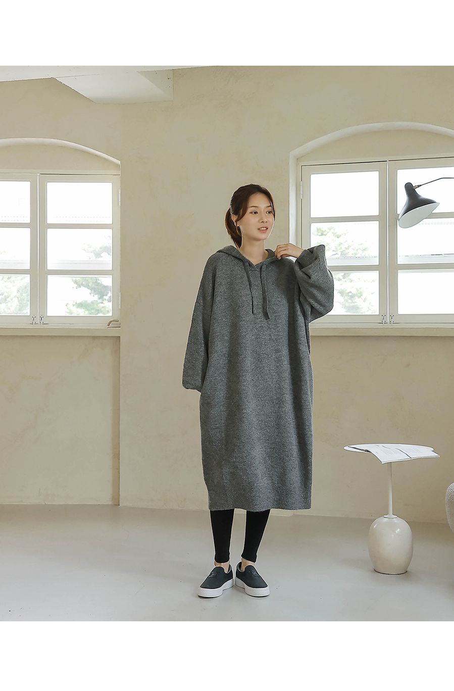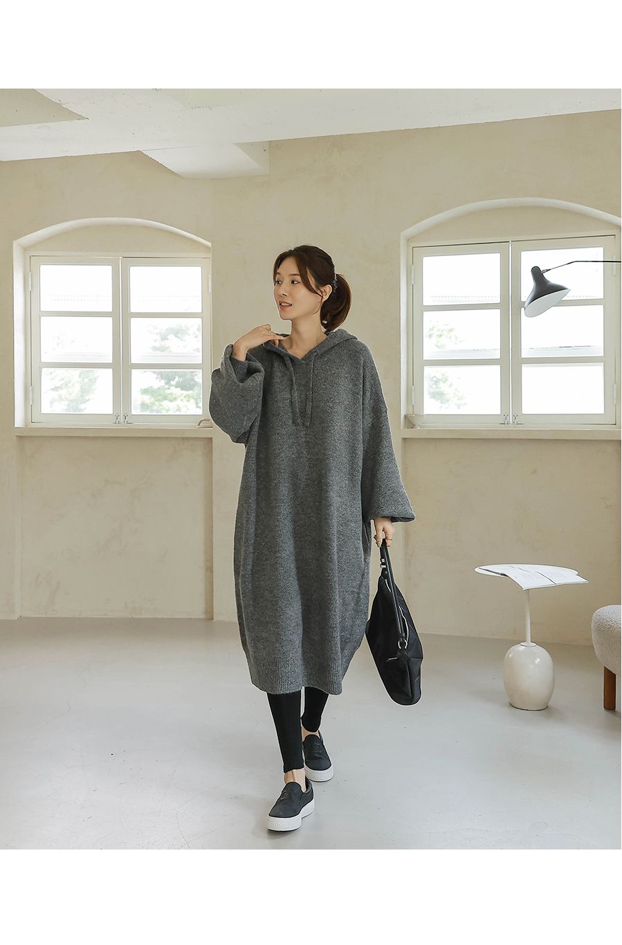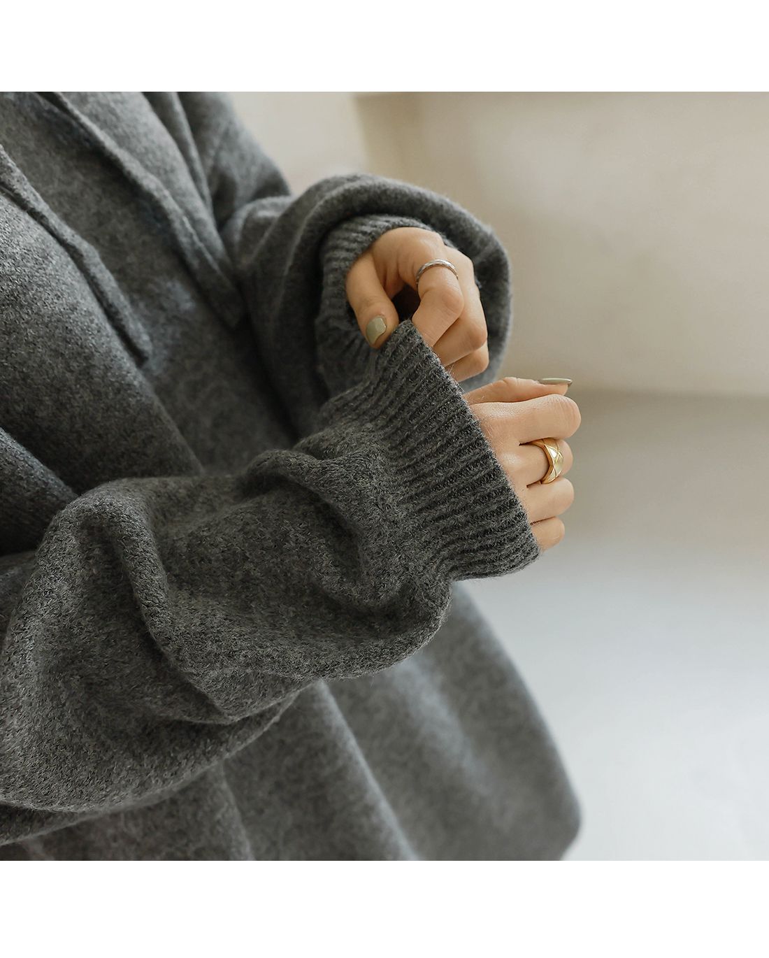 保暖混羊毛面料/慵懶寬袖/抽繩連帽/寬鬆版型/大尺碼友善 - 休閒居家簡約百搭素面一件式洋裝泡泡袖針織洋裝混羊毛洋裝抽繩連帽洋裝寬鬆大尺碼洋裝長袖連身裙深灰色米色黑色