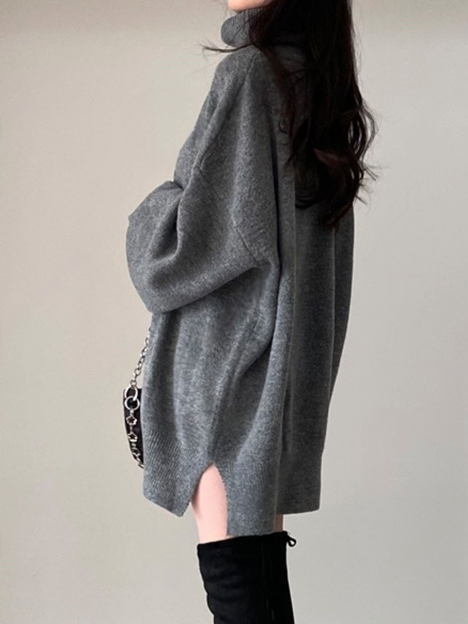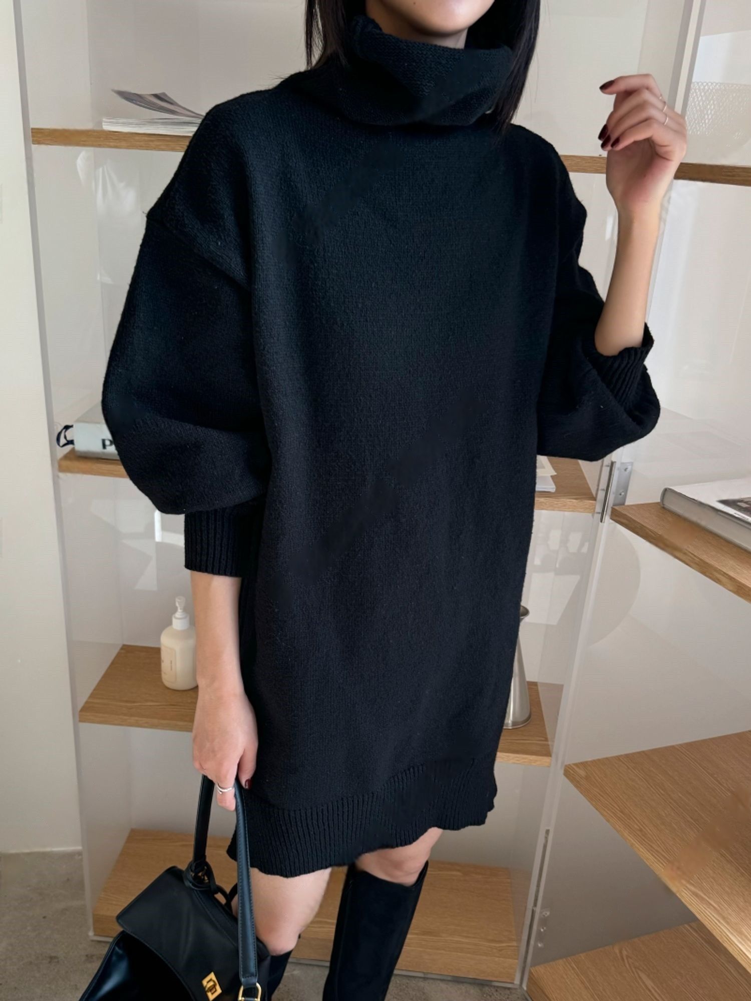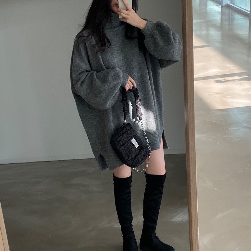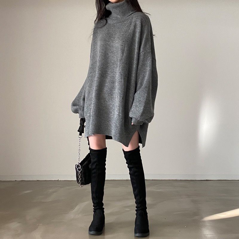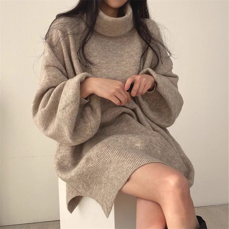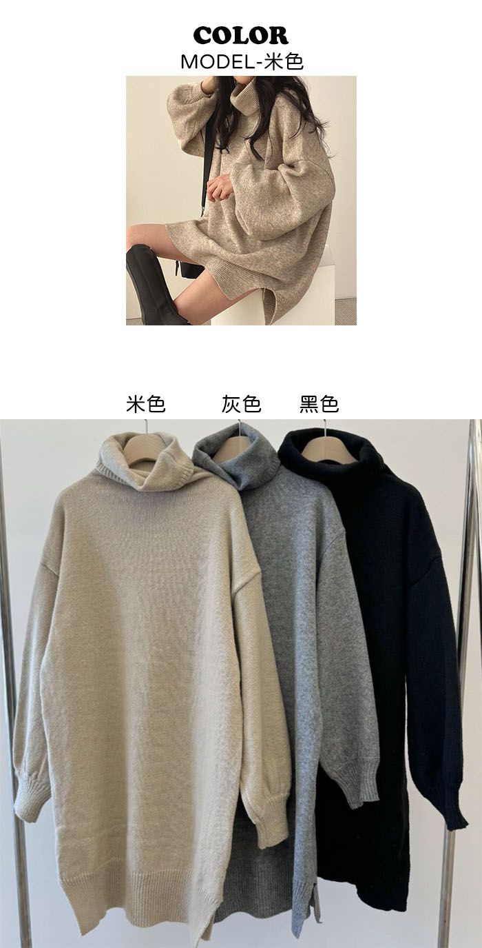 反摺高領/側開衩/直筒版型/落肩袖 - 休閒居家簡約百搭素面針織短洋裝側衩直筒洋裝長袖連身裙針織洋裝灰色米色黑色