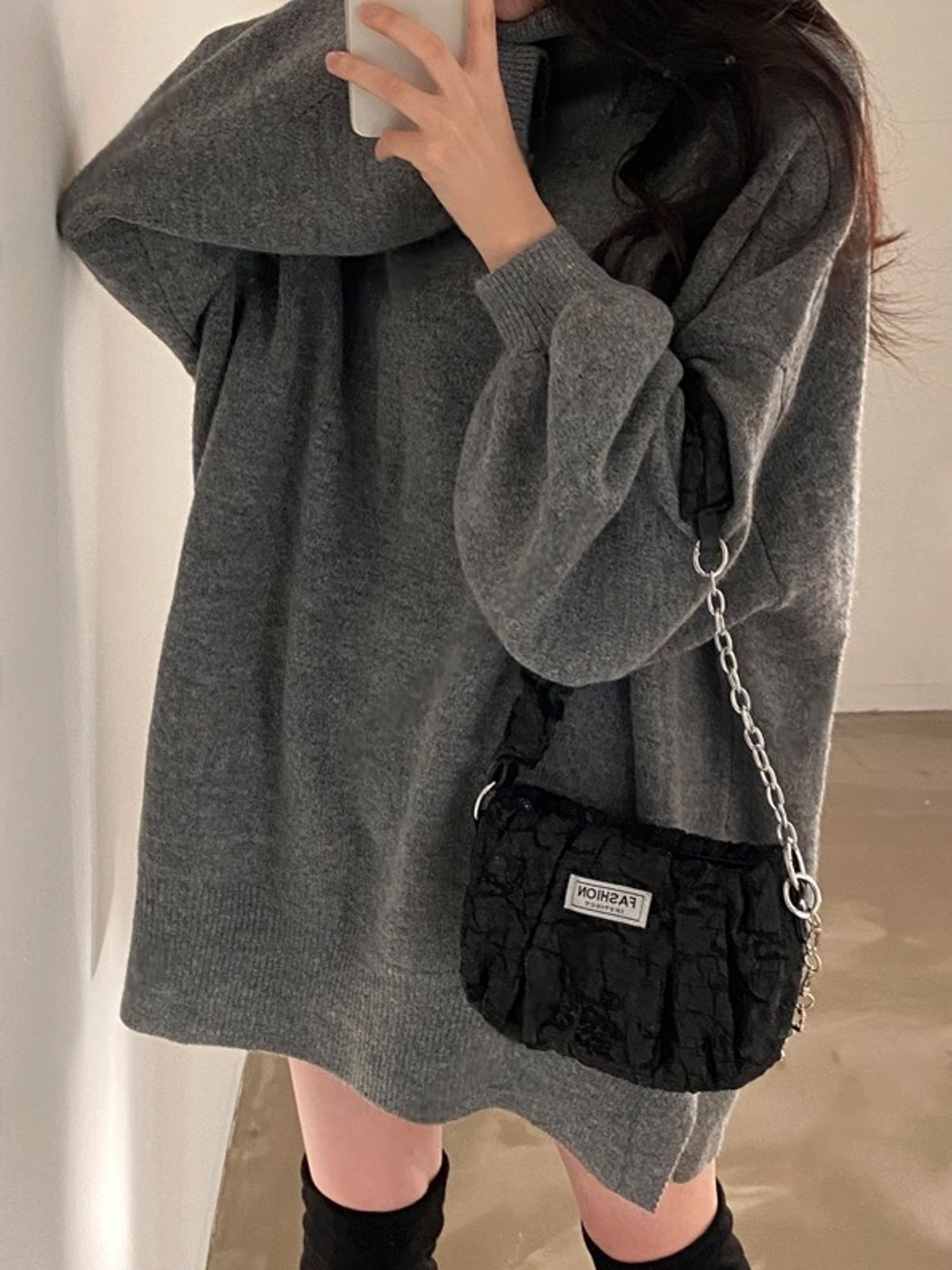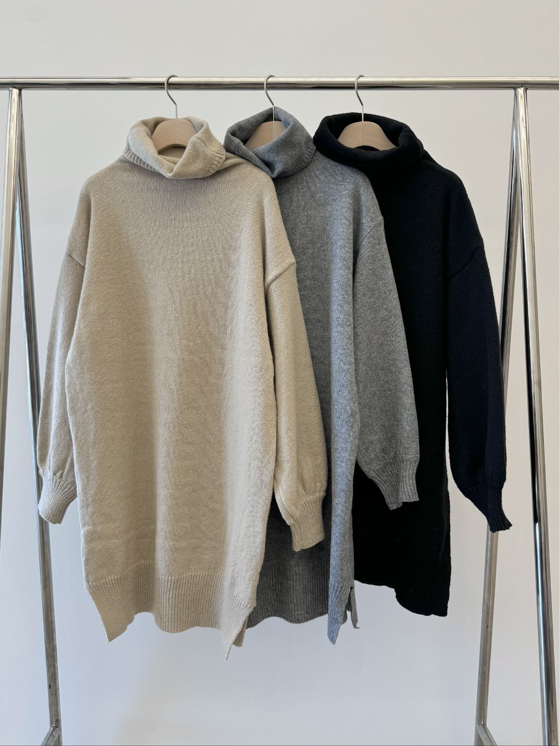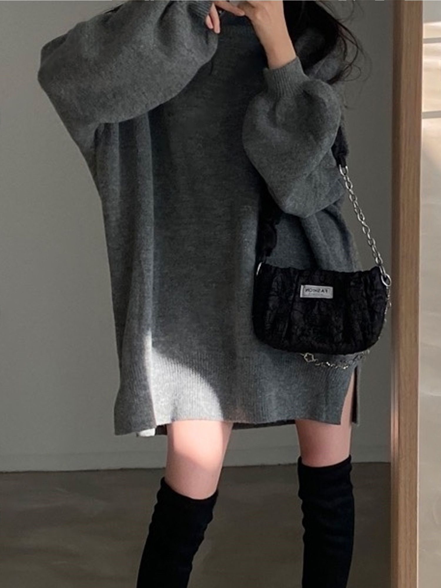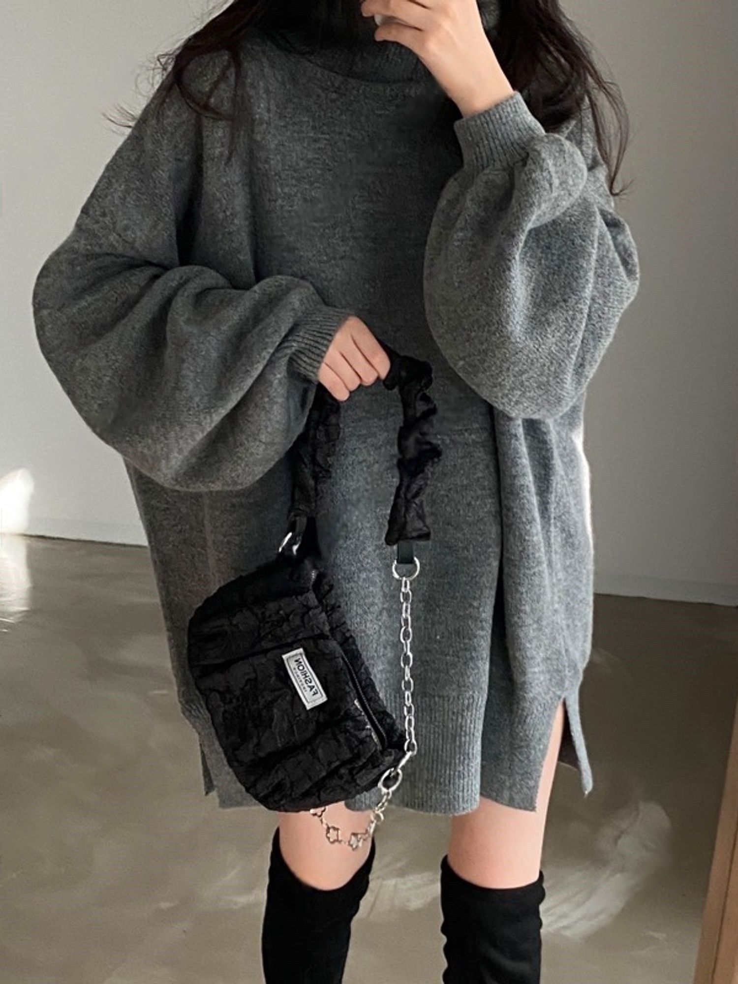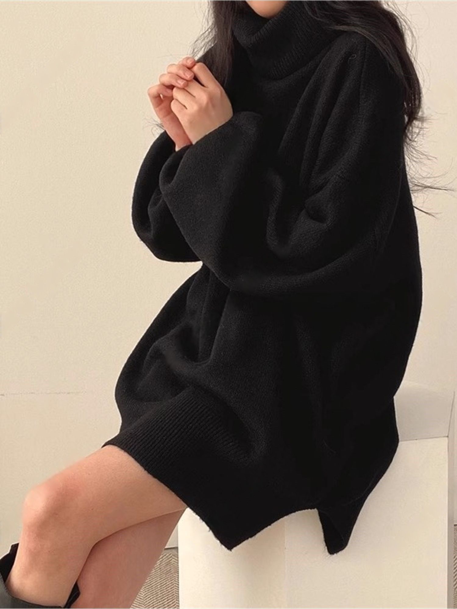 反摺高領/側開衩/直筒版型/落肩袖 - 休閒居家簡約百搭素面針織短洋裝側衩直筒洋裝長袖連身裙針織洋裝灰色米色黑色
