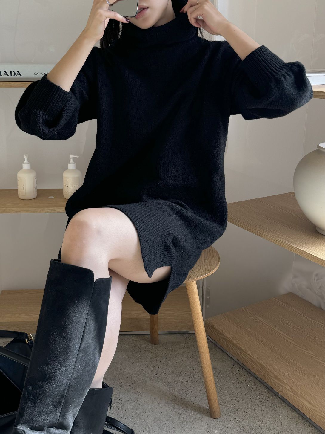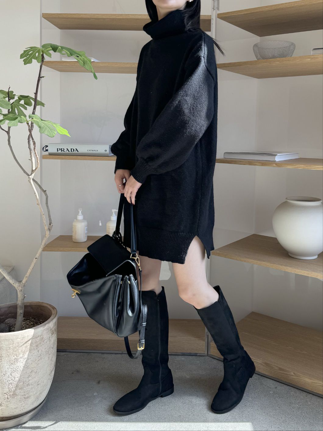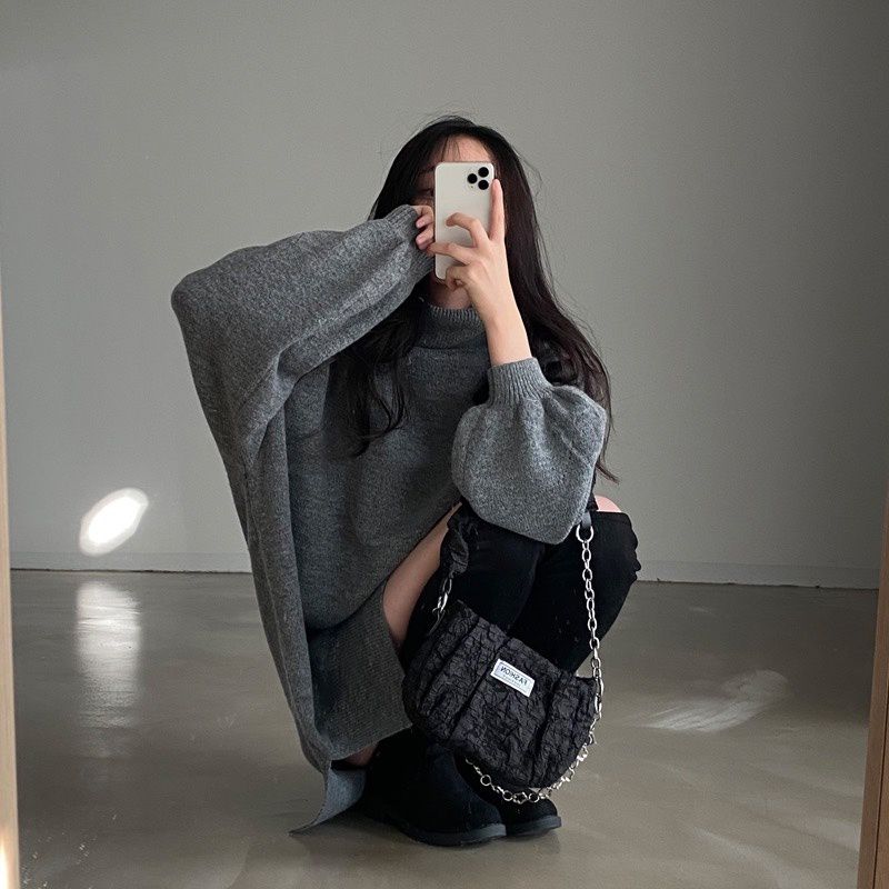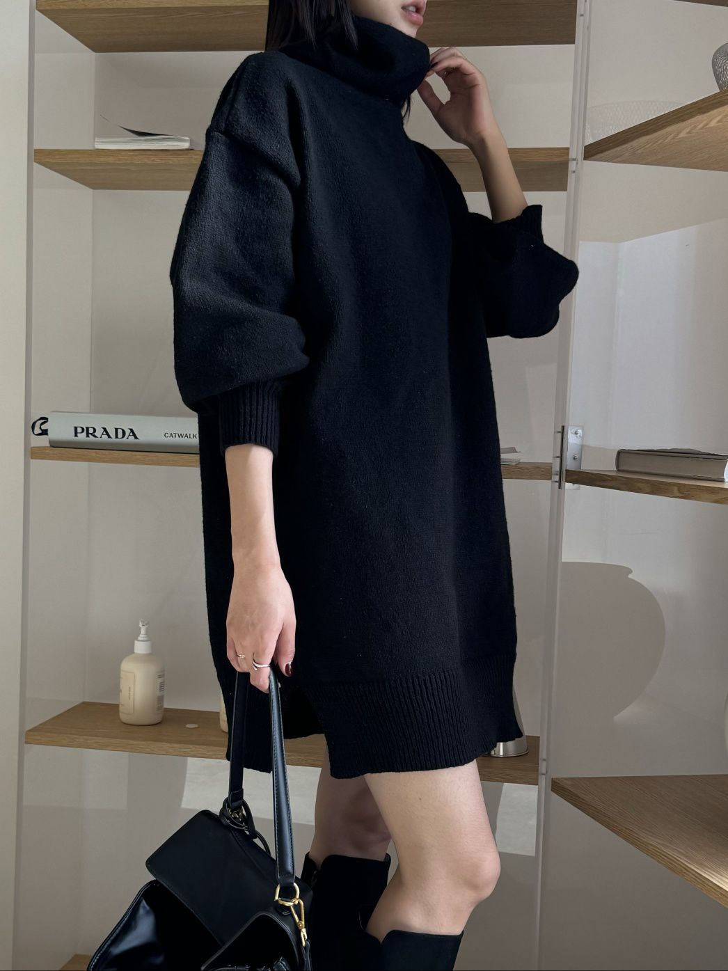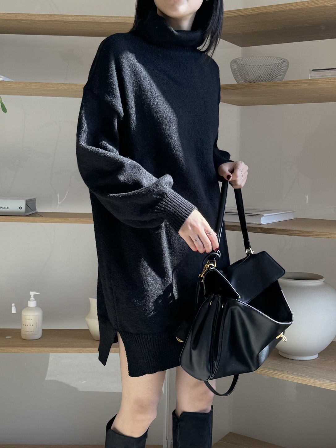 反摺高領/側開衩/直筒版型/落肩袖 - 休閒居家簡約百搭素面針織短洋裝側衩直筒洋裝長袖連身裙針織洋裝灰色米色黑色