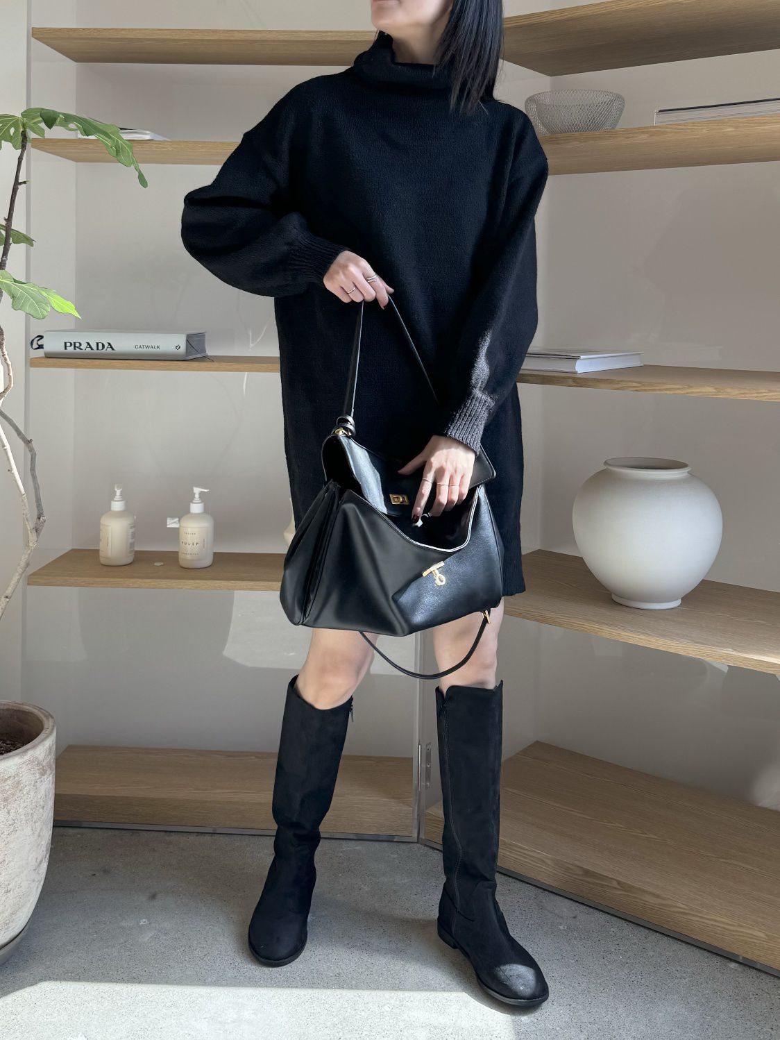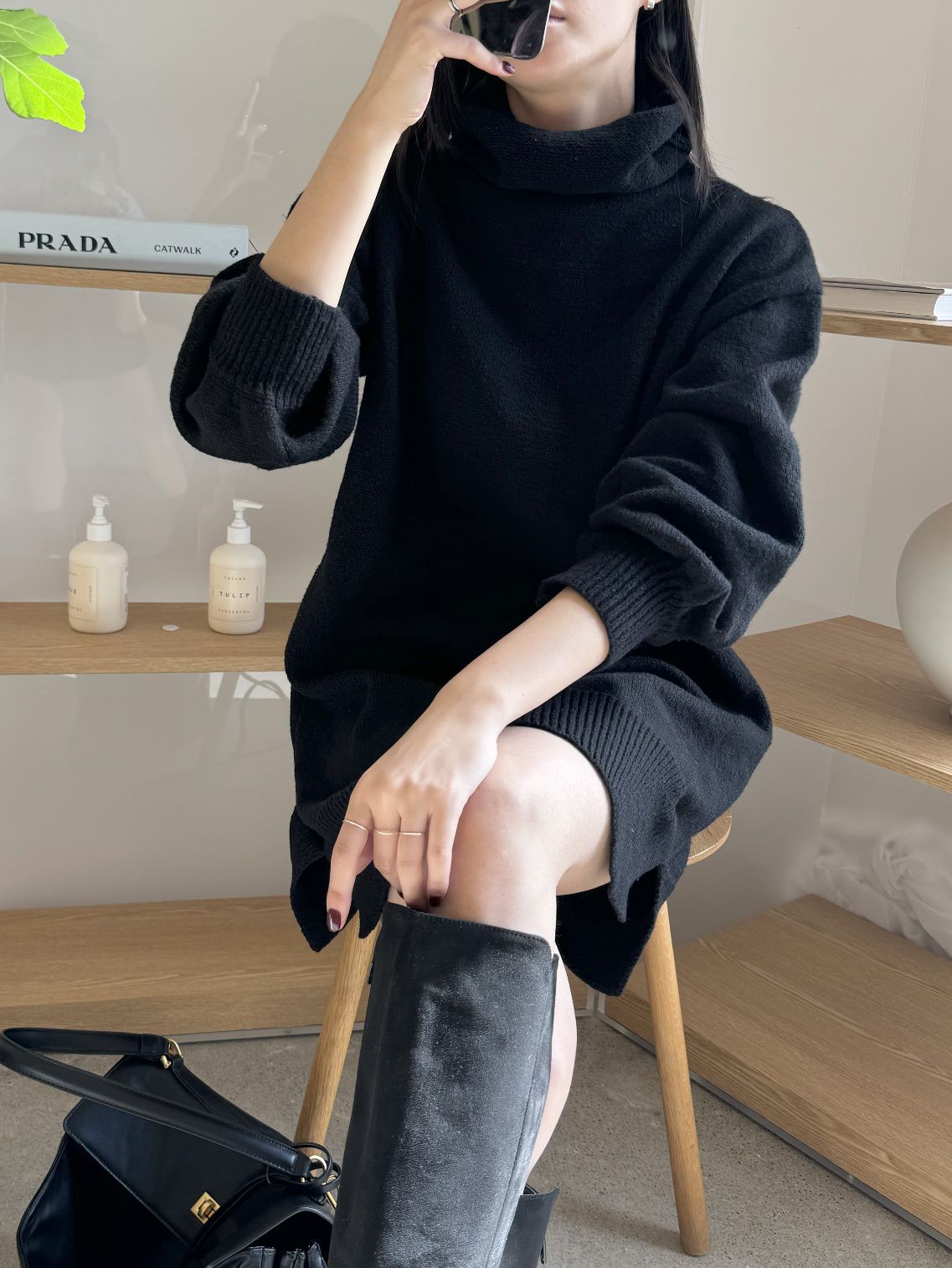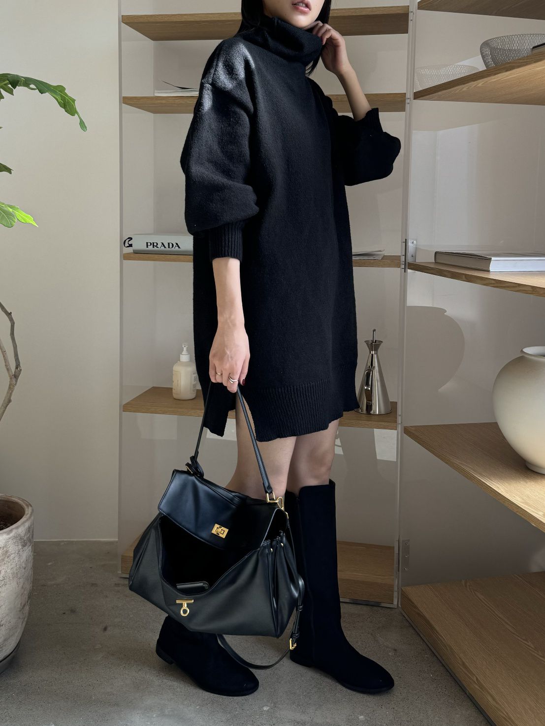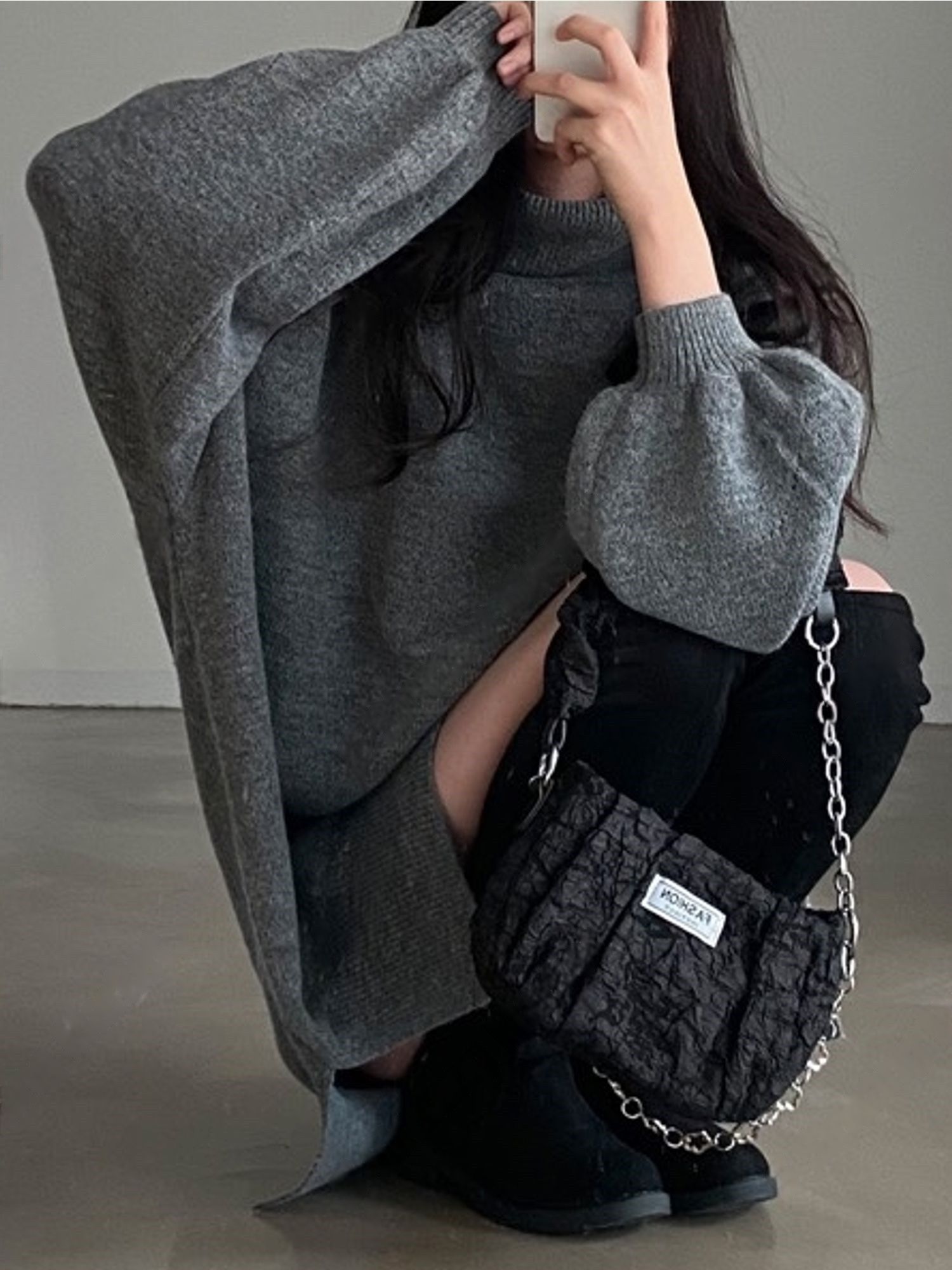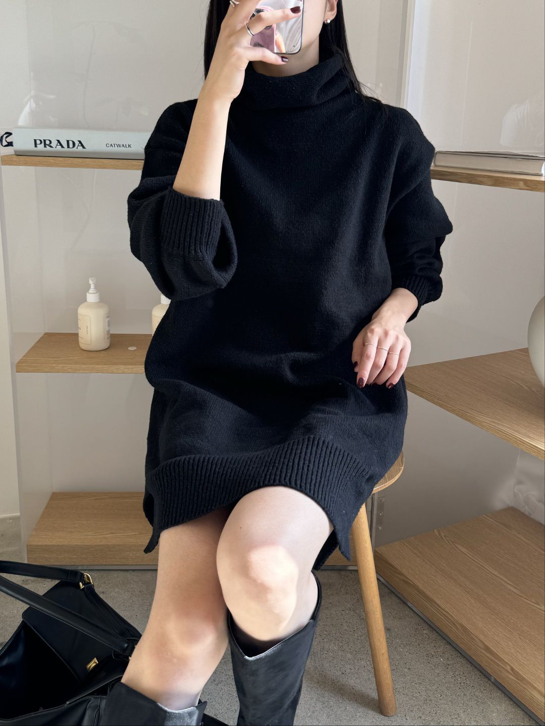 反摺高領/側開衩/直筒版型/落肩袖 - 休閒居家簡約百搭素面針織短洋裝側衩直筒洋裝長袖連身裙針織洋裝灰色米色黑色
