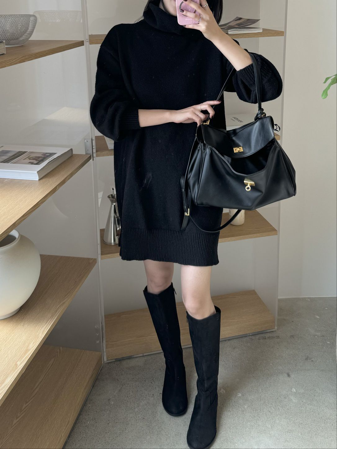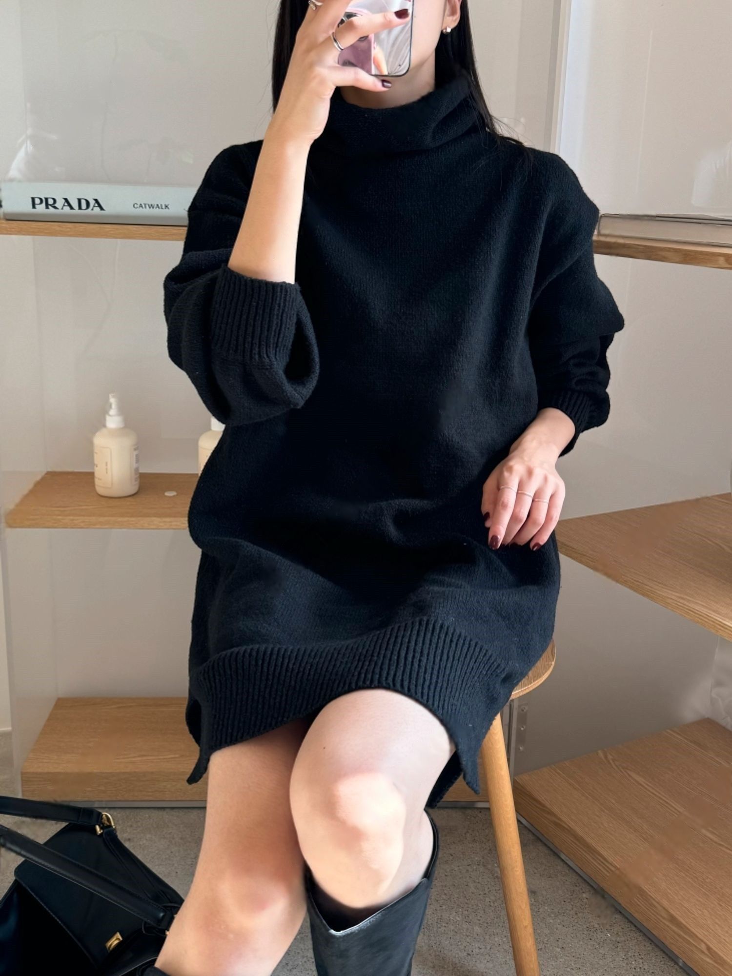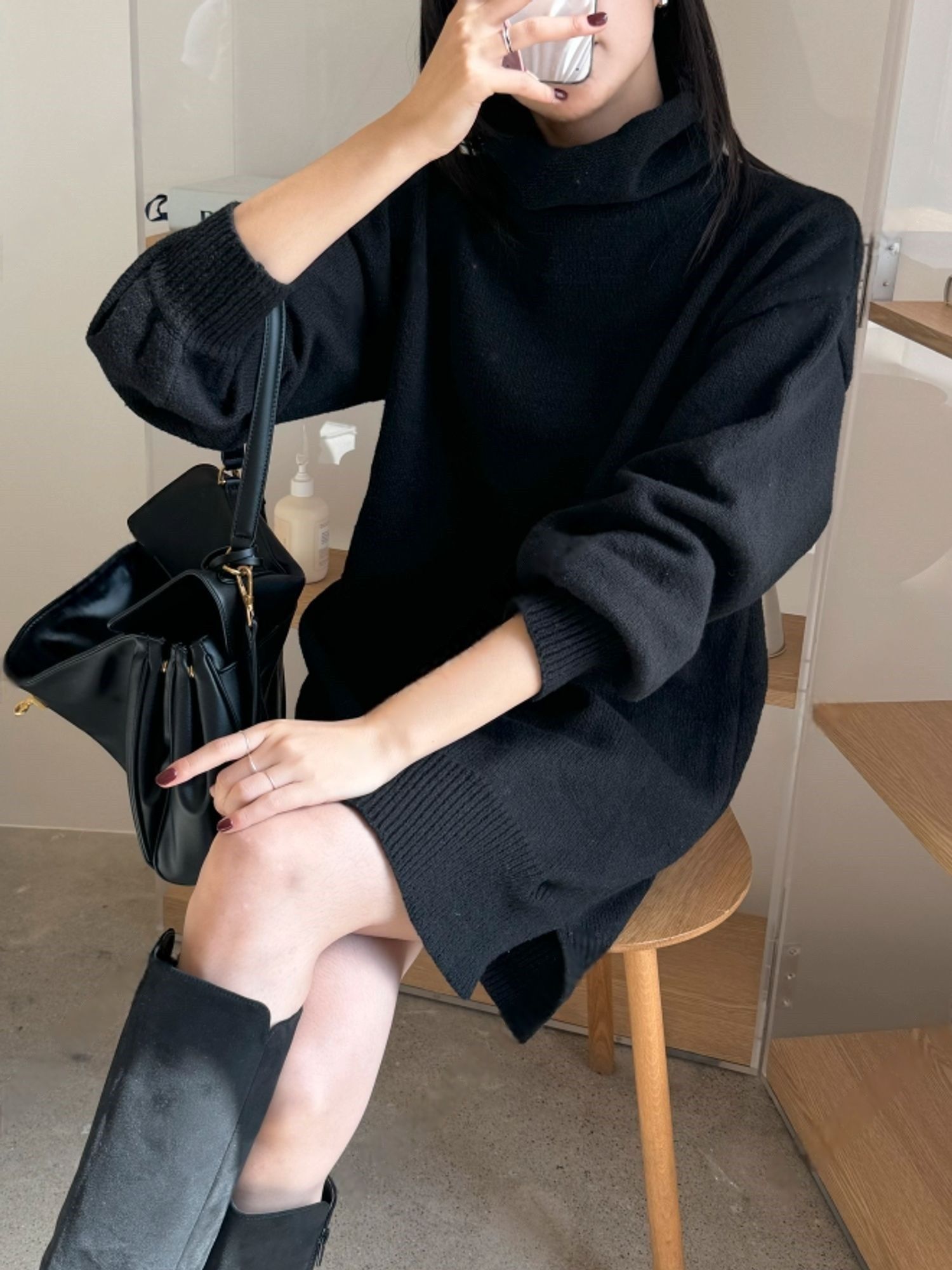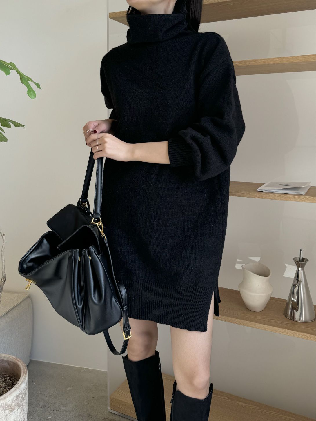 【C53836】韓國MOD 針織短洋裝-素面反摺高領側開衩直筒長袖連身裙★★