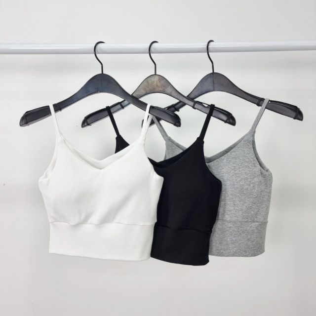 自帶胸墊更方便/彈力極佳/親膚透氣不悶熱-休閒居家簡約百搭短版吊帶素面BRATOP細肩帶輕薄V領無袖上衣背心白色灰色黑色