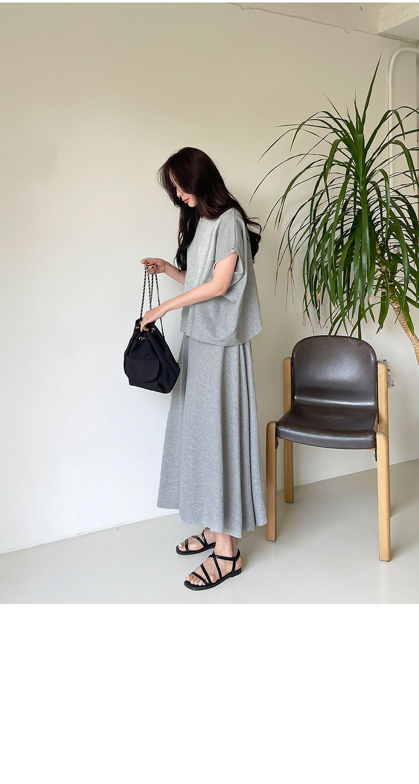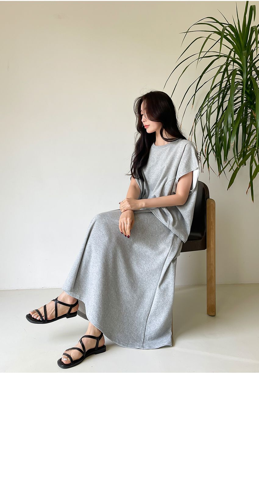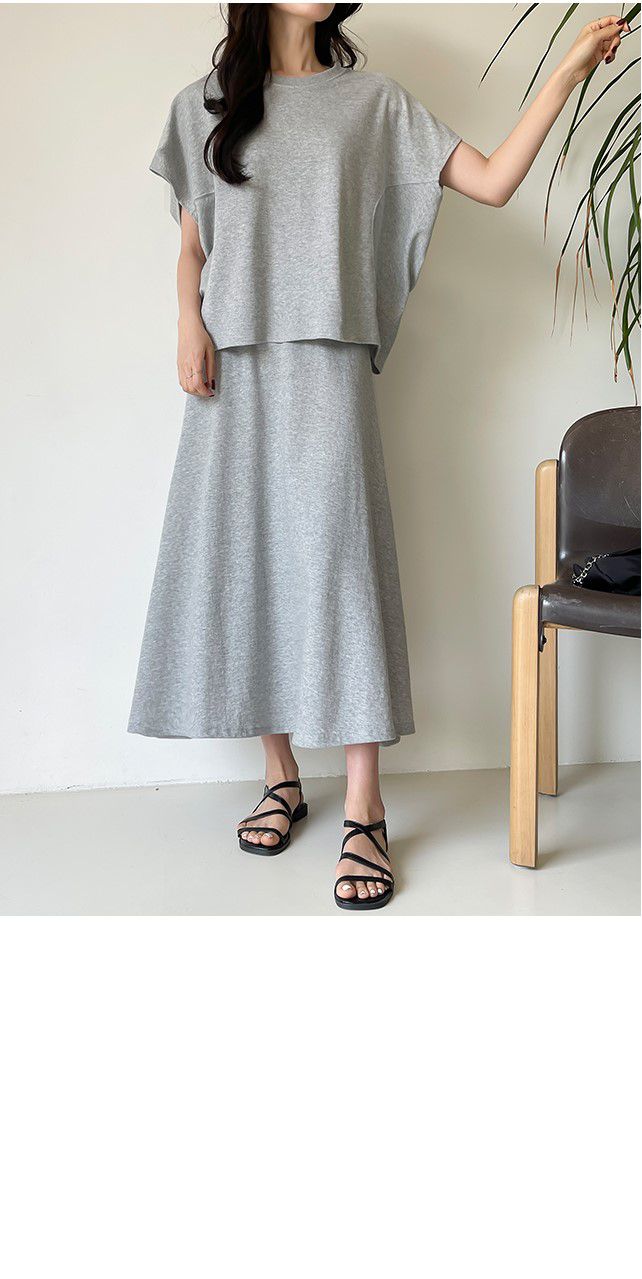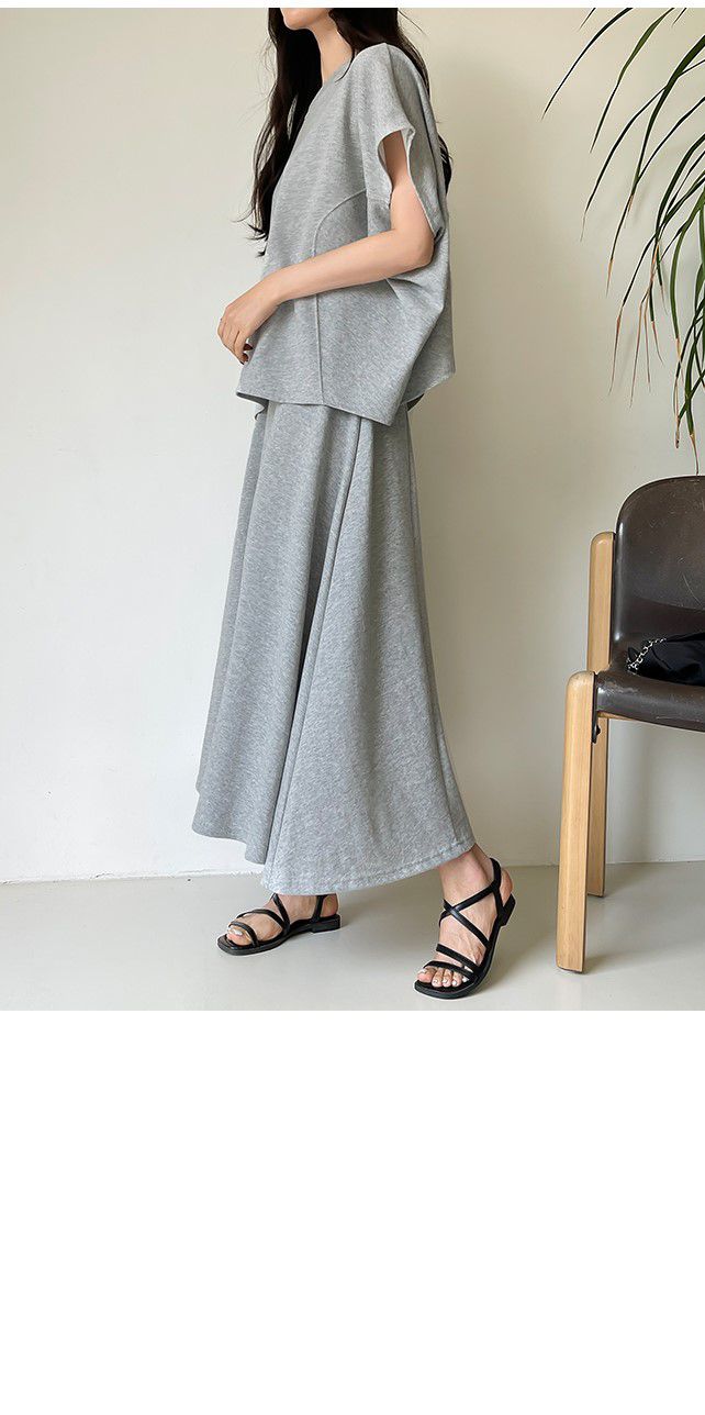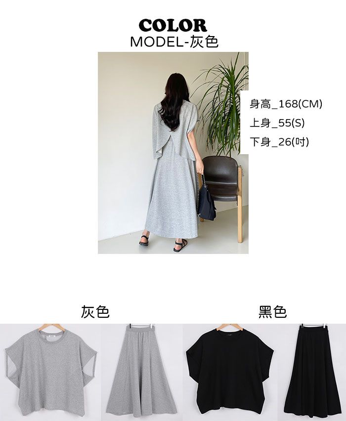 超值兩件組/內切腰線/圓領/連肩袖/後背交叉開衩/寬袖/全腰鬆緊/無口袋花瓣裙 - 休閒居家簡約百搭素面兩件式套裝喇叭裙套裝後開衩飛鼠短袖上衣傘狀長裙灰色黑色