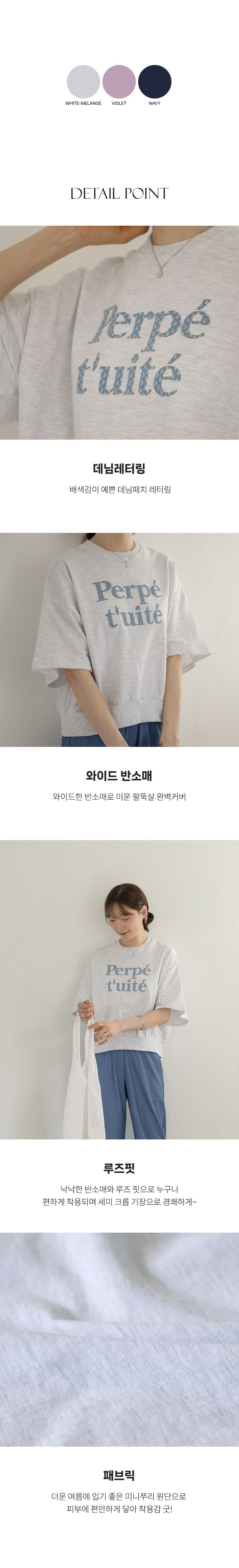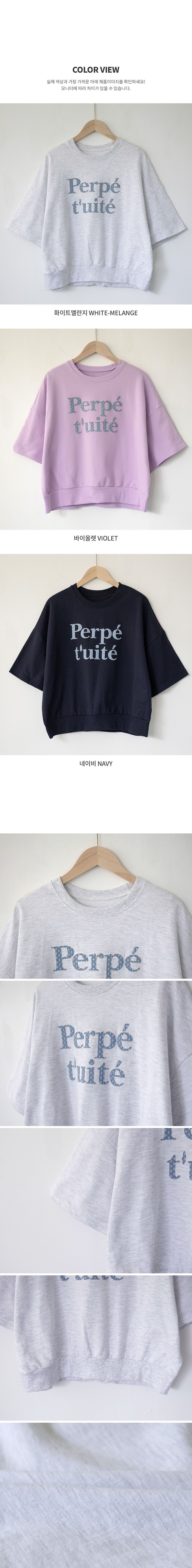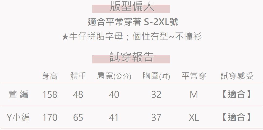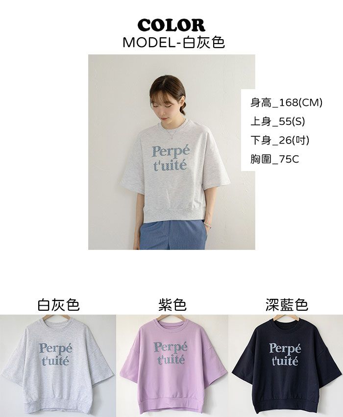 牛仔拼布字母/圓領/寬袖/內裏毛圈棉 - 休閒居家英文字母上衣字母T恤TEE牛仔拼字上衣立體貼布英文寬鬆大尺碼上衣五分袖上衣白灰色紫色深藍色