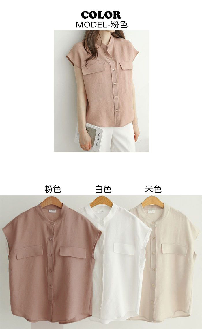【C54647】韓國DAI 素面假口袋襯衫-前短後長V領鈕釦開襟短袖上衣★★