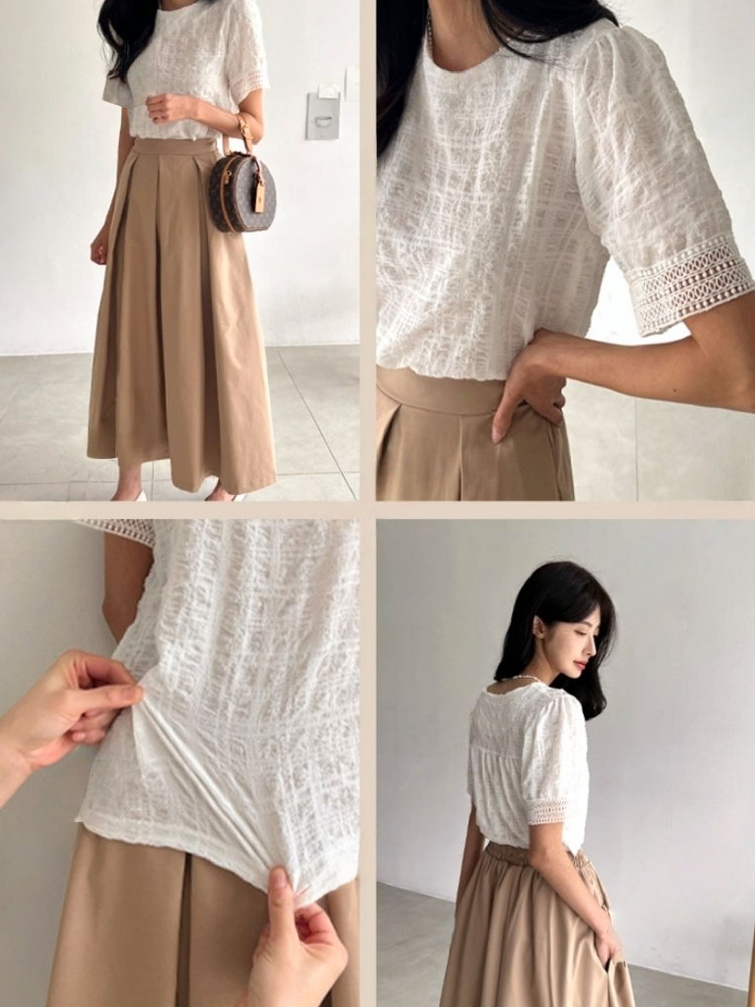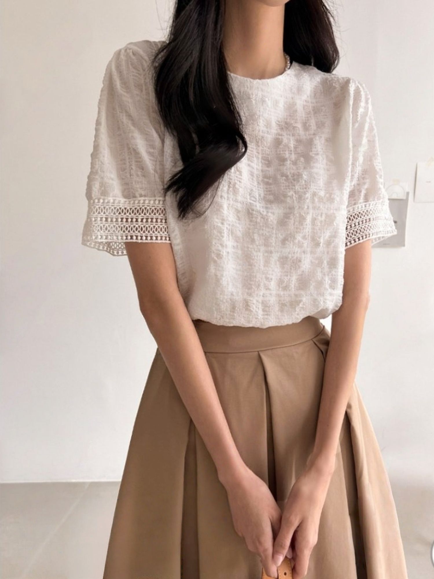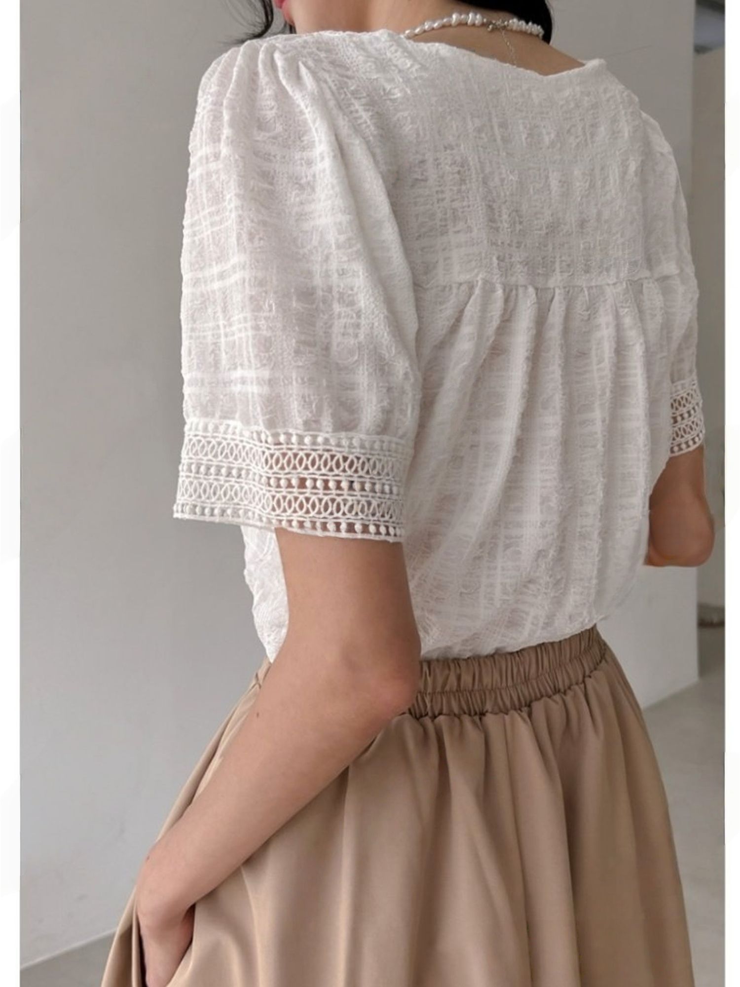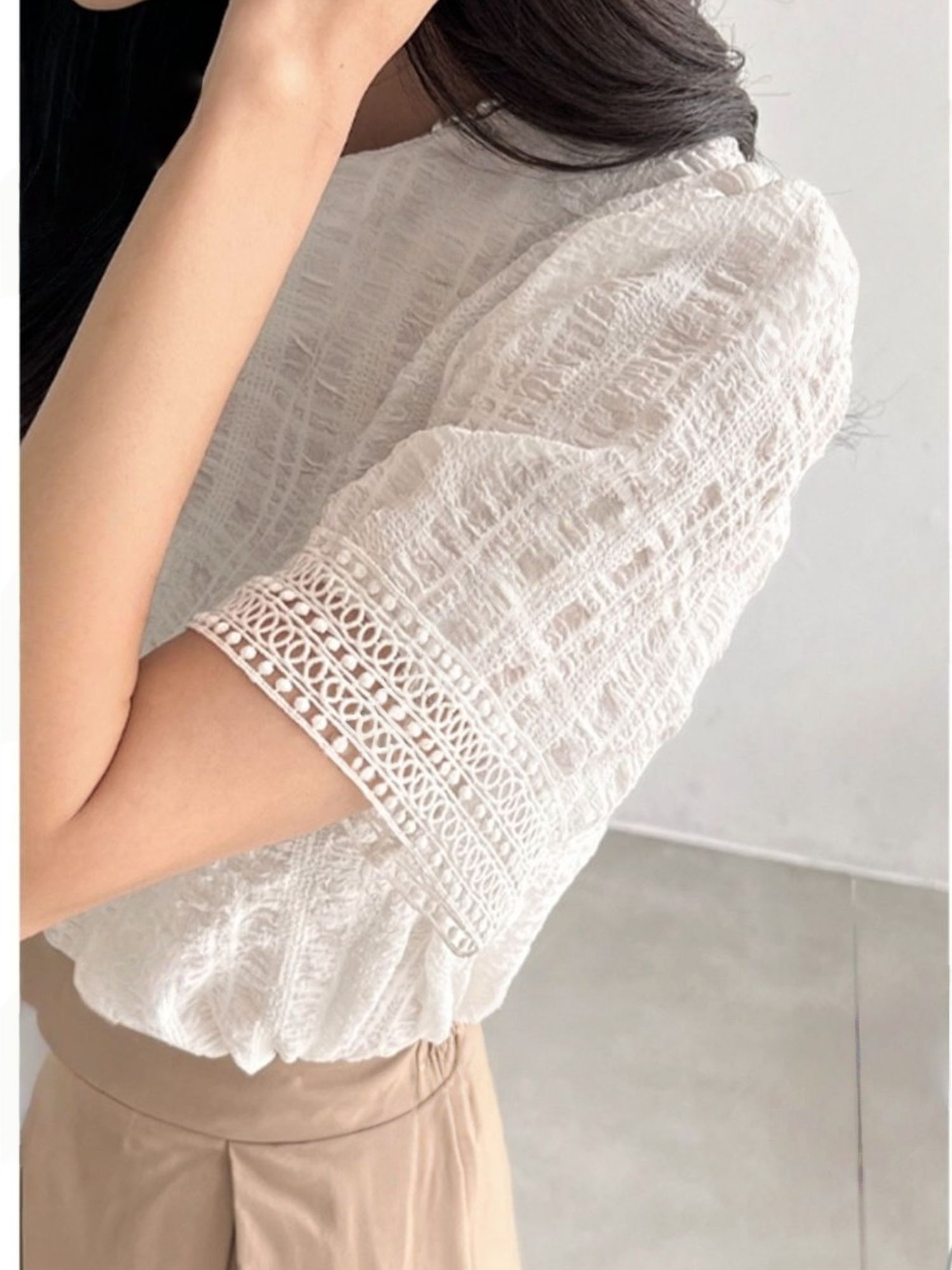 【C54780】韓國COS 泡泡紗寬袖上衣-素面婚禮圓領縷空雕花滾邊短袖