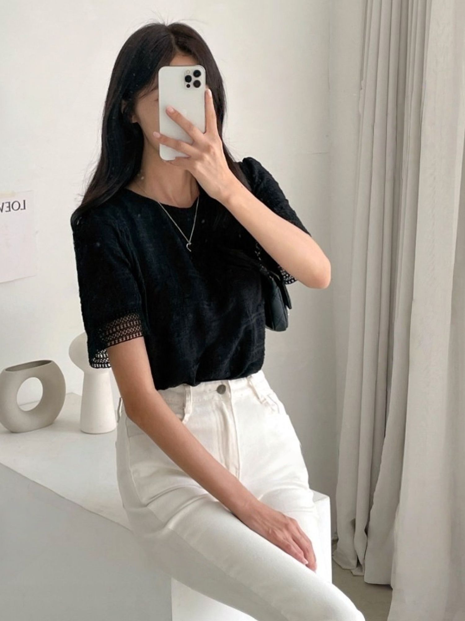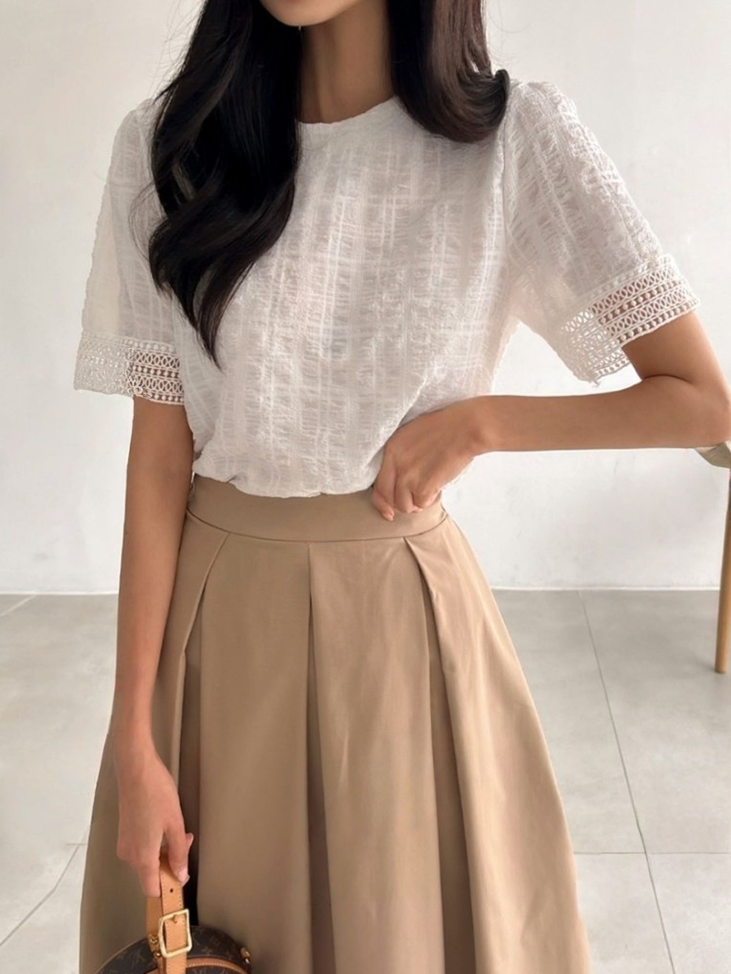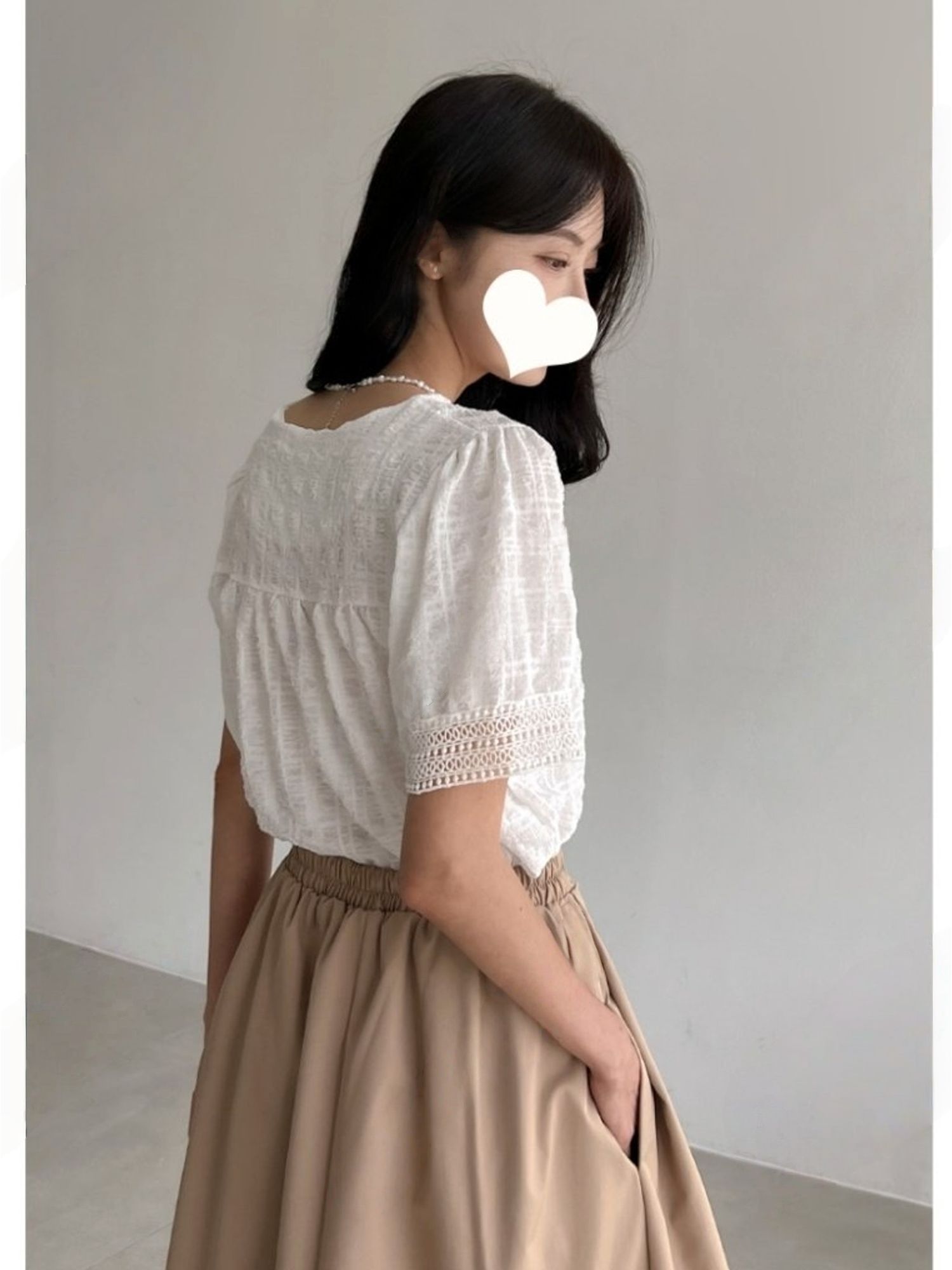【C54780】韓國COS 泡泡紗寬袖上衣-素面婚禮圓領縷空雕花滾邊短袖
