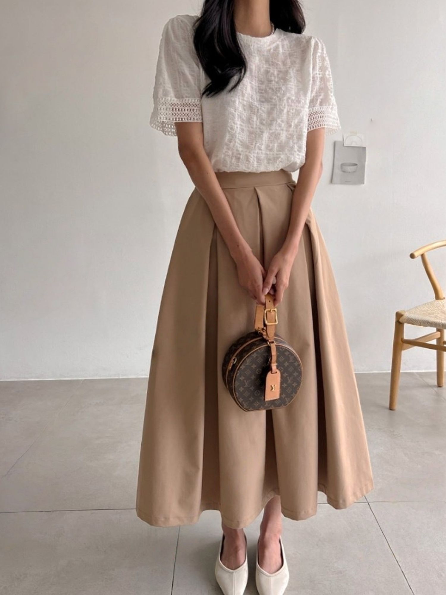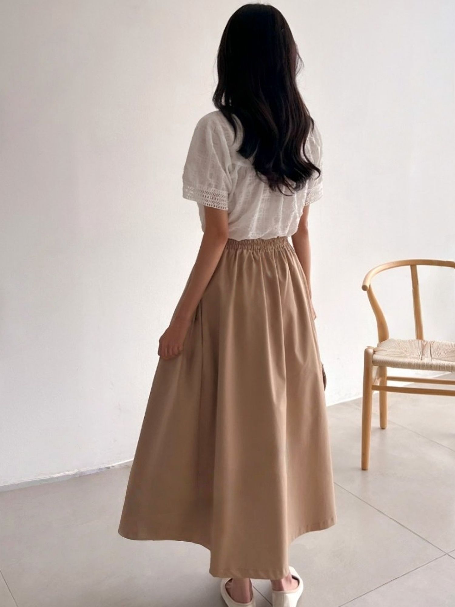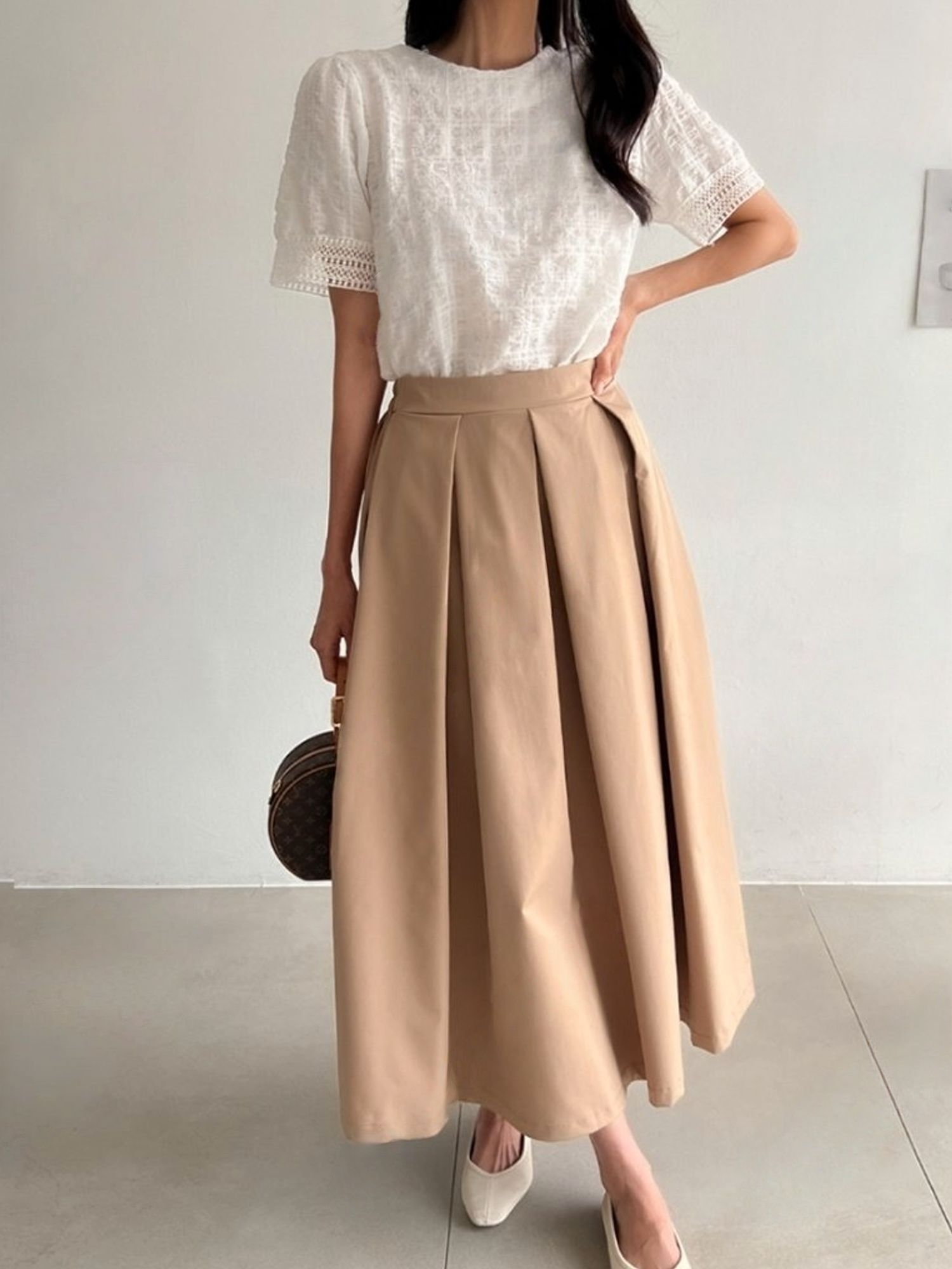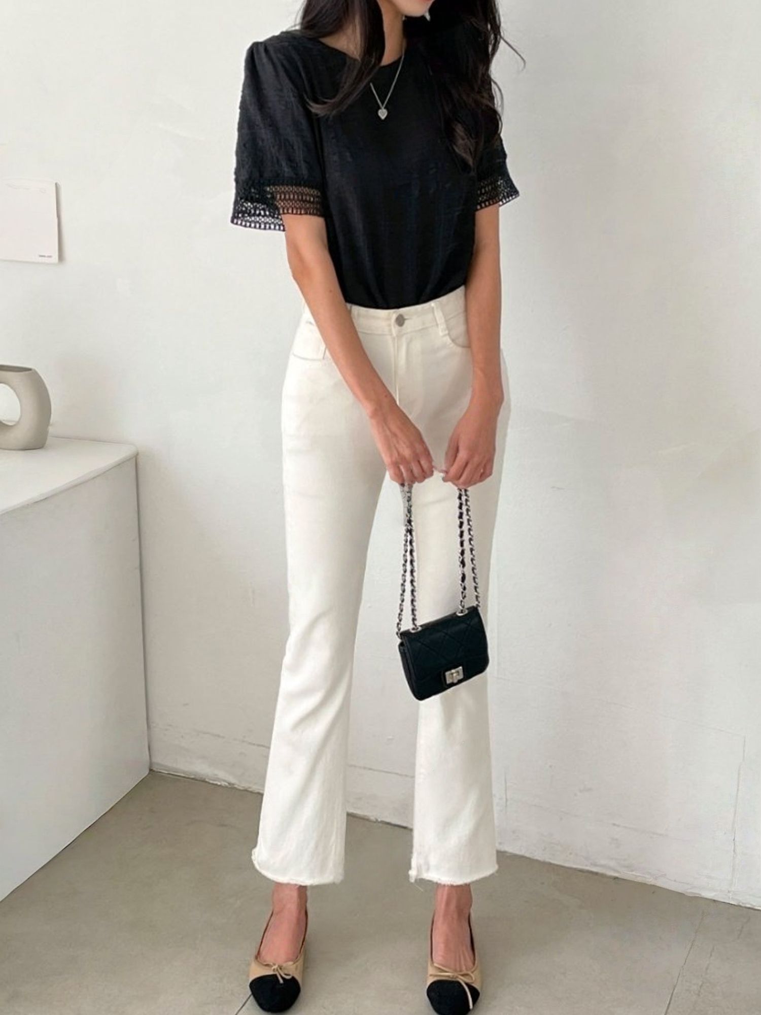 【C54780】韓國COS 泡泡紗寬袖上衣-素面婚禮圓領縷空雕花滾邊短袖
