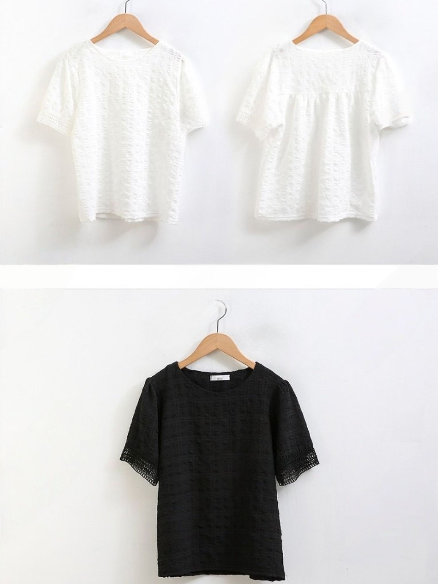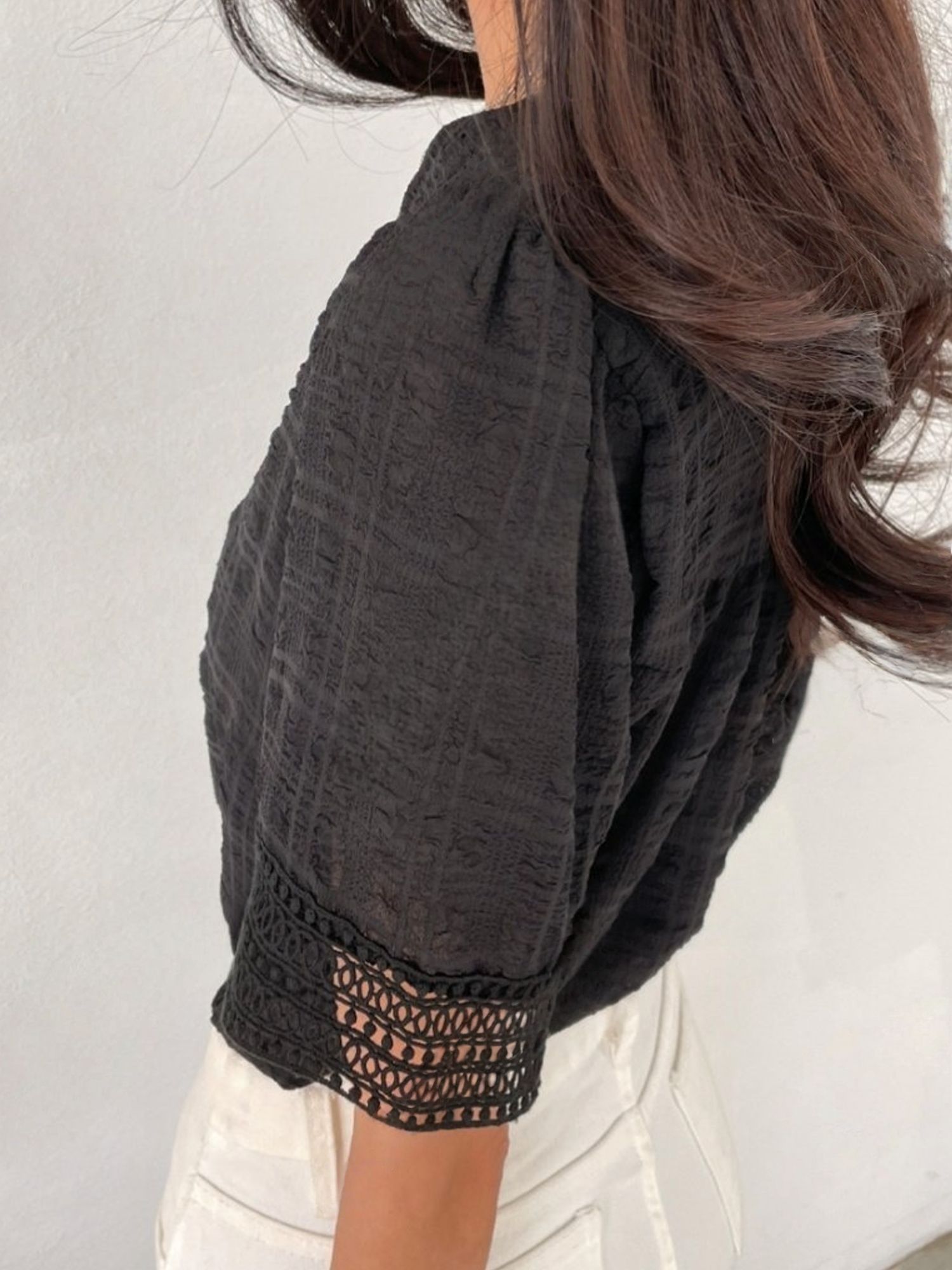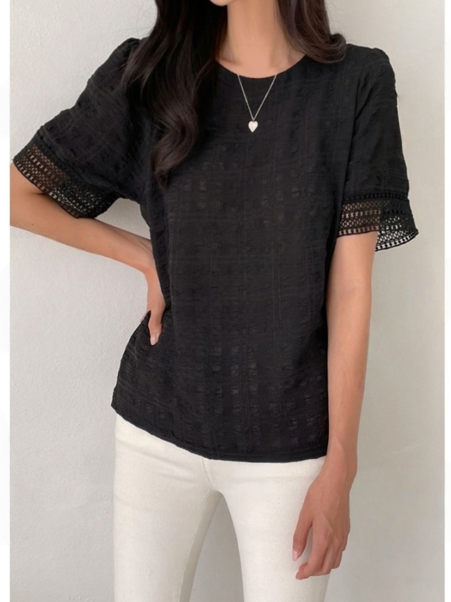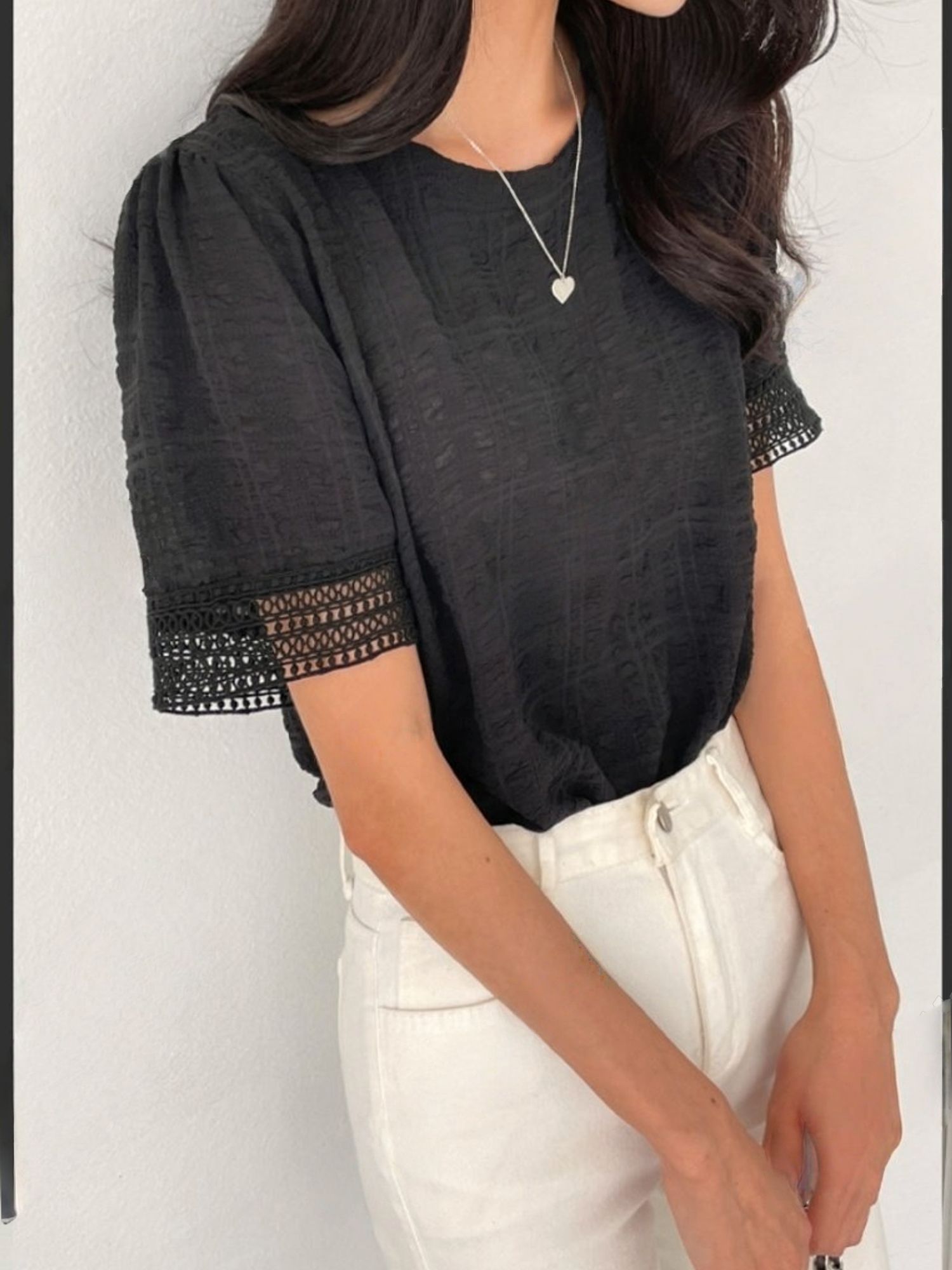 抗皺泡泡紗/蕾絲滾邊/圓領/縷空雕花滾邊/公主袖 - 休閒婚禮簡約百搭素面泡泡紗寬袖上衣短袖上衣黑色白色