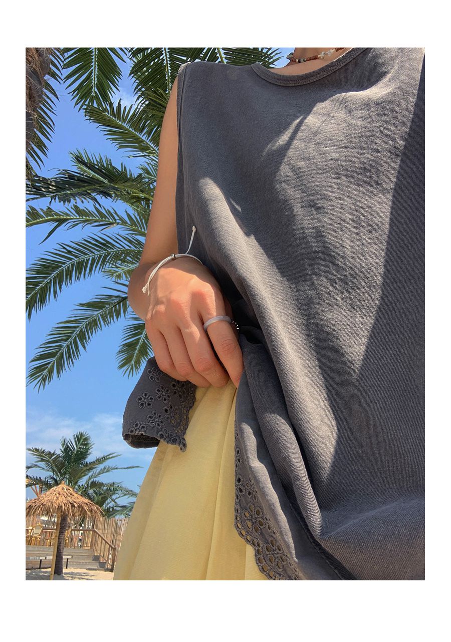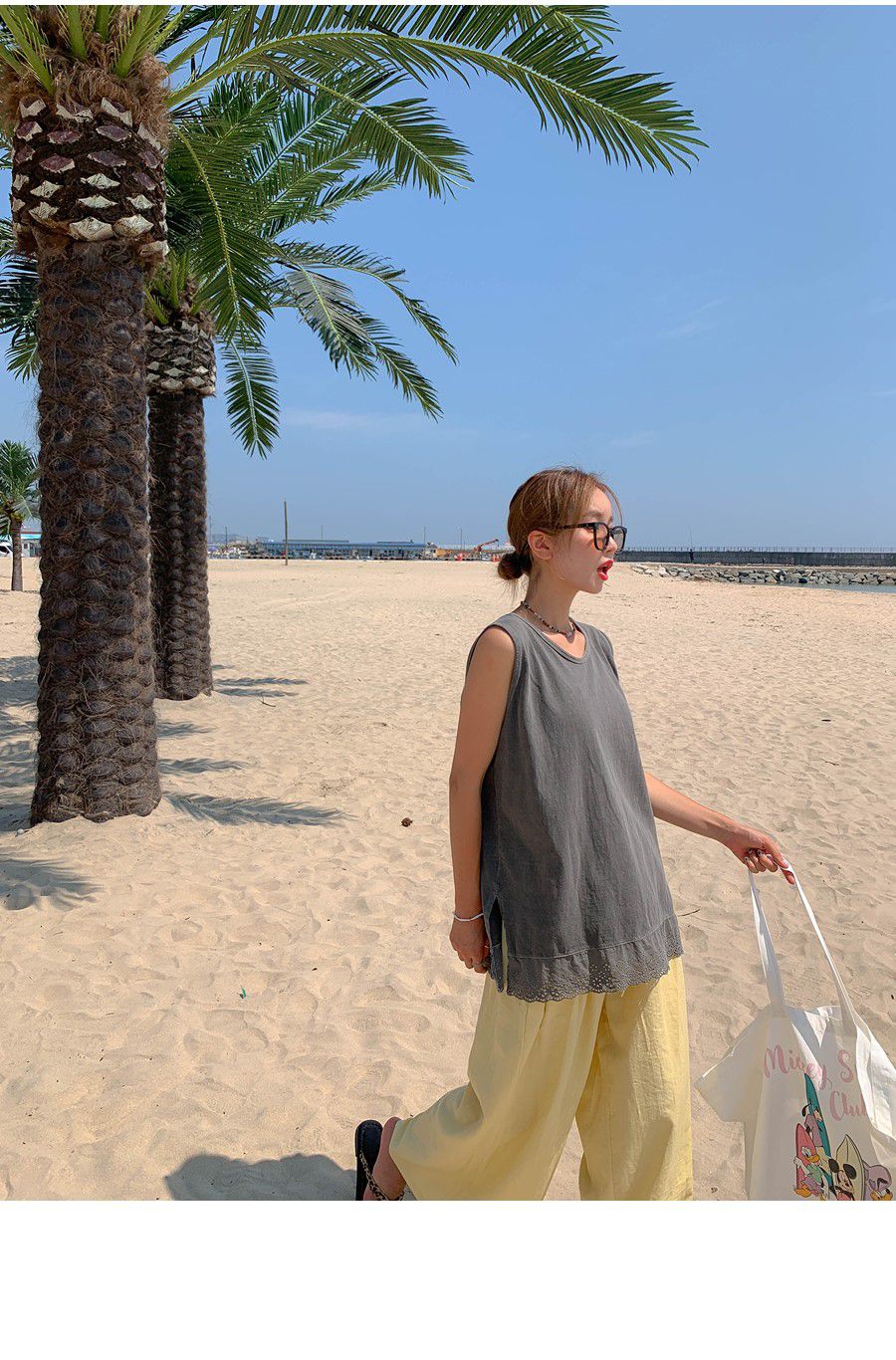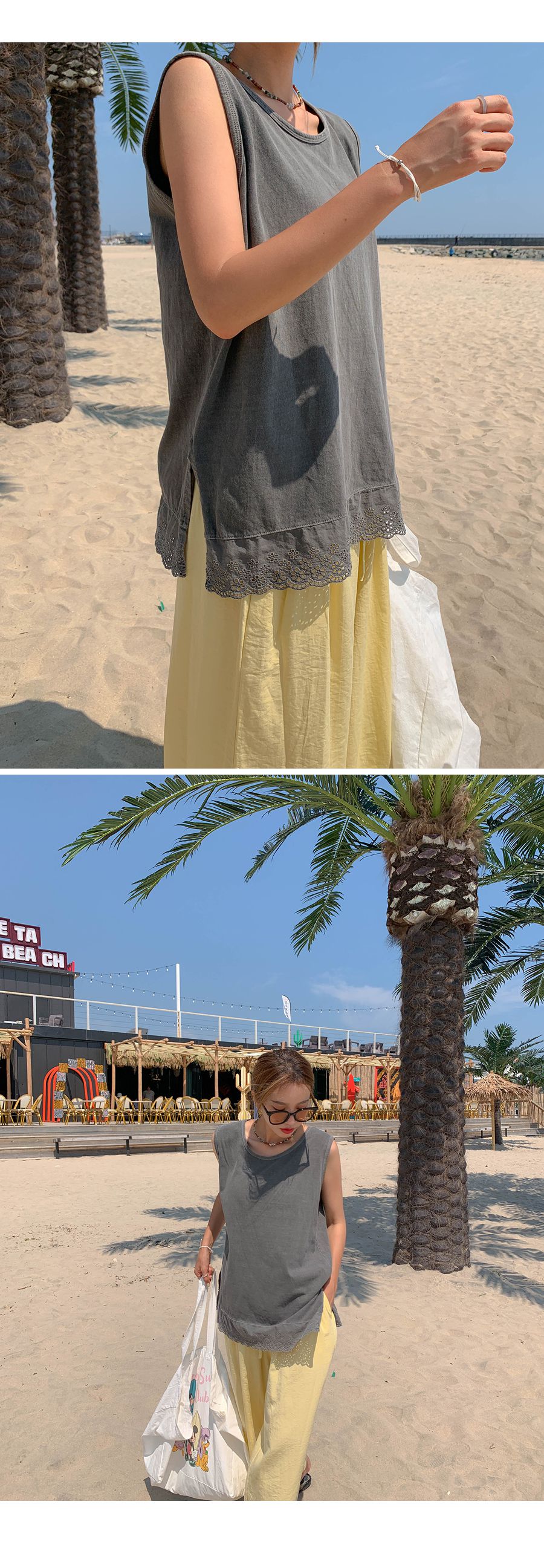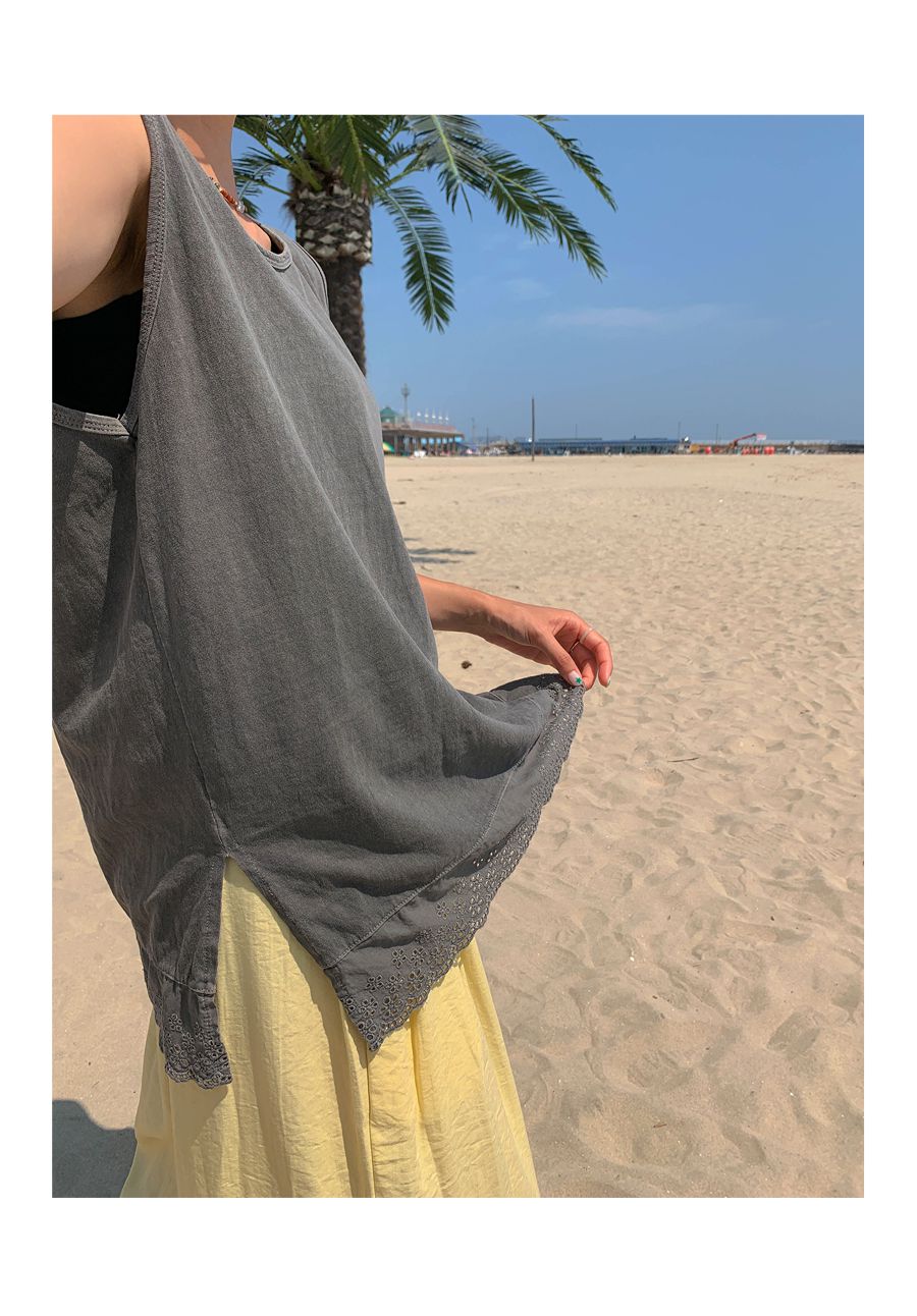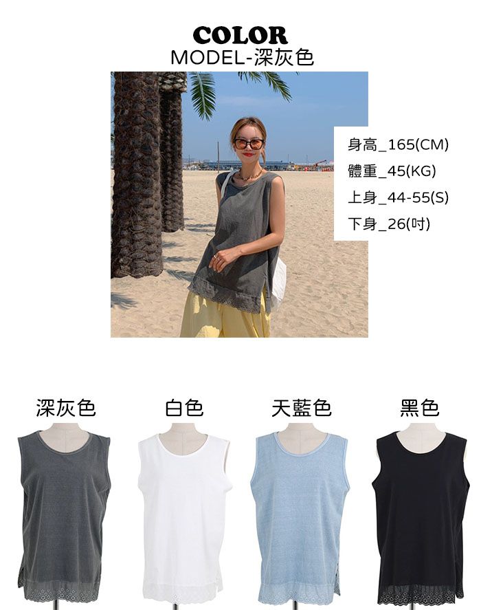 【C54955】韓國LLN 蕾絲花邊背心-素面水洗棉U領長版側開衩無袖上衣