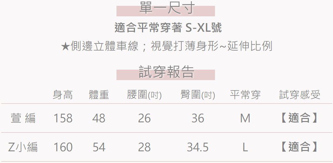 尺寸(cm) | 腰寬 | 臀寬 | 前檔 | 大腿寬 | 褲管寬 | 全長 | FREE | 34~40 | 49 | 32 | 29 | 27 | 100 | 材質 | 產地 | 透光度 | 厚度 | 彈性情況 | 備註 | 建議洗滌 | 聚酯混 彈性 | 中國 | 不透 | 適中 | 輕微彈性 | 側口袋 | 手洗乾洗 |