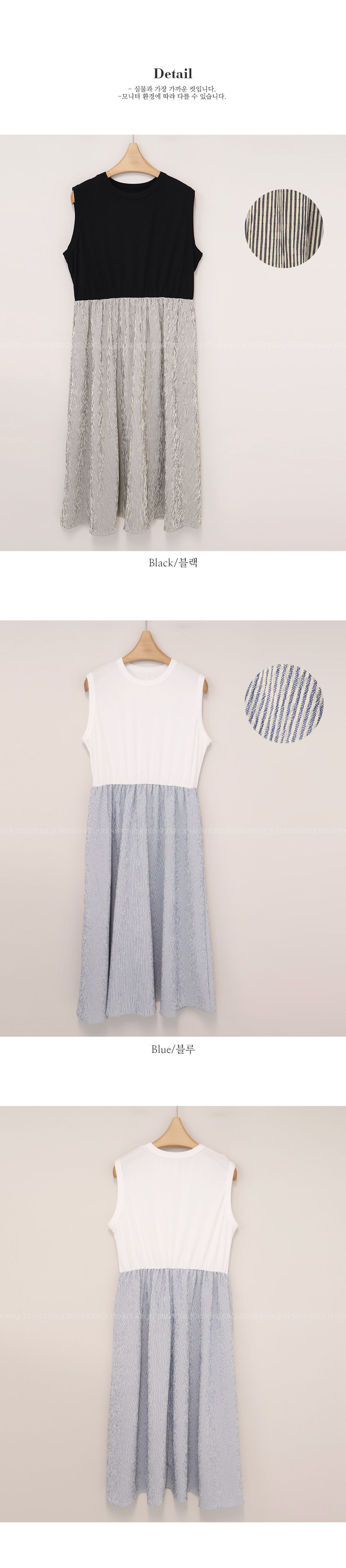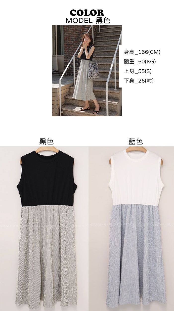 兩種尺寸/背心洋裝/圓領/假兩件拼接/雙口袋/寬肩無袖 - 休閒居家渡假配色條紋洋裝一件式洋裝條紋拼接洋裝無袖連身裙黑色藍色多尺寸LXL黑色藍色