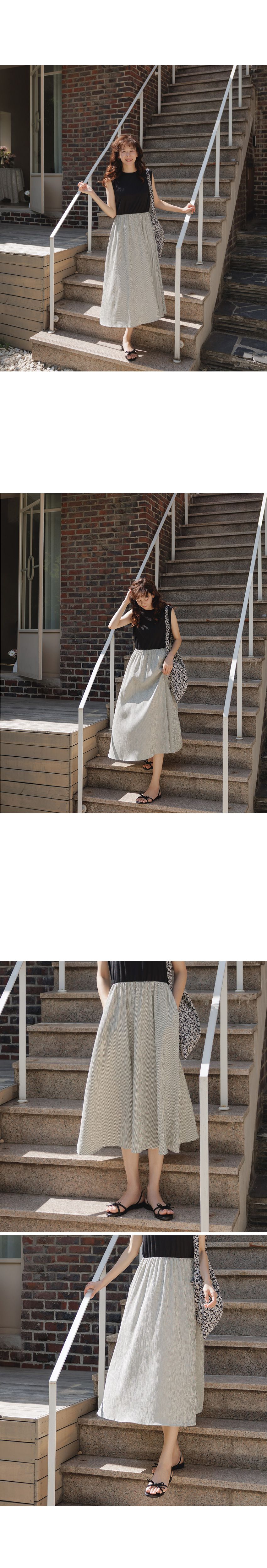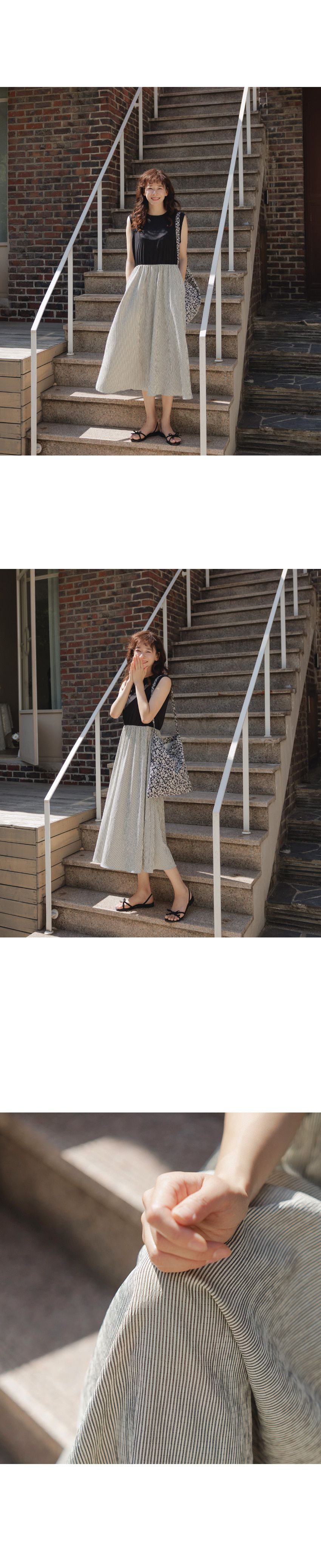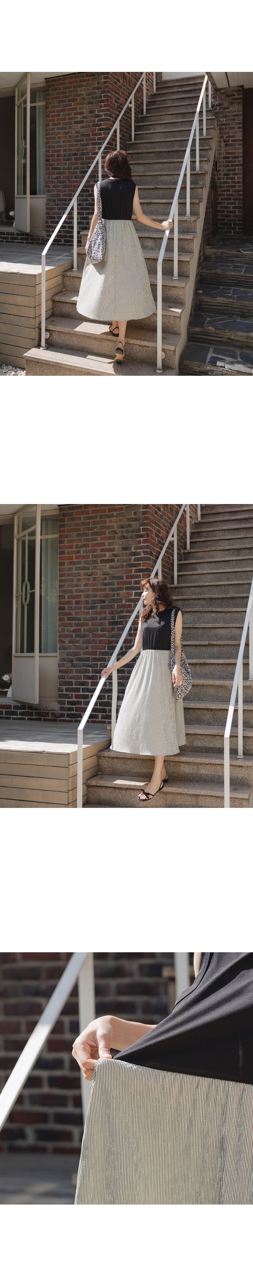 【C54961】韓國QUS 條紋拼接洋裝-圓領假兩件雙口袋寬肩無袖連身裙★★