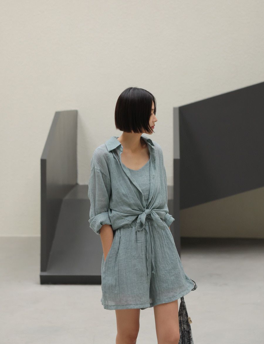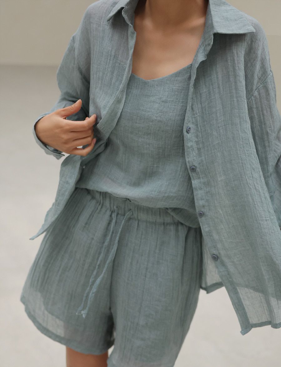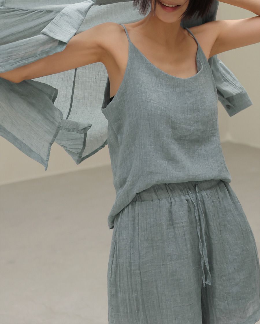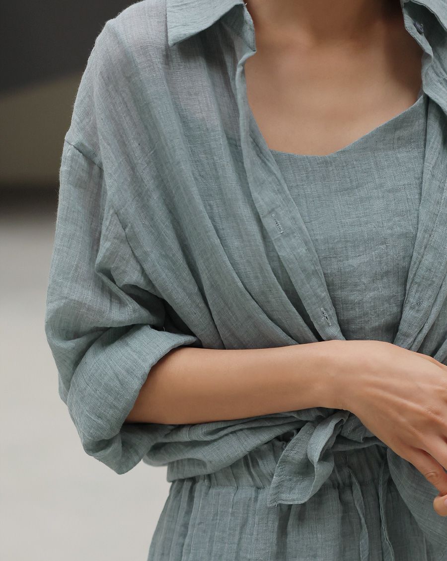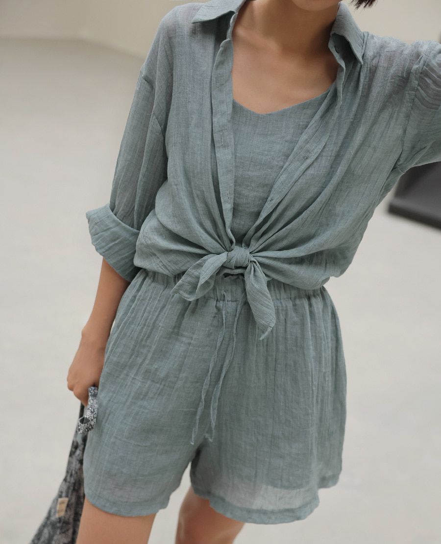 這款亞麻三件套裝 是夏天衣櫃裡最值得擁有的一組 輕盈、俐落又充滿呼吸感 由吊帶背心、長袖襯衫外套 以及素面短褲組成 一套就能輕鬆解決「今天要穿什麼」的煩惱! - 亞麻混棉的布料透氣又柔軟 穿上身有種自然的涼感 帶著一點慵懶的波紋質地 更增添了生活的時尚氣息~ 吊帶背心單穿就很俐落性感 而且可以正 / 反兩穿實在很貼心~ 加上長袖外套一罩瞬間變得氣質又不失自在 綁在腰間更顯歐系女孩的自在俐落 短褲鬆緊腰設計讓比例更修長,活動也超舒適 - 適合散步的午後、出遊的假日 或咖啡廳裡的微風午後 這套衣服都能讓你看起來自然又有品味~ 隨手一穿就像度假回來一樣放鬆
