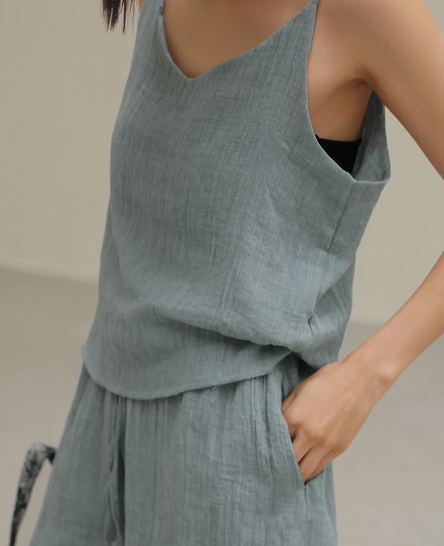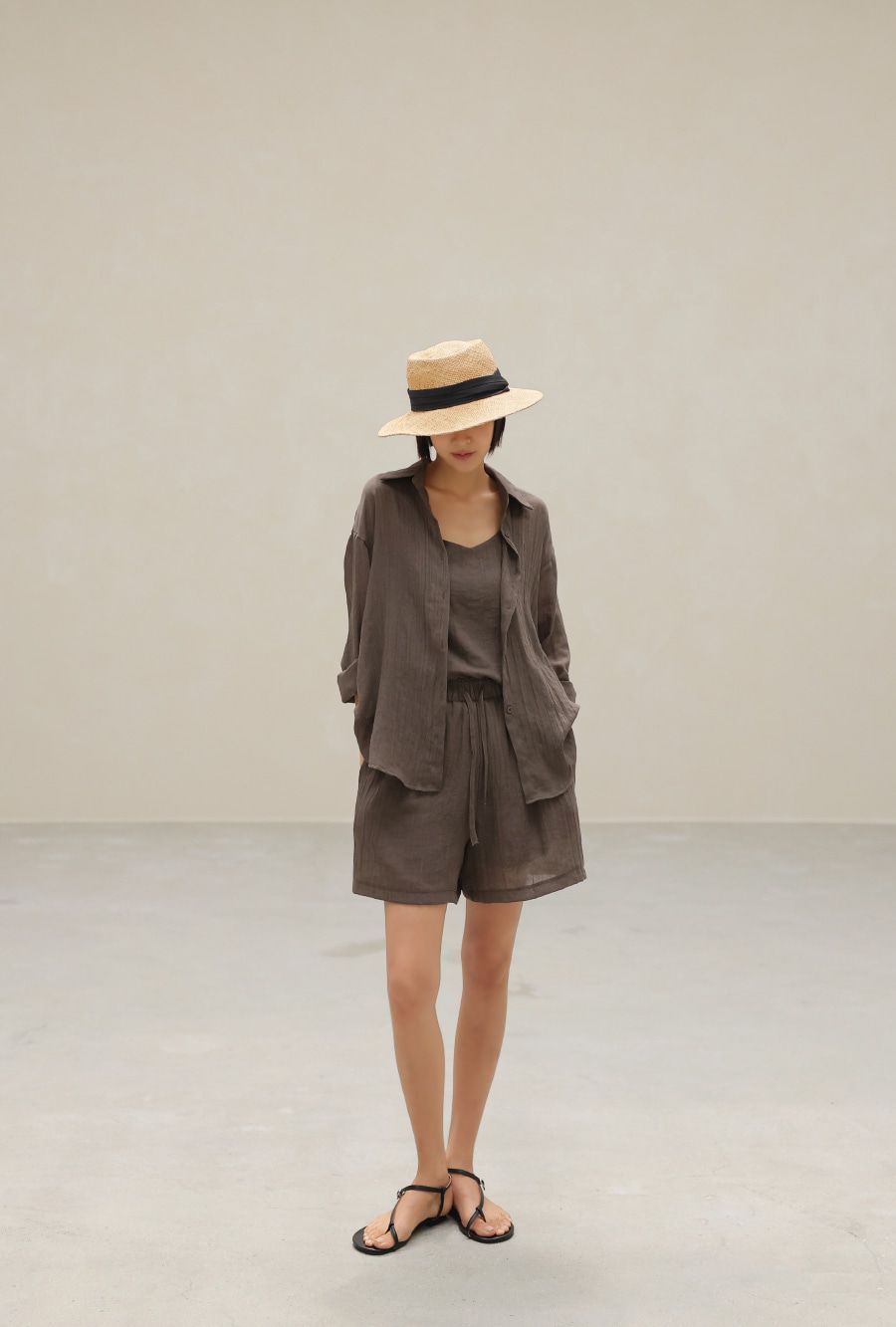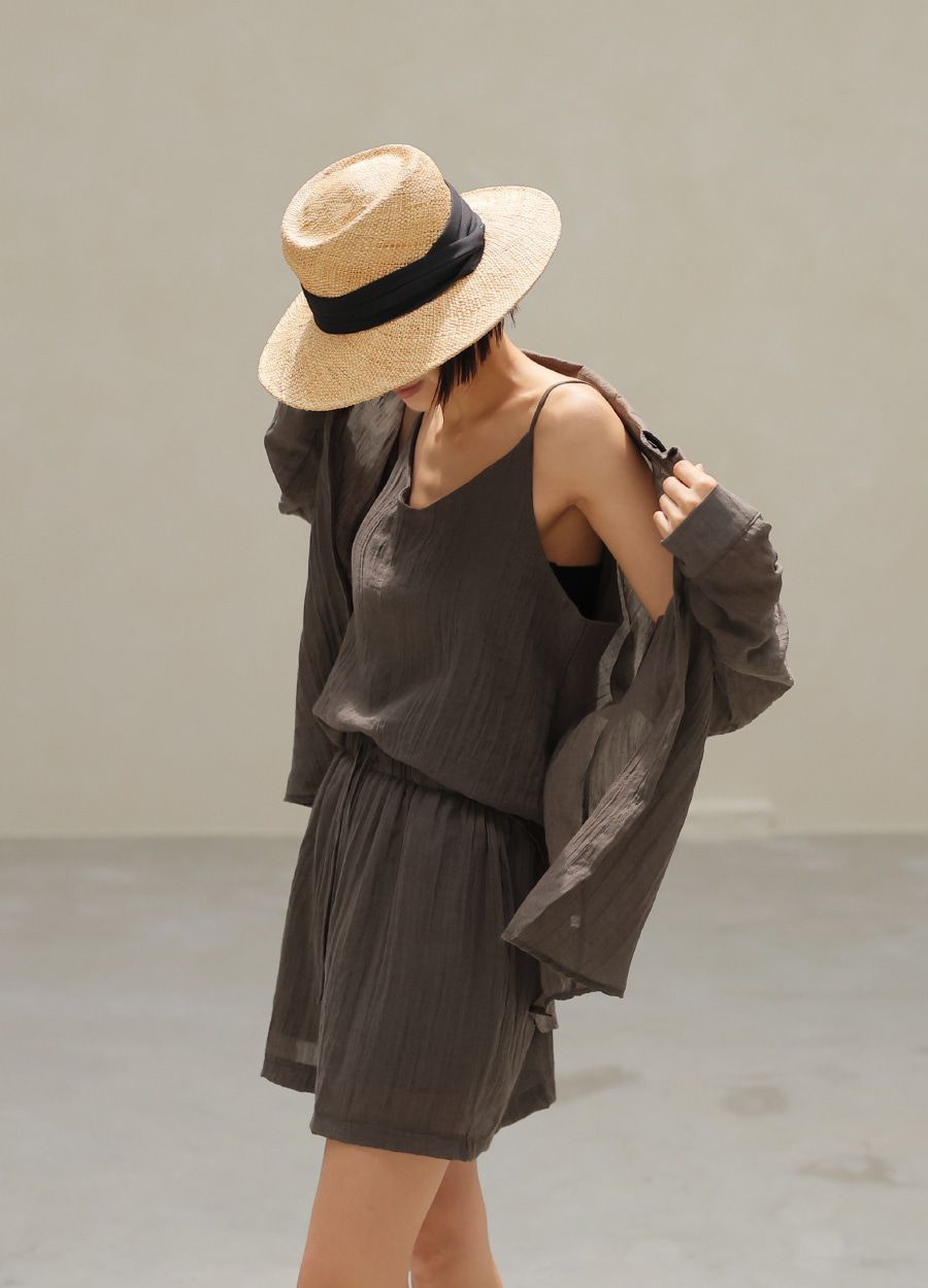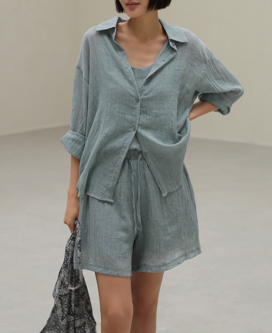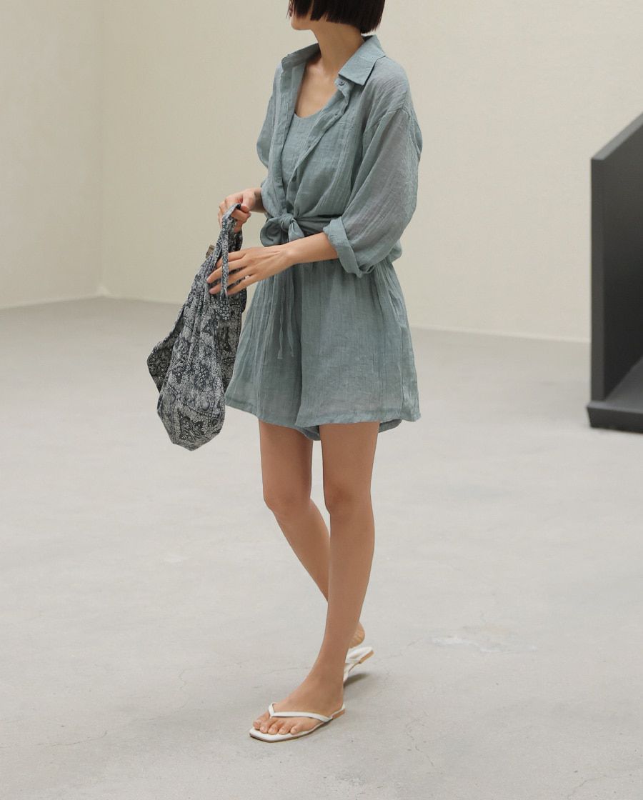 這款亞麻三件套裝 是夏天衣櫃裡最值得擁有的一組 輕盈、俐落又充滿呼吸感 由吊帶背心、長袖襯衫外套 以及素面短褲組成 一套就能輕鬆解決「今天要穿什麼」的煩惱! - 亞麻混棉的布料透氣又柔軟 穿上身有種自然的涼感 帶著一點慵懶的波紋質地 更增添了生活的時尚氣息~ 吊帶背心單穿就很俐落性感 而且可以正 / 反兩穿實在很貼心~ 加上長袖外套一罩瞬間變得氣質又不失自在 綁在腰間更顯歐系女孩的自在俐落 短褲鬆緊腰設計讓比例更修長,活動也超舒適 - 適合散步的午後、出遊的假日 或咖啡廳裡的微風午後 這套衣服都能讓你看起來自然又有品味~ 隨手一穿就像度假回來一樣放鬆