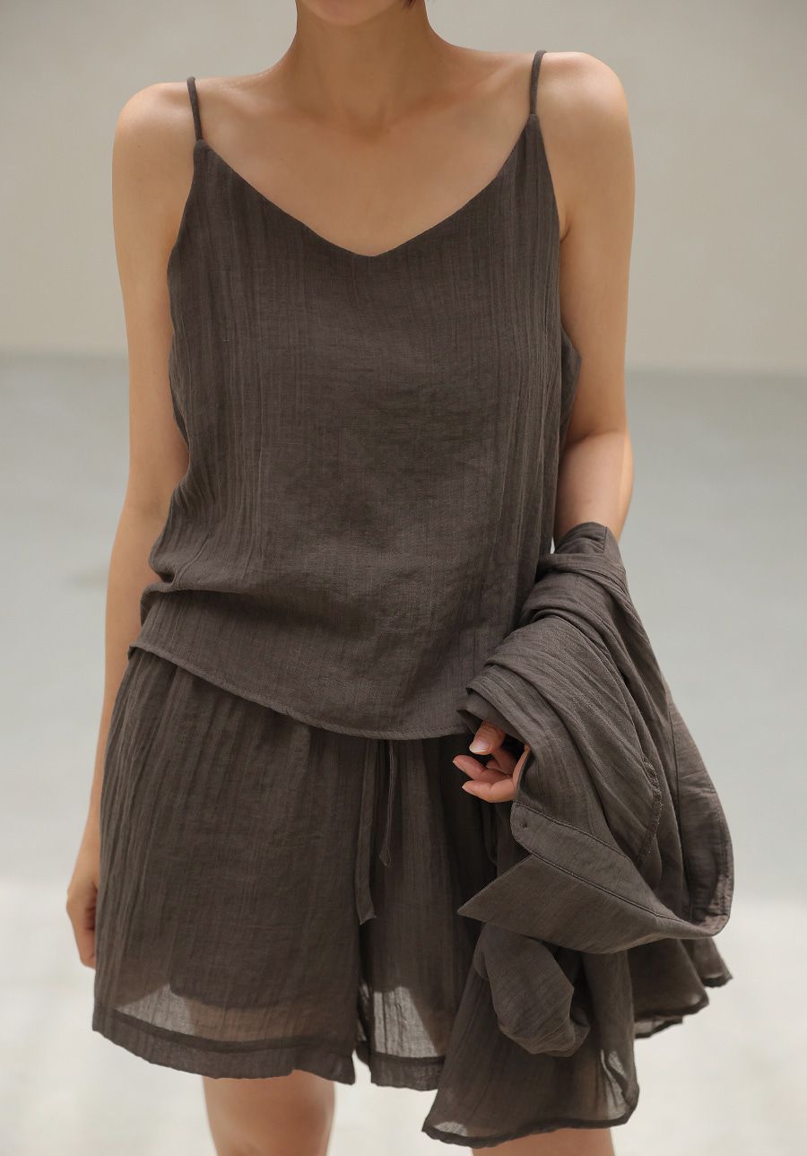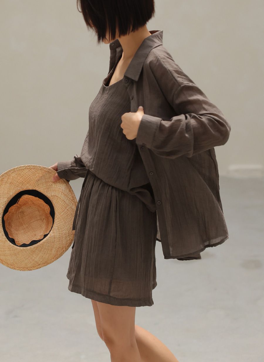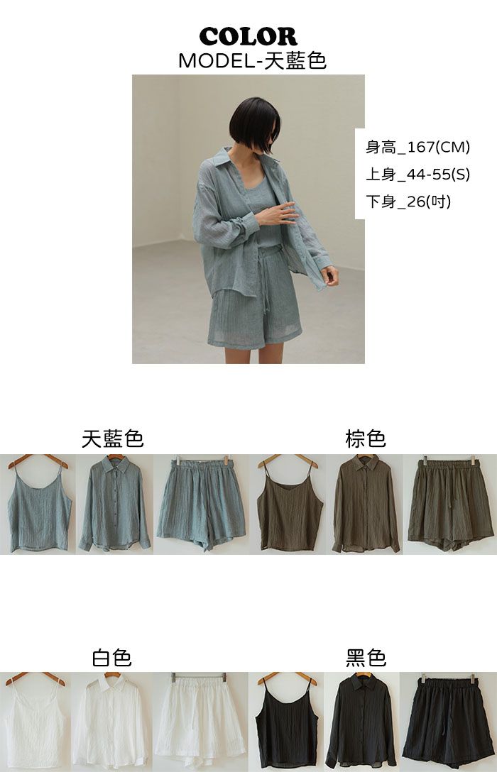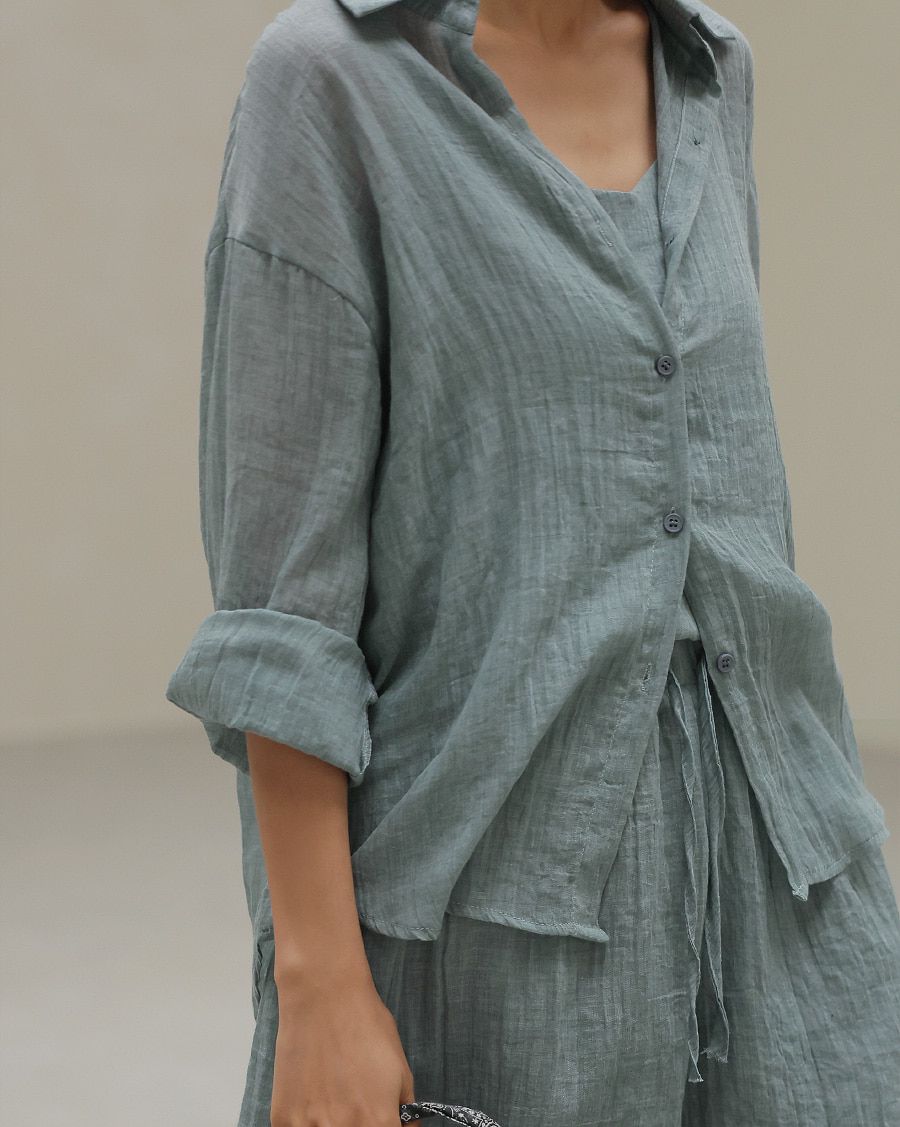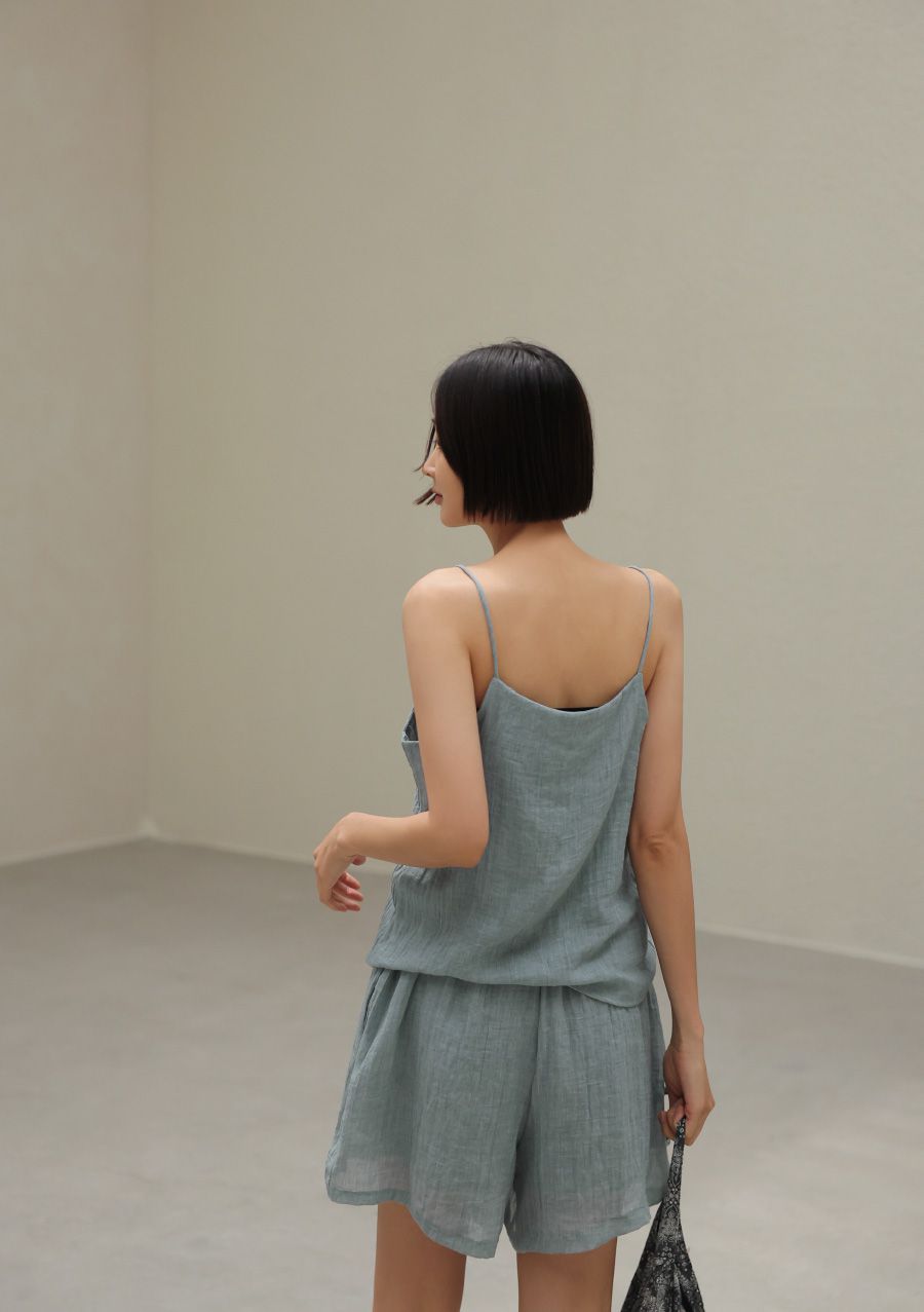 這款亞麻三件套裝 是夏天衣櫃裡最值得擁有的一組 輕盈、俐落又充滿呼吸感 由吊帶背心、長袖襯衫外套 以及素面短褲組成 一套就能輕鬆解決「今天要穿什麼」的煩惱! - 亞麻混棉的布料透氣又柔軟 穿上身有種自然的涼感 帶著一點慵懶的波紋質地 更增添了生活的時尚氣息~ 吊帶背心單穿就很俐落性感 而且可以正 / 反兩穿實在很貼心~ 加上長袖外套一罩瞬間變得氣質又不失自在 綁在腰間更顯歐系女孩的自在俐落 短褲鬆緊腰設計讓比例更修長,活動也超舒適 - 適合散步的午後、出遊的假日 或咖啡廳裡的微風午後 這套衣服都能讓你看起來自然又有品味~ 隨手一穿就像度假回來一樣放鬆