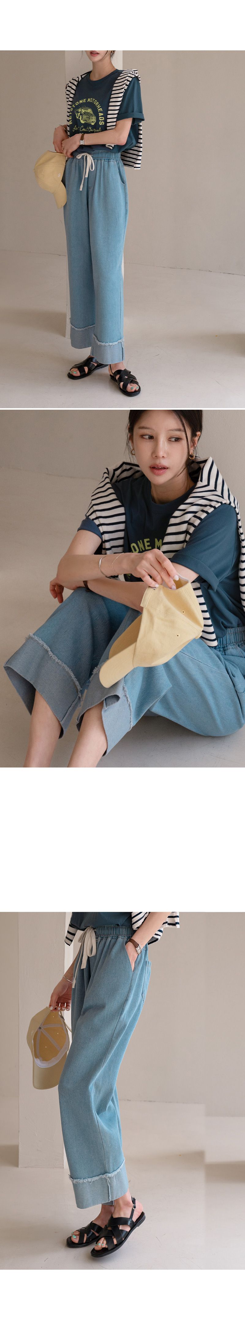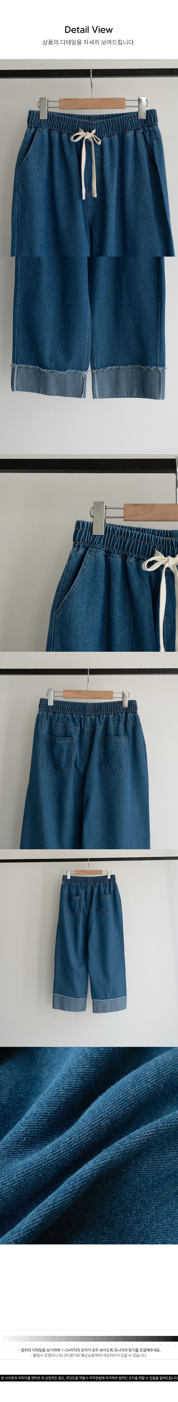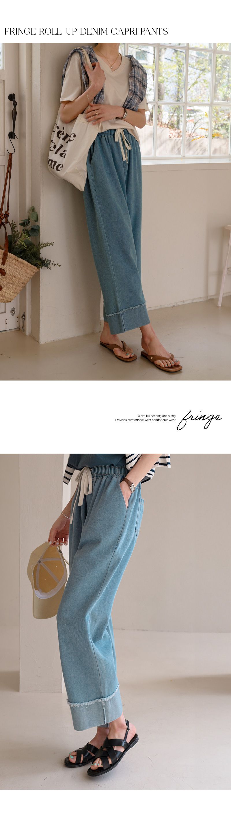 【C54984】韓國CAN 流蘇捲邊牛仔褲-素面抽繩腰反摺褲腳直筒九分褲★★