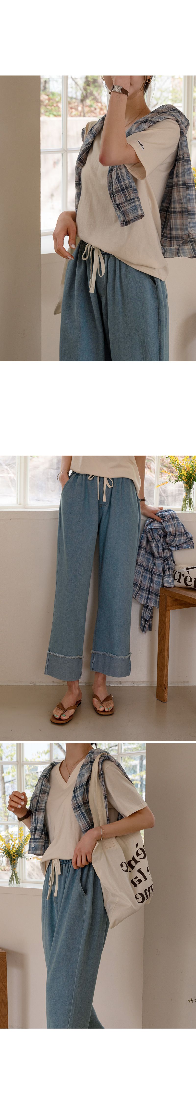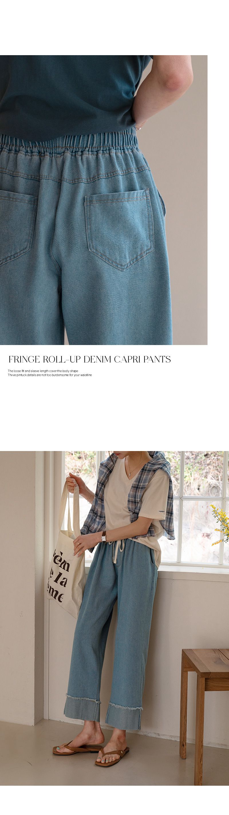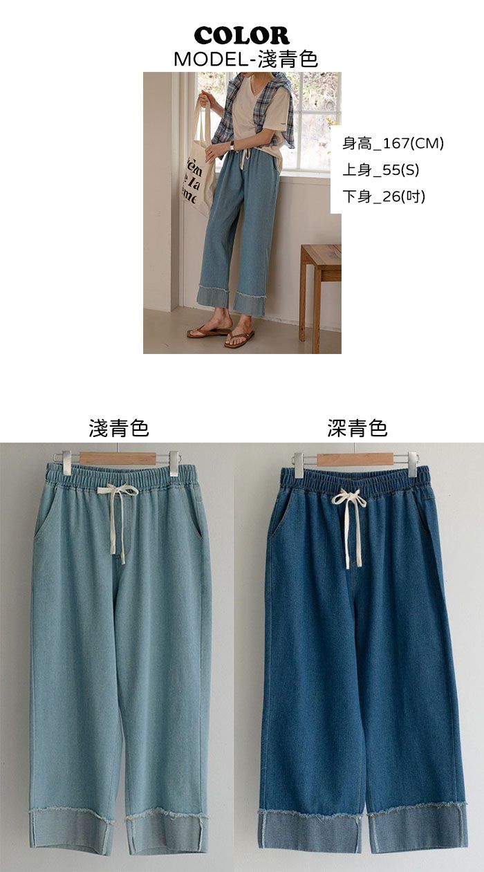 抽繩鬆緊腰/反摺褲腳(固定)/褲腳刷破鬚邊/復古抽鬚/雙口袋 - 休閒居家渡假簡約百搭素面流蘇捲邊牛仔褲直筒褲九分褲九分牛仔褲寬褲淺青色深青色