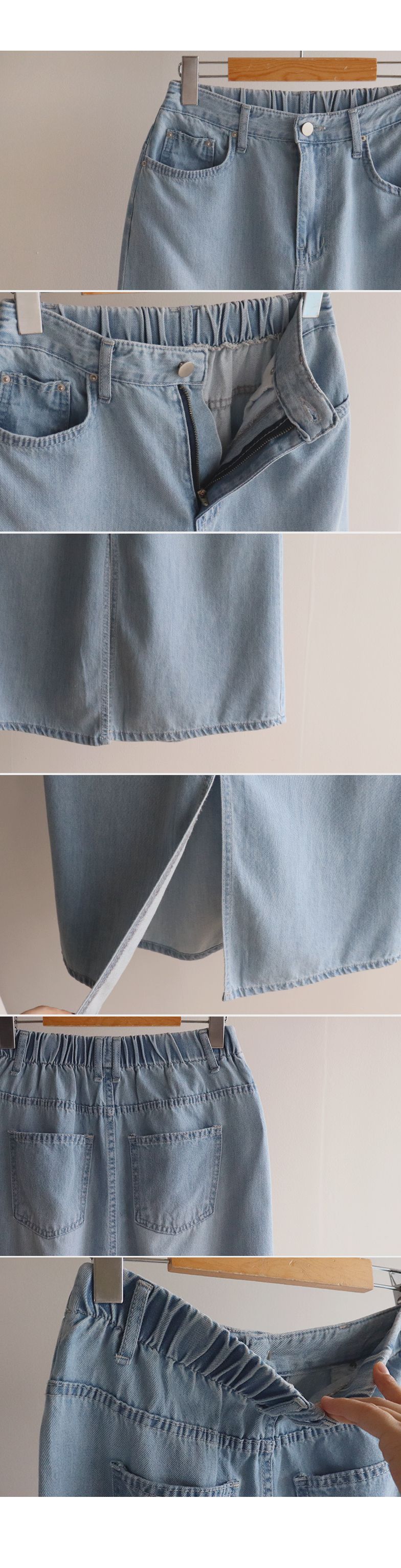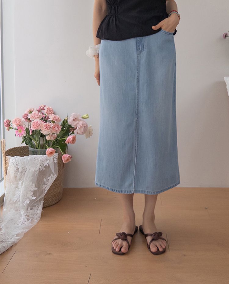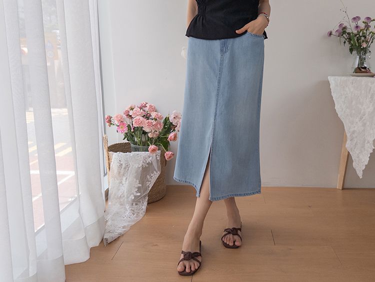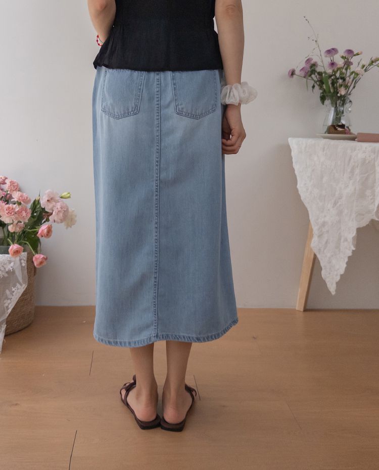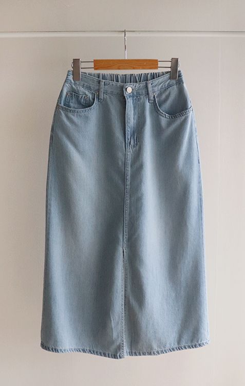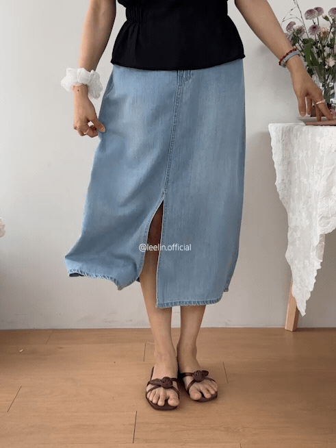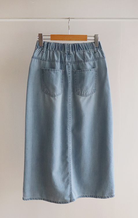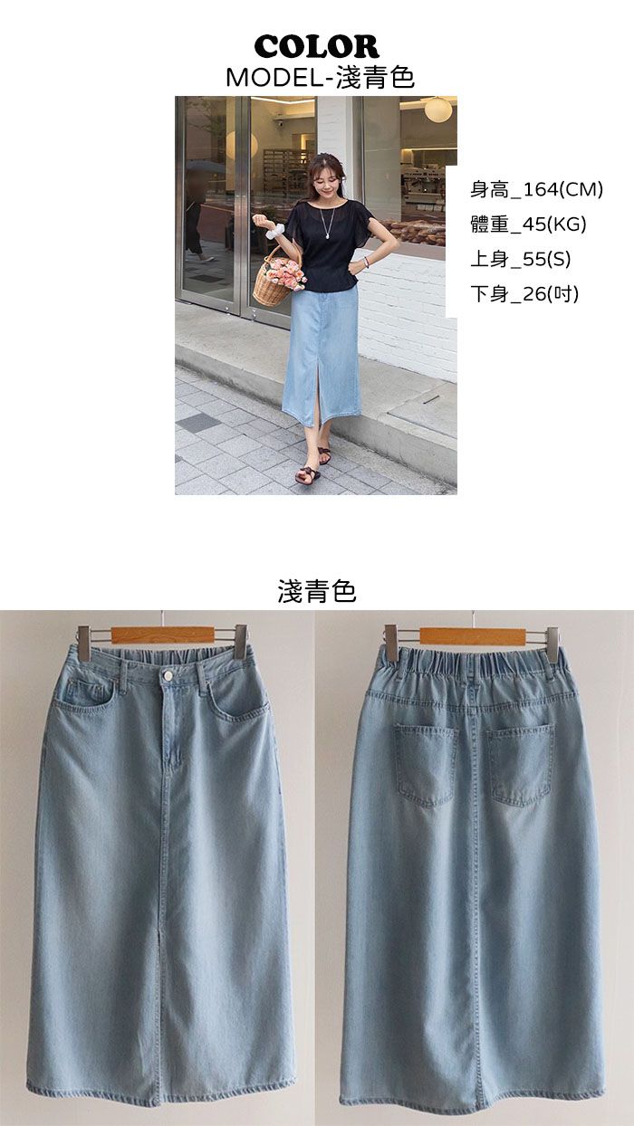 【C55004】韓國LEE 輕薄牛仔裙-素面柔軟水洗棉後腰鬆緊前開衩裙子★★