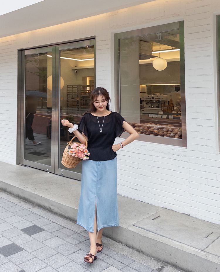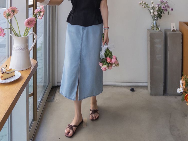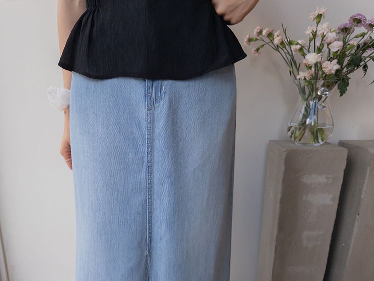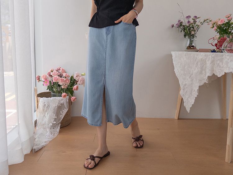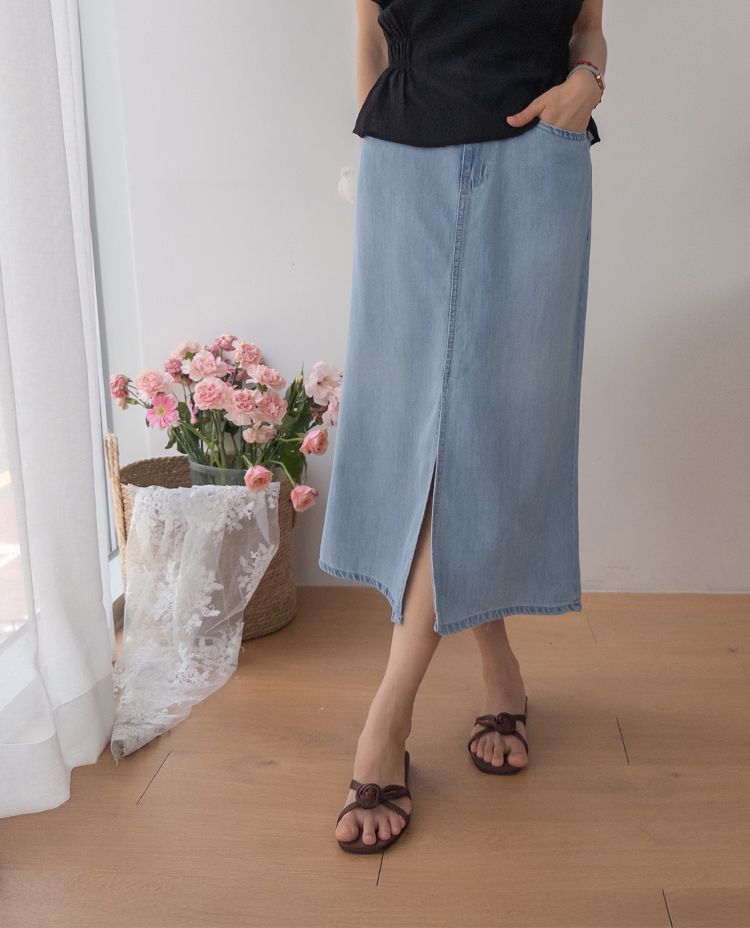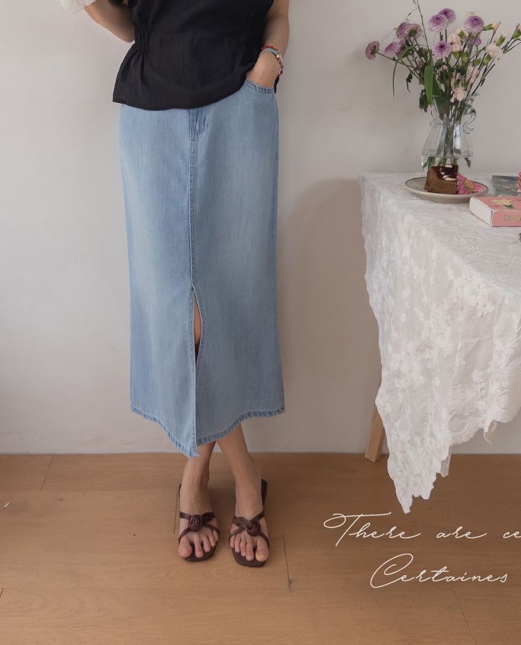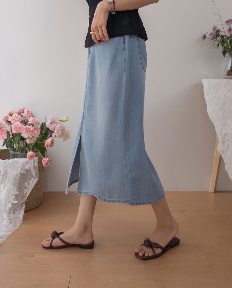 【C55004】韓國LEE 輕薄牛仔裙-素面柔軟水洗棉後腰鬆緊前開衩裙子★★