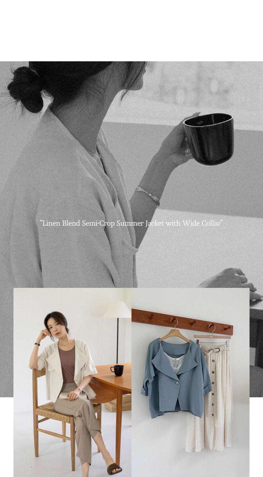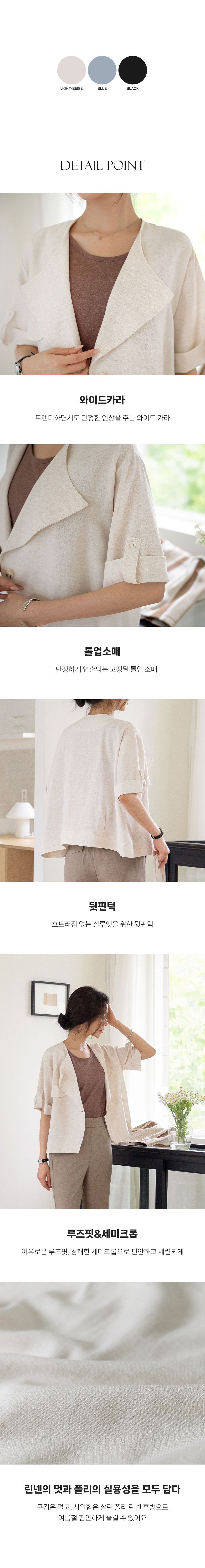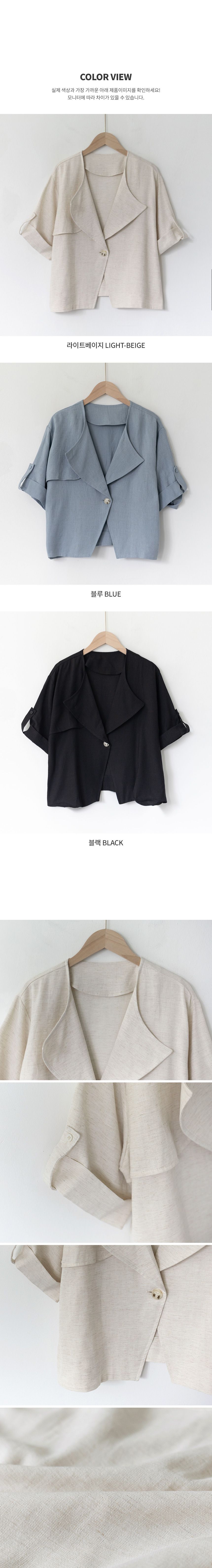 翻領/V領/開襟排釦/單釦/袖絆捲袖/反摺袖(固定)/單側擋片/無口袋/混亞麻 - 休閒居家渡假簡約百搭素面捲袖翻領外套-素面單釦V領袖絆反褶五分袖夾克淺米色黑色天藍色