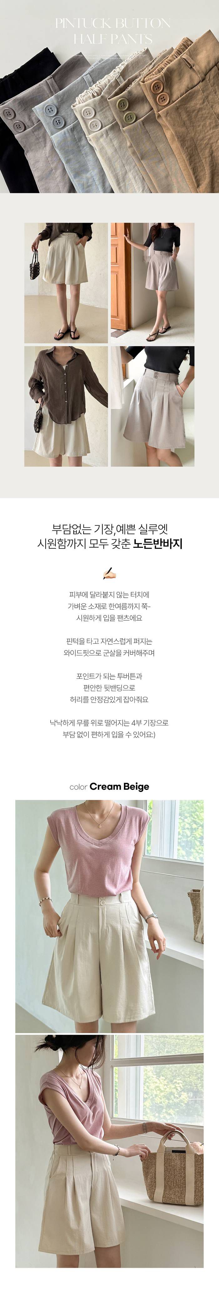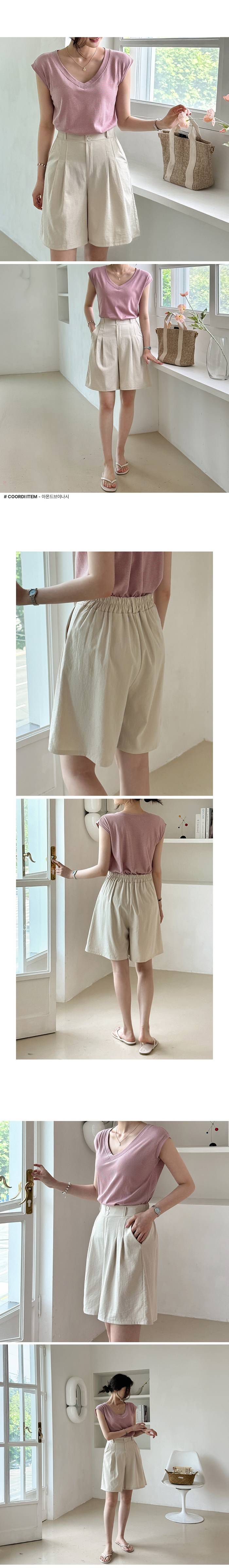 雙釦造型/假褲頭/後腰半圈鬆緊/A字短褲/雙口袋 - 休閒居家渡假簡約百搭素面雙車褶短褲/後腰鬆緊休閒褲奶油色駝色灰米色米色天藍色黑色