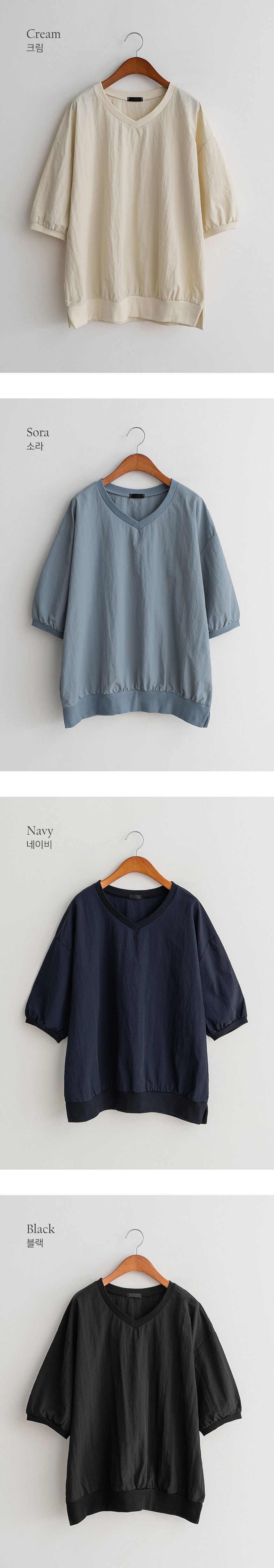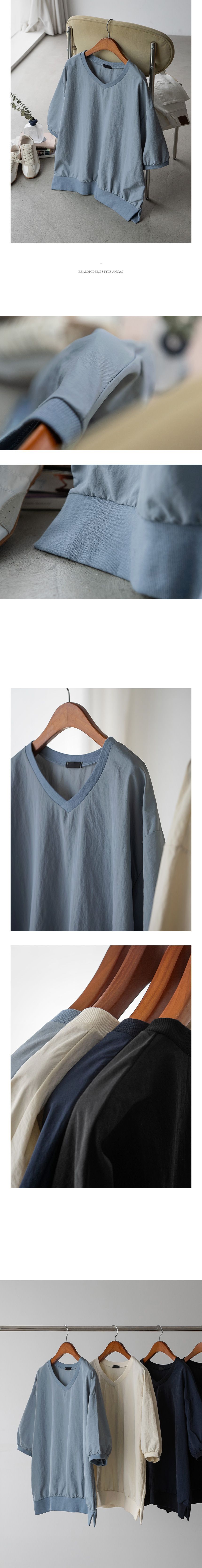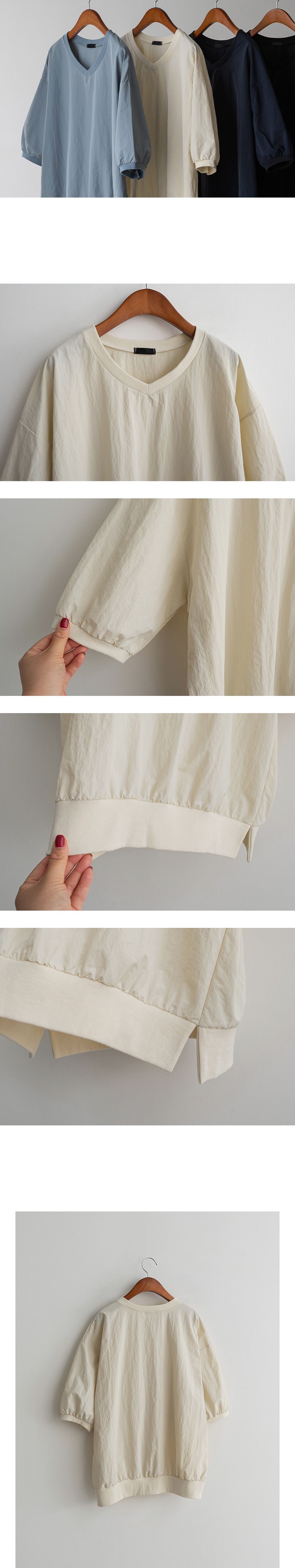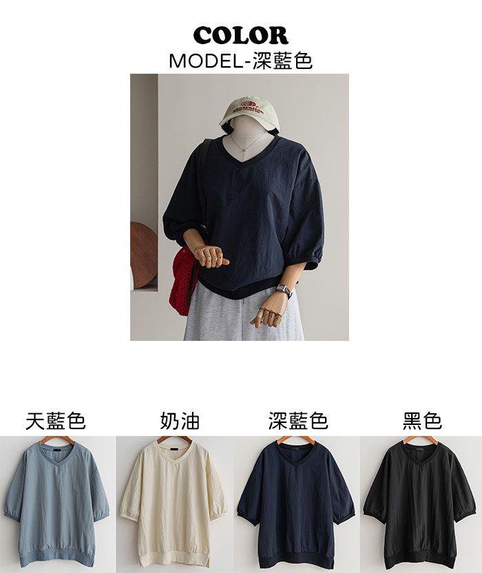 輕尼龍面料/輕盈無重量/V領/側開衩/寬鬆長版/落肩寬袖 - 休閒居家簡約百搭素面寬鬆大尺碼上衣七分袖上衣天藍色奶油色深藍色黑色