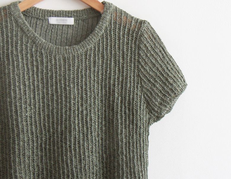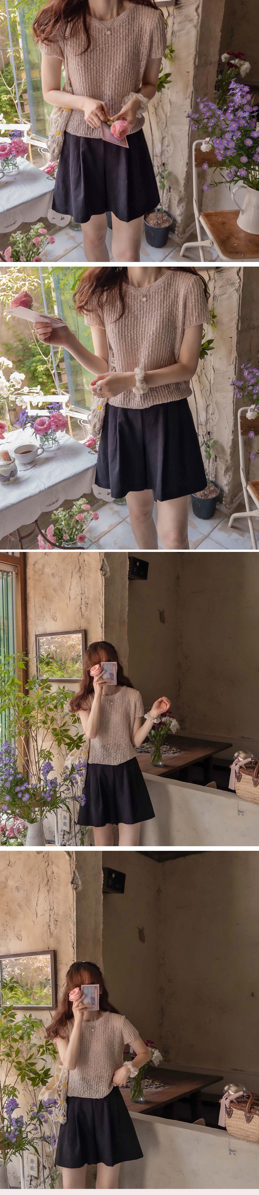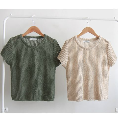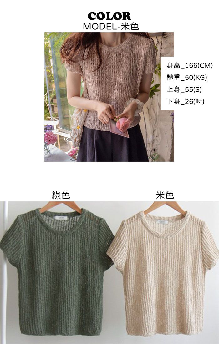 輕薄涼感混亞麻/圓領/合身/洞洞裝 - 休閒居家簡約百搭素面蜂巢洞洞針織衫針織上衣短袖上衣鉤針編織米色綠色